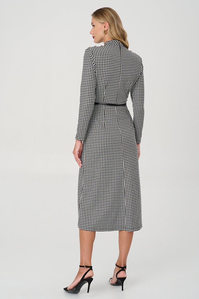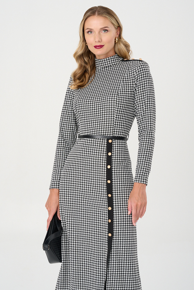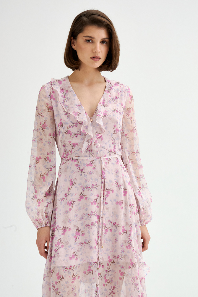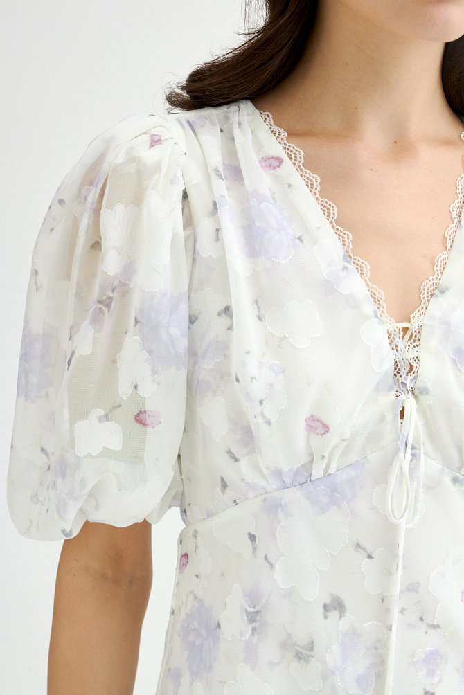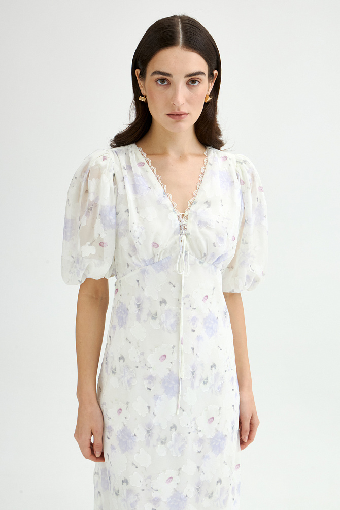 Платье из фактурного хлопкового кружева с пышной юбкой и отрезной талией, дополненной кожаным ремнем. Особенности модели — акцентный воротник-бант, пышные рукава с манжетами и металлические пуговицы с эмалью. Высококачественные материалы и фурнитура подчеркивают утонченность и элегантность изделия. В комплекте — атласная комбинация и кожаный ремень с золотой пряжкой. Идеальный универсальный вариант, который подойдет как для повседневного образа, так и для особых случаев.