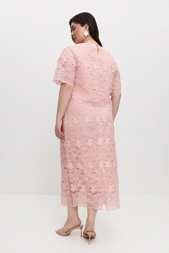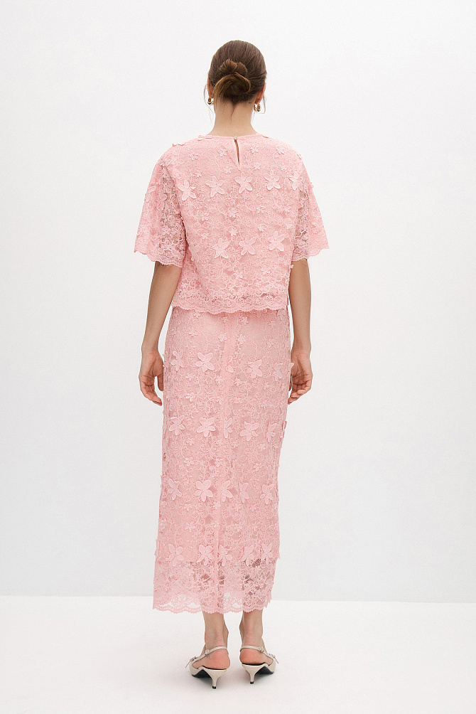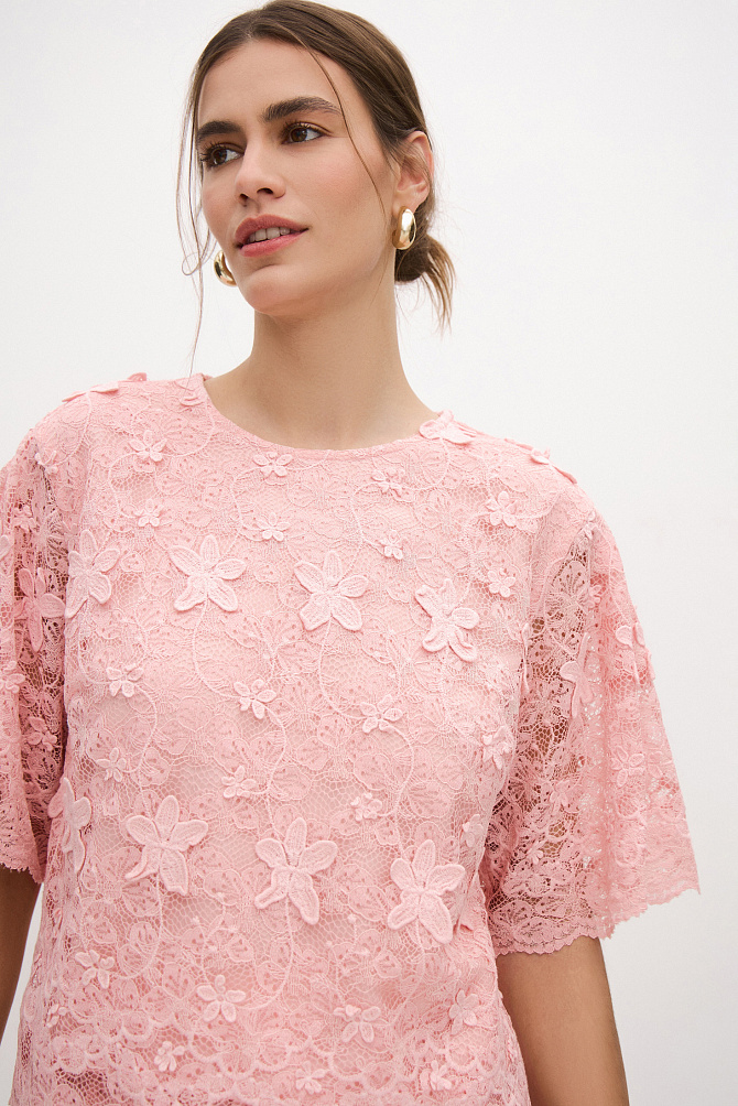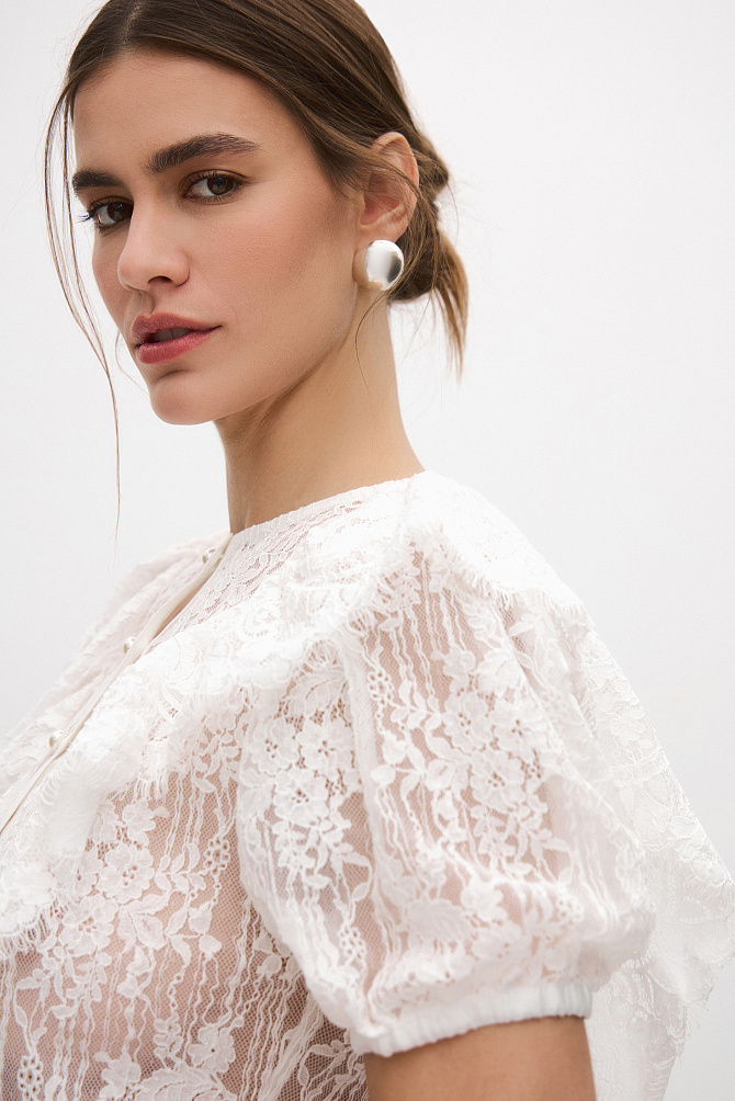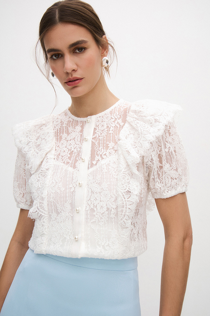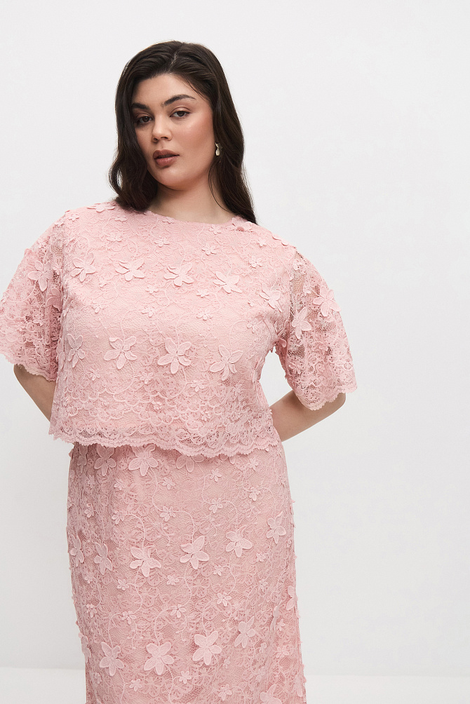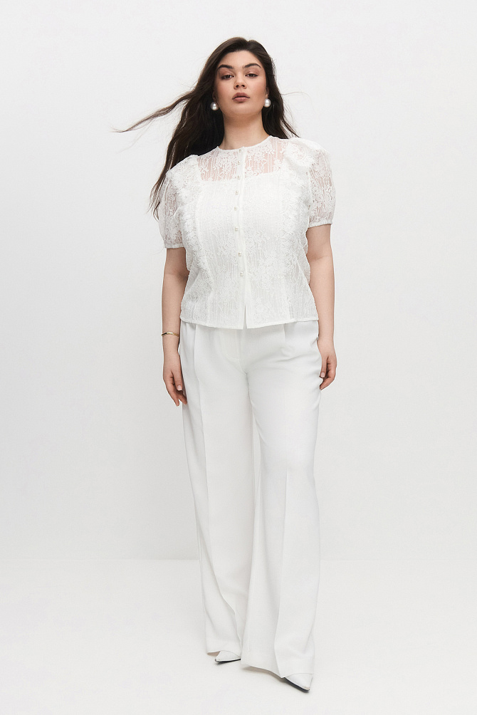 Элегантный лонгслив из тонкого кружева, украшенный фестонами по краю воротника-стойки. Полуприлегающий силуэт подчеркивает фигуру, сохраняя утонченность, а потайная молния на спинке обеспечивает идеальную посадку. В комплекте: топ-подкладка из нежного тенселя.