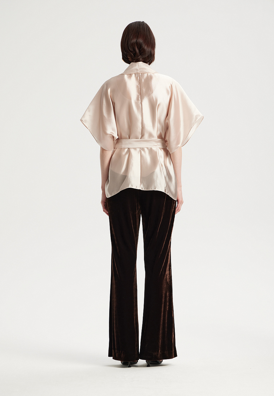 Свежий альтернативный образ для особых случаев можно создать с этой нарядной блузой из полупрозрачной органзы с глянцевым эффектом.Простой и лаконичный крой по принципу блузы-пончо с мягким воротником-шалькой и фиксирующийся поясом создает очень эффектный и дорогой аутфит в комбинации с праздничными брюками или платьем комбинацией, которые вы также подберете из нашего ассортимента. Такая блуза выручит вас в любой ситуации,когда нужно что-то накинуть поверх торжественного платья или топа, а также послужит самостоятельным вариантом для праздничного вечера.