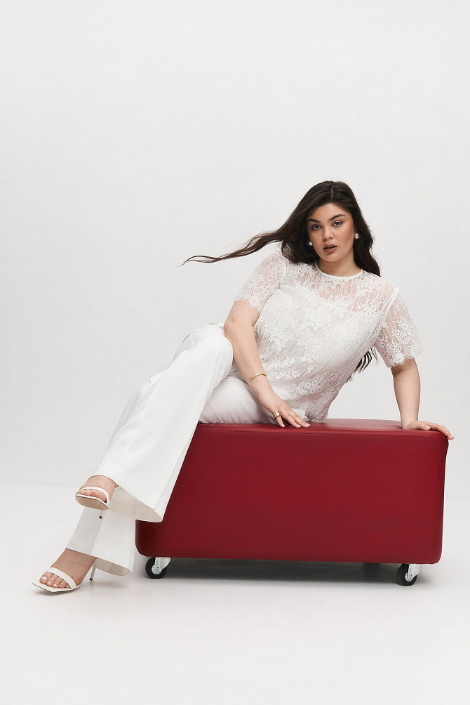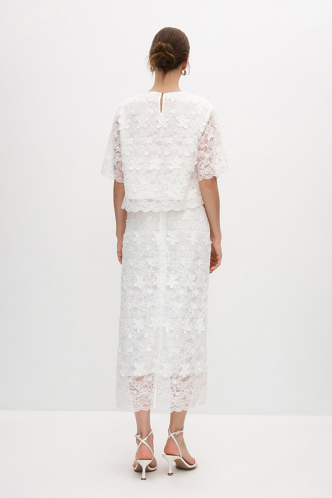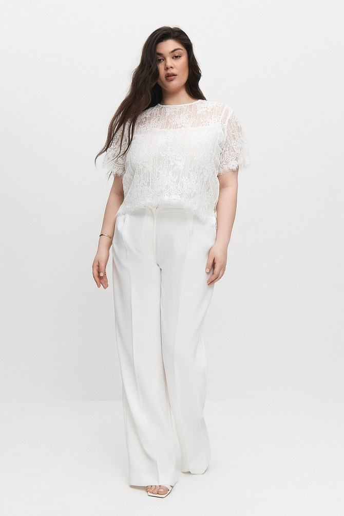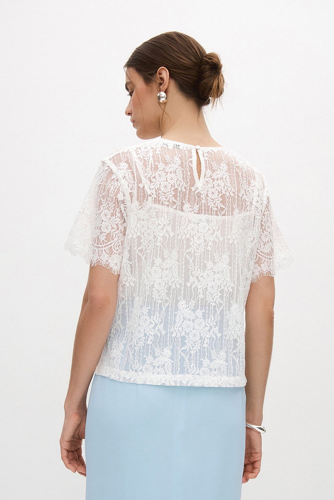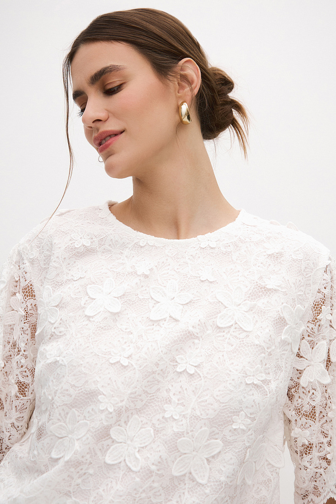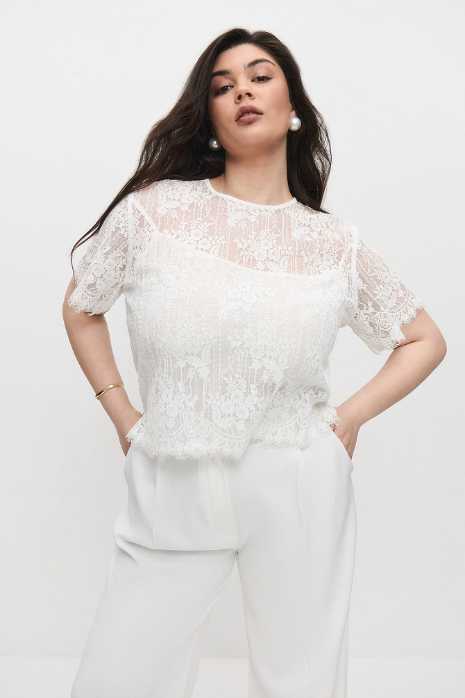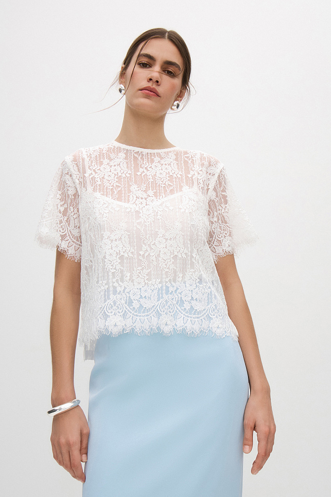 Блузка из хлопкового кружева с фестончатыми краями и декоративным жабо. Модель полуприлегающего силуэта с рукавами на резинке. Контрастная планка и воротник выполнены из гладкой ткани. В комплекте — топ на тонких бретелях из мягкого тенселя.