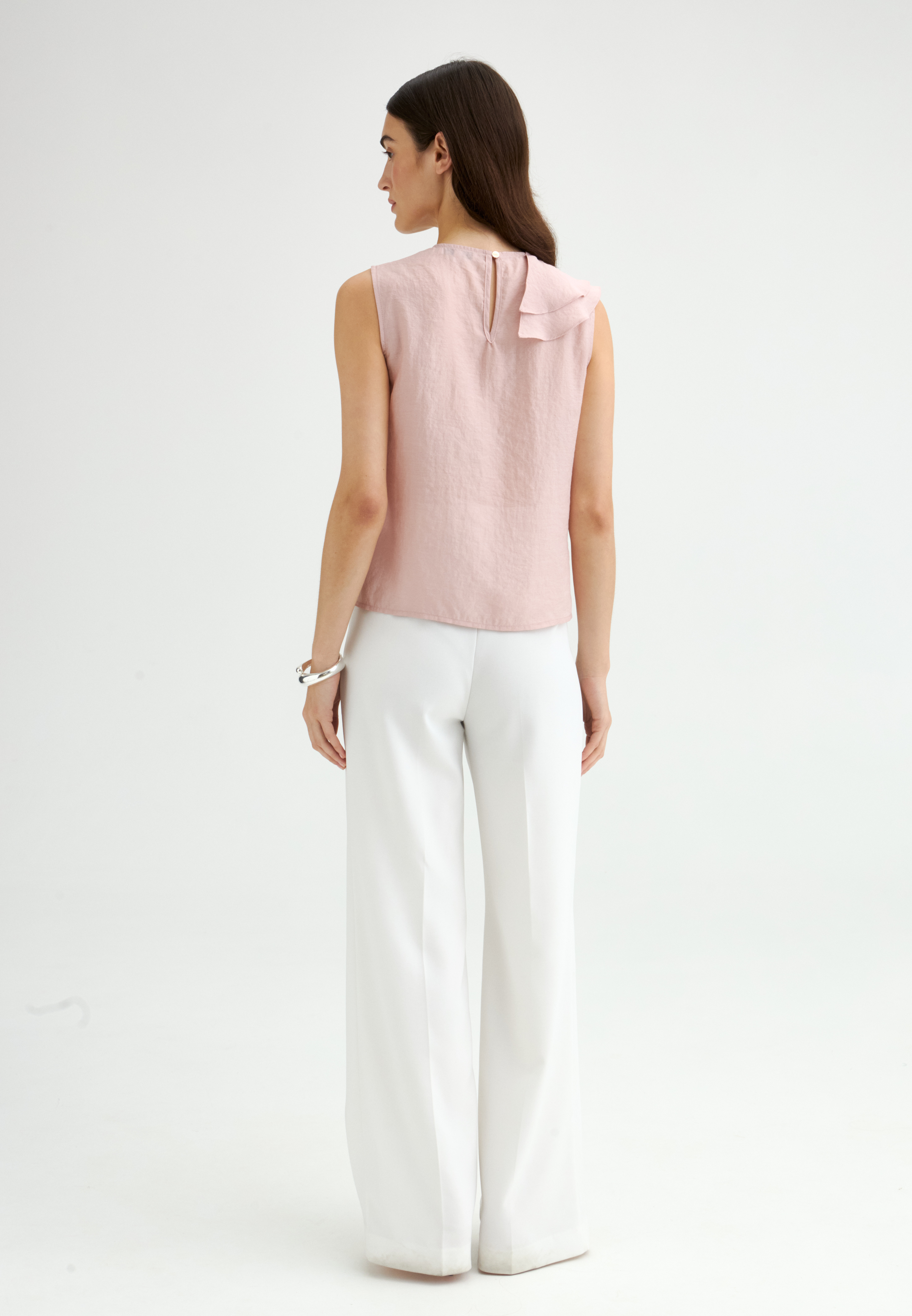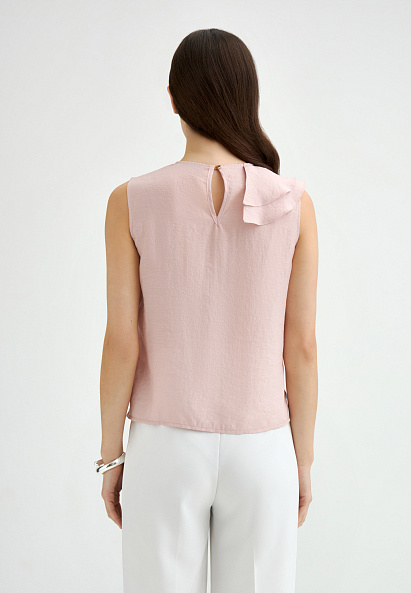 Эффектный топ из крепового шифона прямого силуэта с асимметрично расположенными воланами на полочке. Смесовый состав из района и ацетата делает ткань легкой, полупрозрачной и приятной на ощупь. Топ с застежкой на пуговицу на спинке, маленькими разрезами по бокам и круглым вырезом. Асимметричный край воланов оформлен фурнитурой в виде сердца.