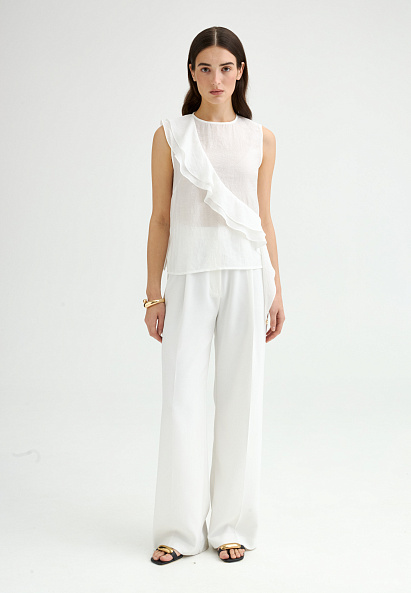 Эффектный топ из крепового шифона прямого силуэта с асимметрично расположенными воланами на полочке. Смесовый состав из района и ацетата делает ткань легкой, полупрозрачной и приятной на ощупь. Топ с застежкой на пуговицу на спинке, маленькими разрезами по бокам и круглым вырезом. Асимметричный край воланов оформлен фурнитурой в виде сердца.