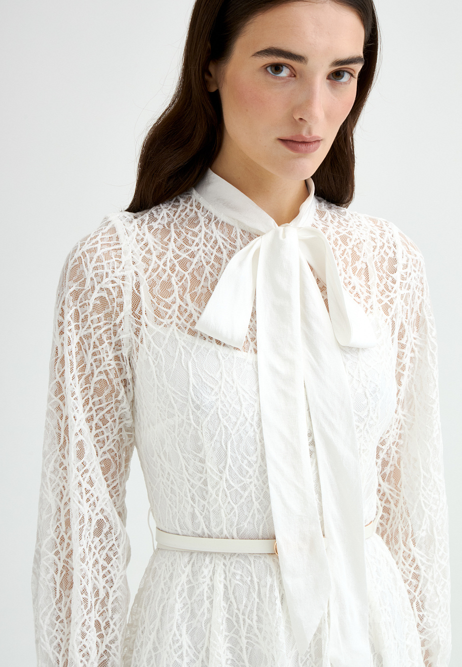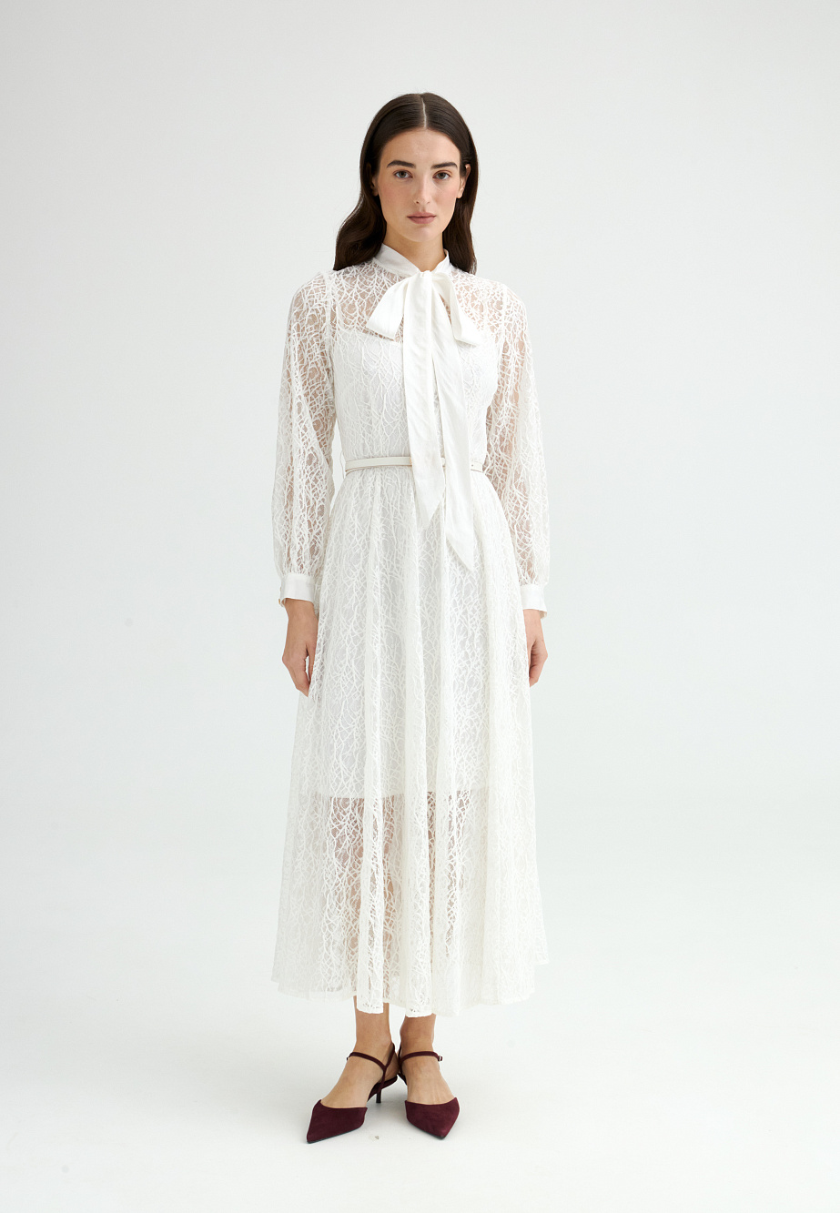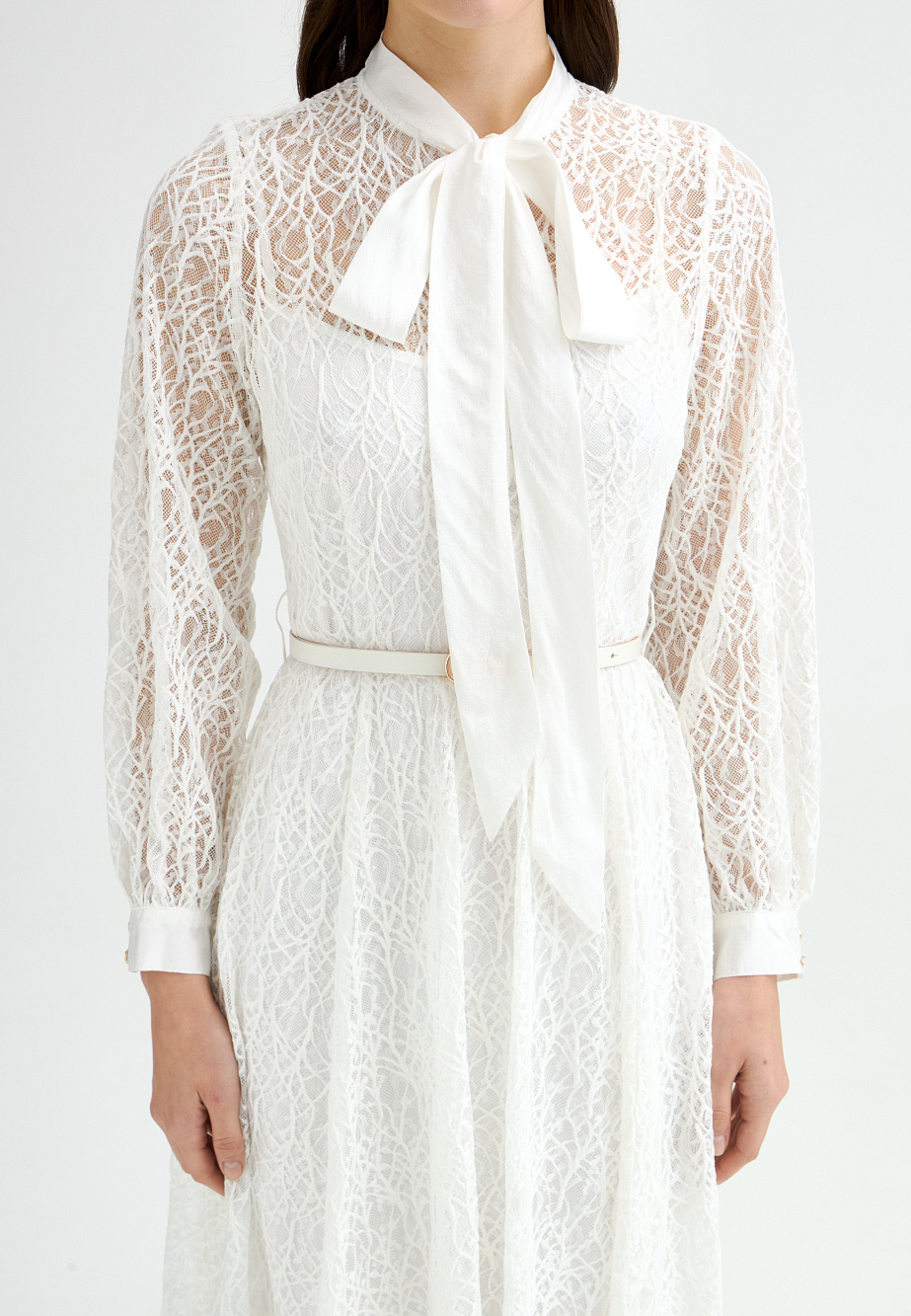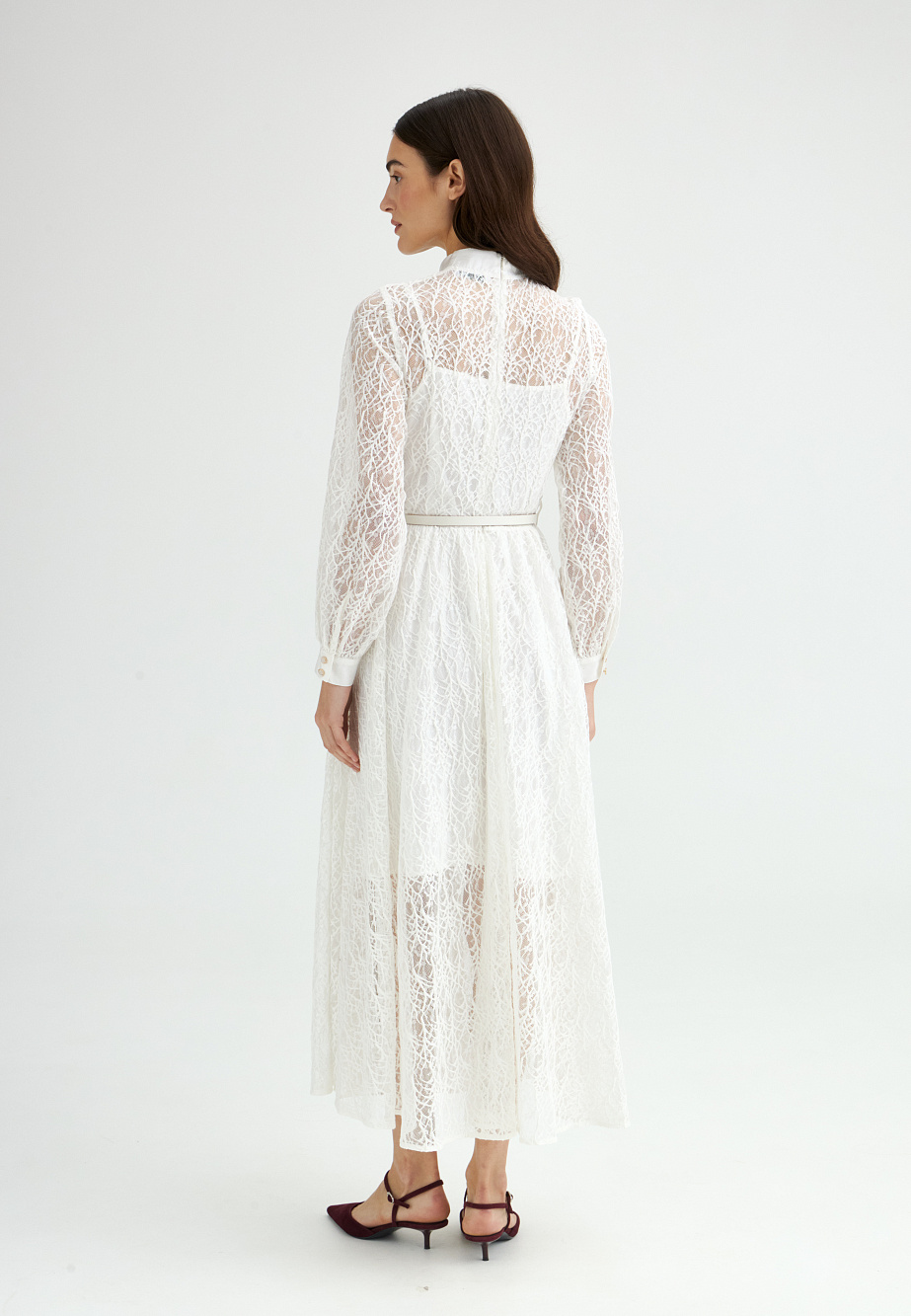 Платье из фактурного хлопкового кружева с пышной юбкой и отрезной талией, дополненной кожаным ремнем. Особенности модели — акцентный воротник-бант, пышные рукава с манжетами и металлические пуговицы с эмалью. Высококачественные материалы и фурнитура подчеркивают утонченность и элегантность изделия. В комплекте — атласная комбинация и кожаный ремень с золотой пряжкой. Идеальный универсальный вариант, который подойдет как для повседневного образа, так и для особых случаев.