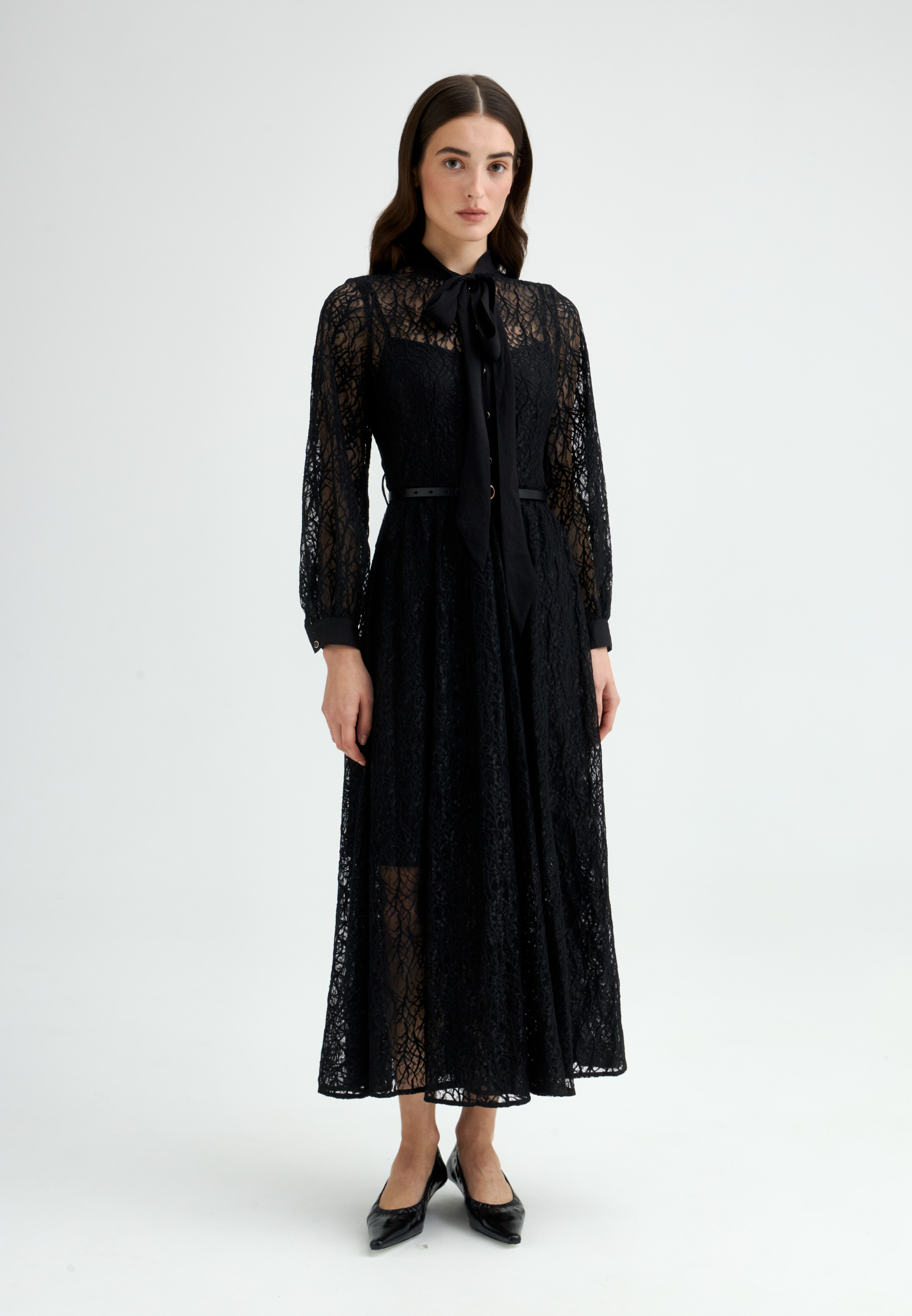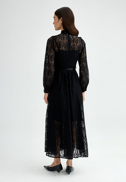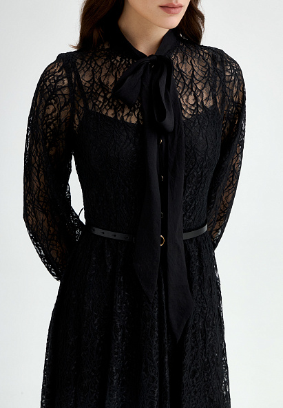 Платье из фактурного хлопкового кружева с пышной юбкой и отрезной талией, дополненной кожаным ремнем. Особенности модели — акцентный воротник-бант, пышные рукава с манжетами и металлические пуговицы с эмалью. Высококачественные материалы и фурнитура подчеркивают утонченность и элегантность изделия. В комплекте — атласная комбинация и кожаный ремень с золотой пряжкой. Идеальный универсальный вариант, который подойдет как для повседневного образа, так и для особых случаев.