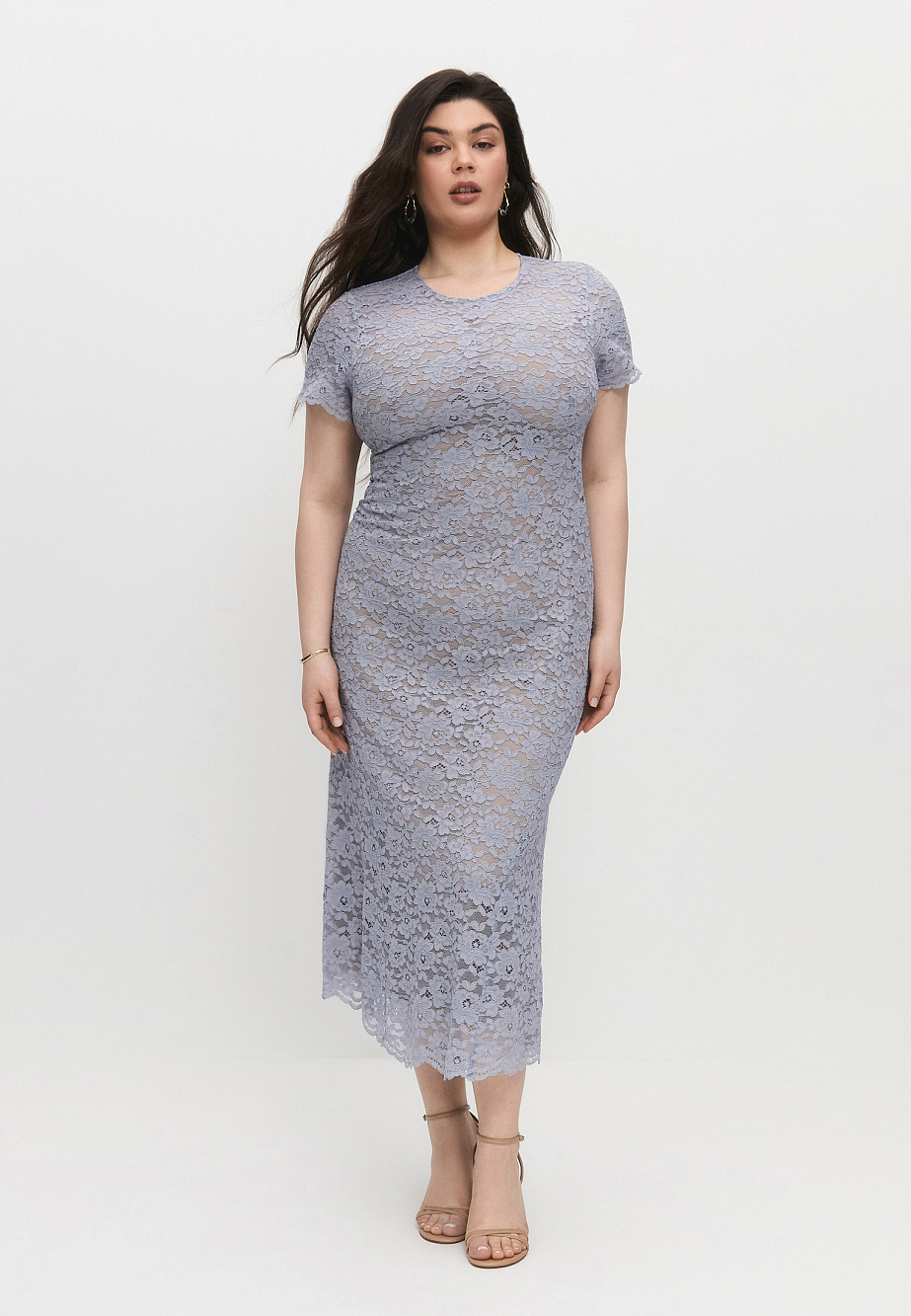 Лаконичное платье из хлопкового фактурного кружева с коротким рукавом и расклешенным книзу силуэтом. Рукава и низ платья заканчиваются изящными фестонами кружева. Фигурный подрез по низу платья позволяет добиться равномерного и красивого расклешения в мягкие изящные фалды. Платье с трикотажной подкладкой из района.