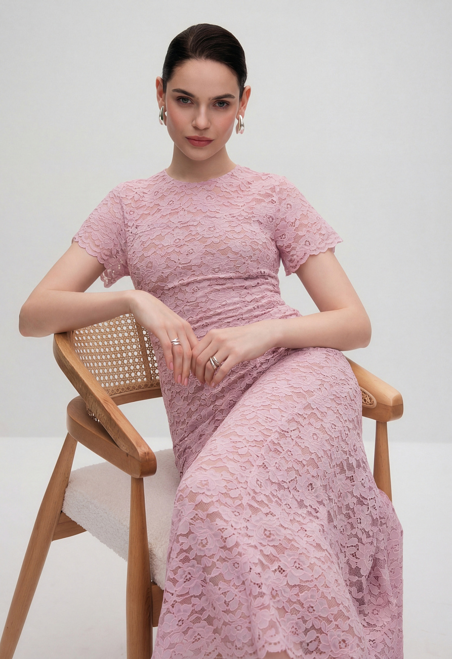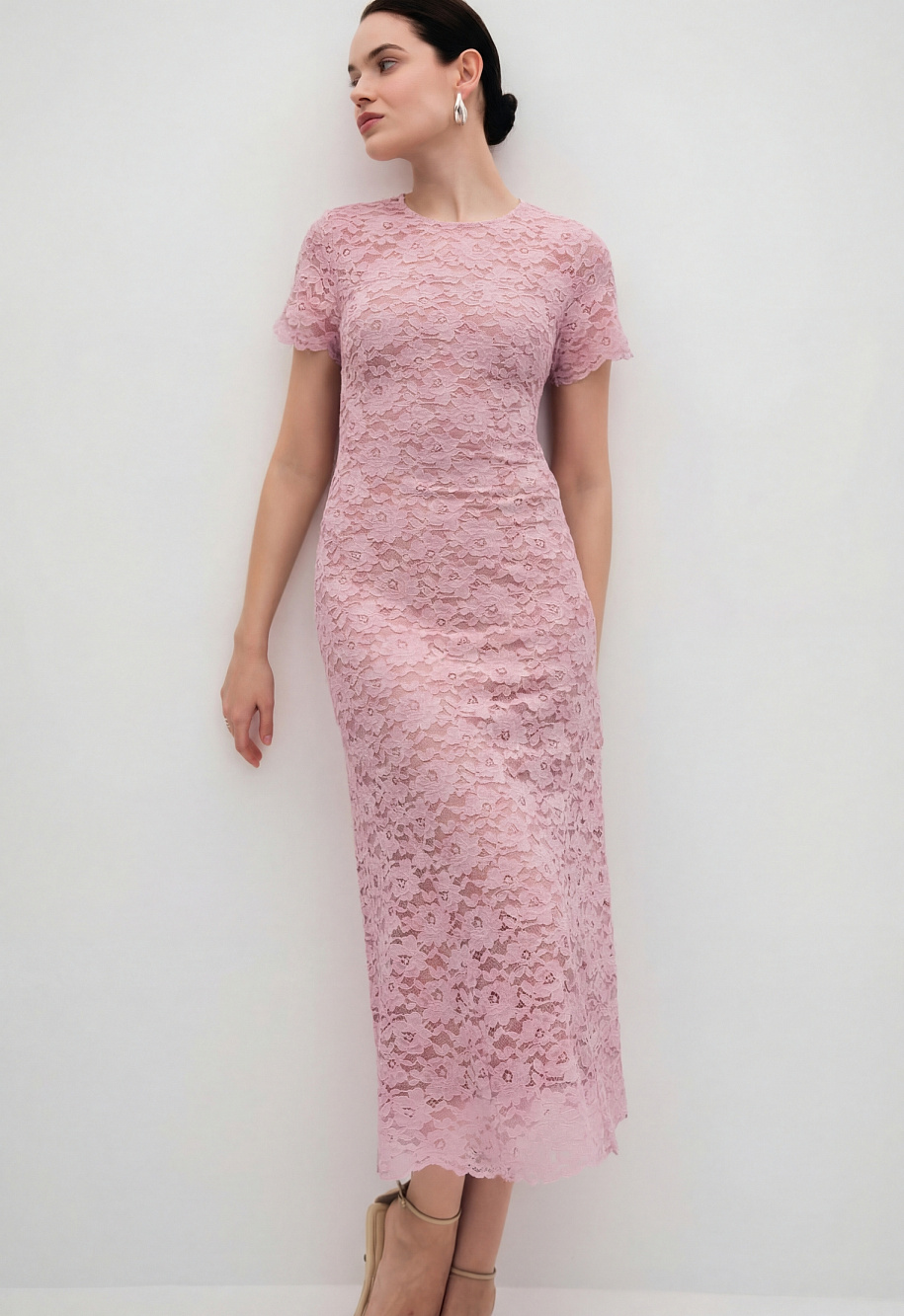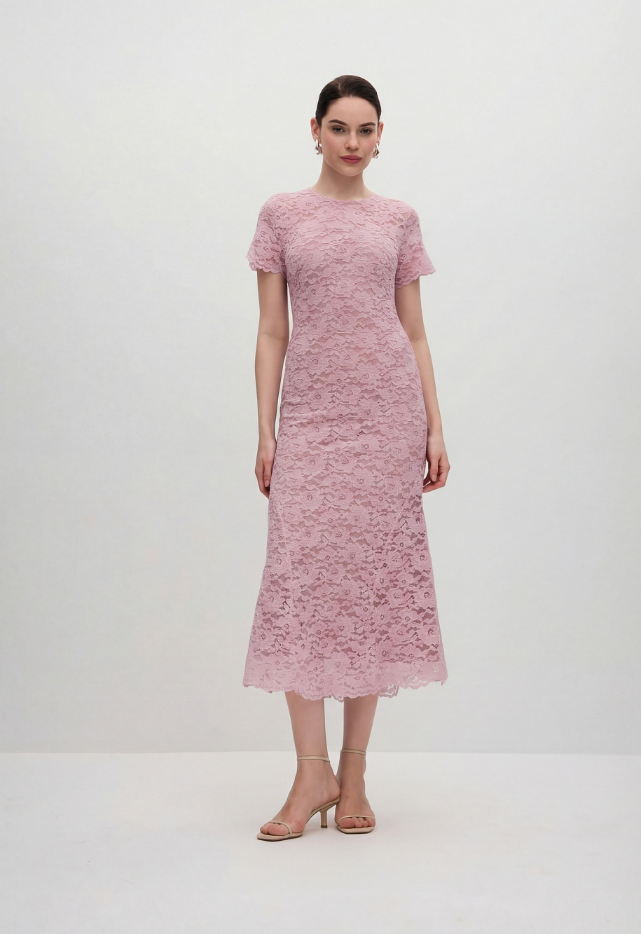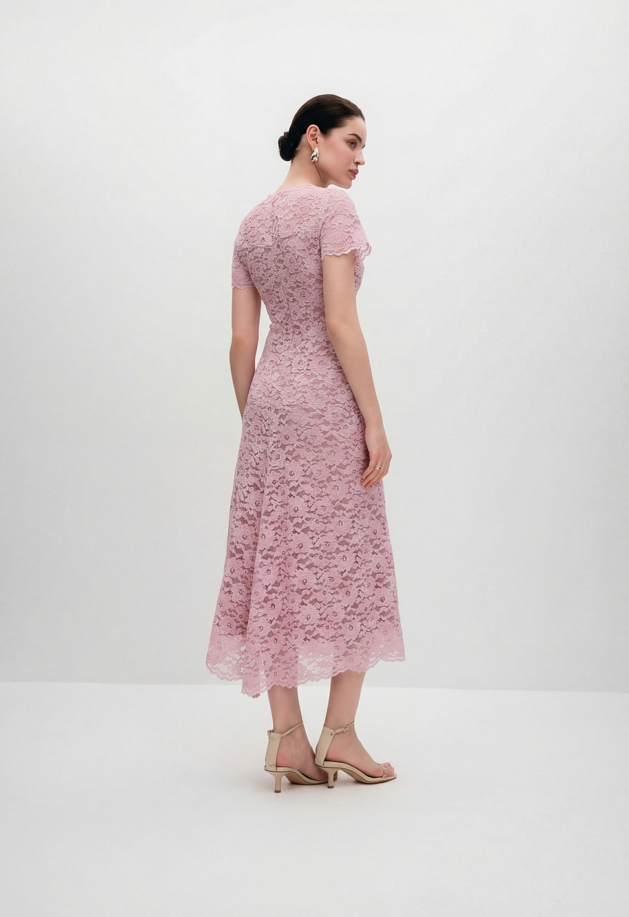 Лаконичное платье из хлопкового фактурного кружева с коротким рукавом и расклешенным книзу силуэтом. Рукава и низ платья заканчиваются изящными фестонами кружева. Фигурный подрез по низу платья позволяет добиться равномерного и красивого расклешения в мягкие изящные фалды. Платье с трикотажной подкладкой из района.
