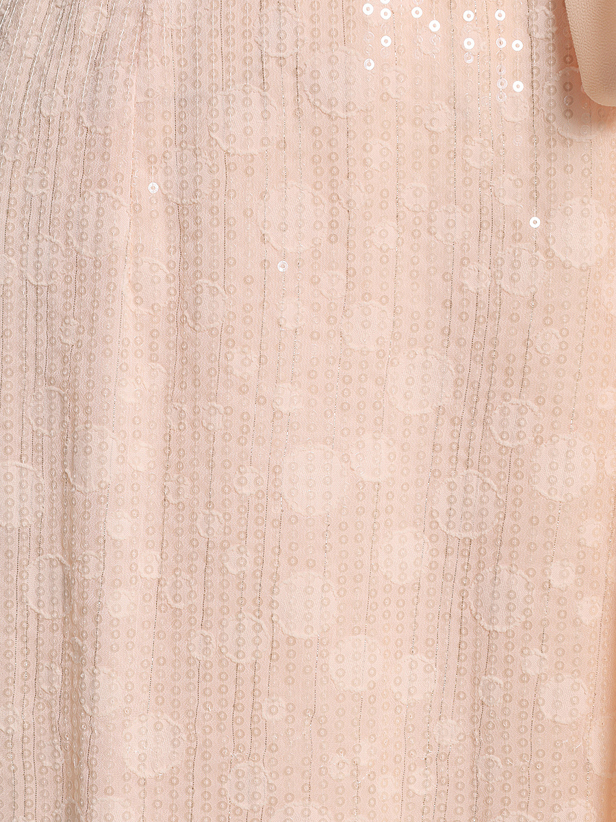 Платье-футляр из жаккардового шифона с прозрачными пайетками, отрезное по линии талии, лаконичного прямого силуэта. Круглый вырез, цельнокроенный рукав с глубокой проймой до линии талии, разрез по низу среднего шва спинки, потайная молния в боковом шве. Талия подчеркнута текстильным поясом в цвет платья, по желанию его можно заменить ремнем-цепочкой или тонким кожаным ремнем в цвет. Во избежании соприкосновения пайеток с телом, швы окантованы. Изысканная фактура ткани создает выразительный образ. Длина от линии талии 88см.