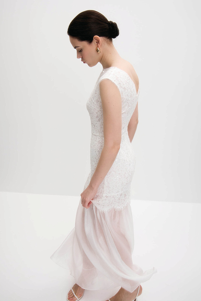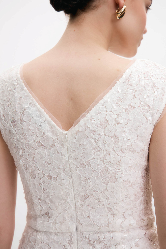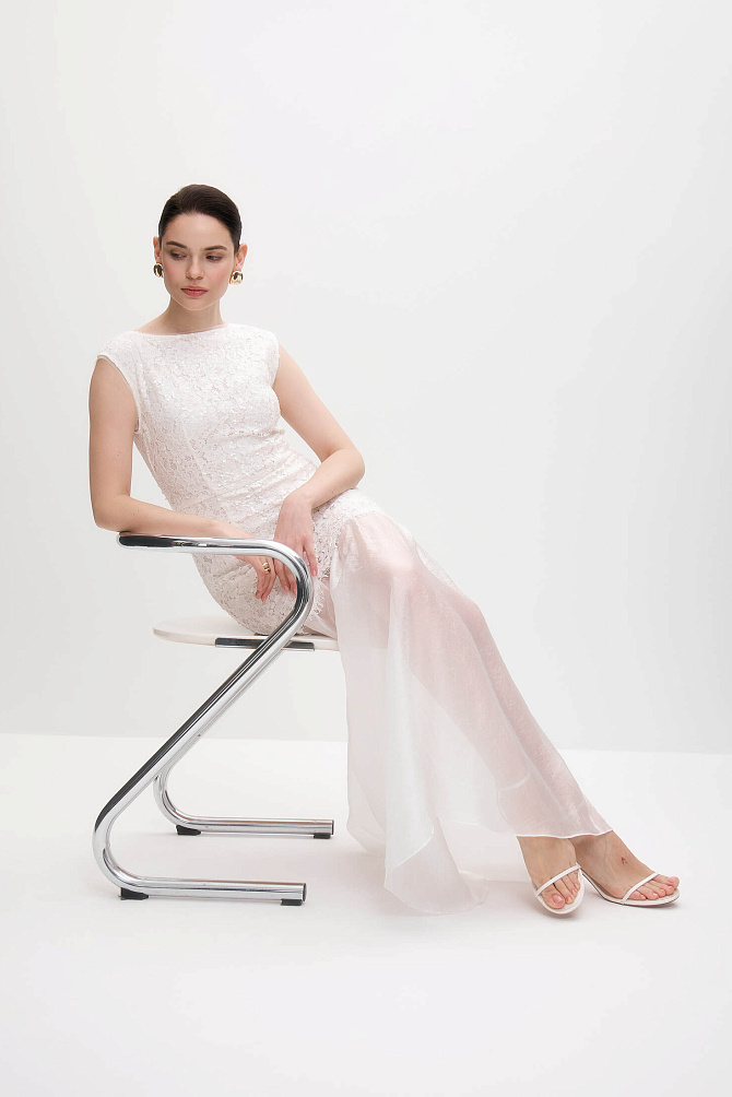 Платье в стиле Диор из формоустойчивой ткани с эффектом тафты. Фигурный вырез-спереди лодочка,сзади V-образный, короткий рукав, характерная для этого стиля отрезная линия талии и роскошная расклешенная юбка,заложенная в глубокие бантовые складки. Комфорт и удобство достигается с помощью мягких чашечек на лифе, подкладкой из района и карманов в боковых швах. Платье застегивается с помощью потайной молнии в среднем шве спинки. Длина от линии талии 83см.
