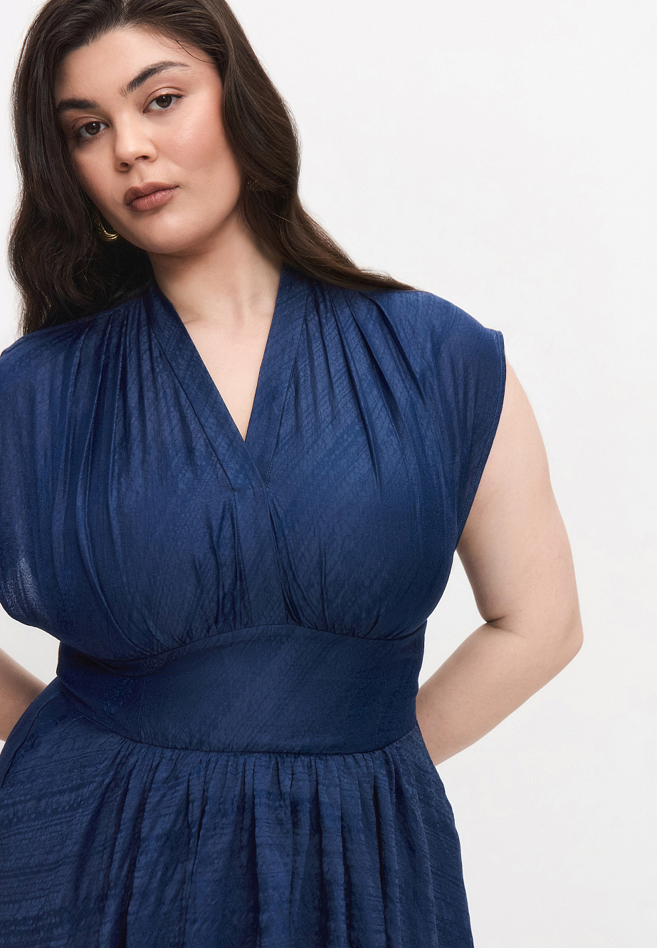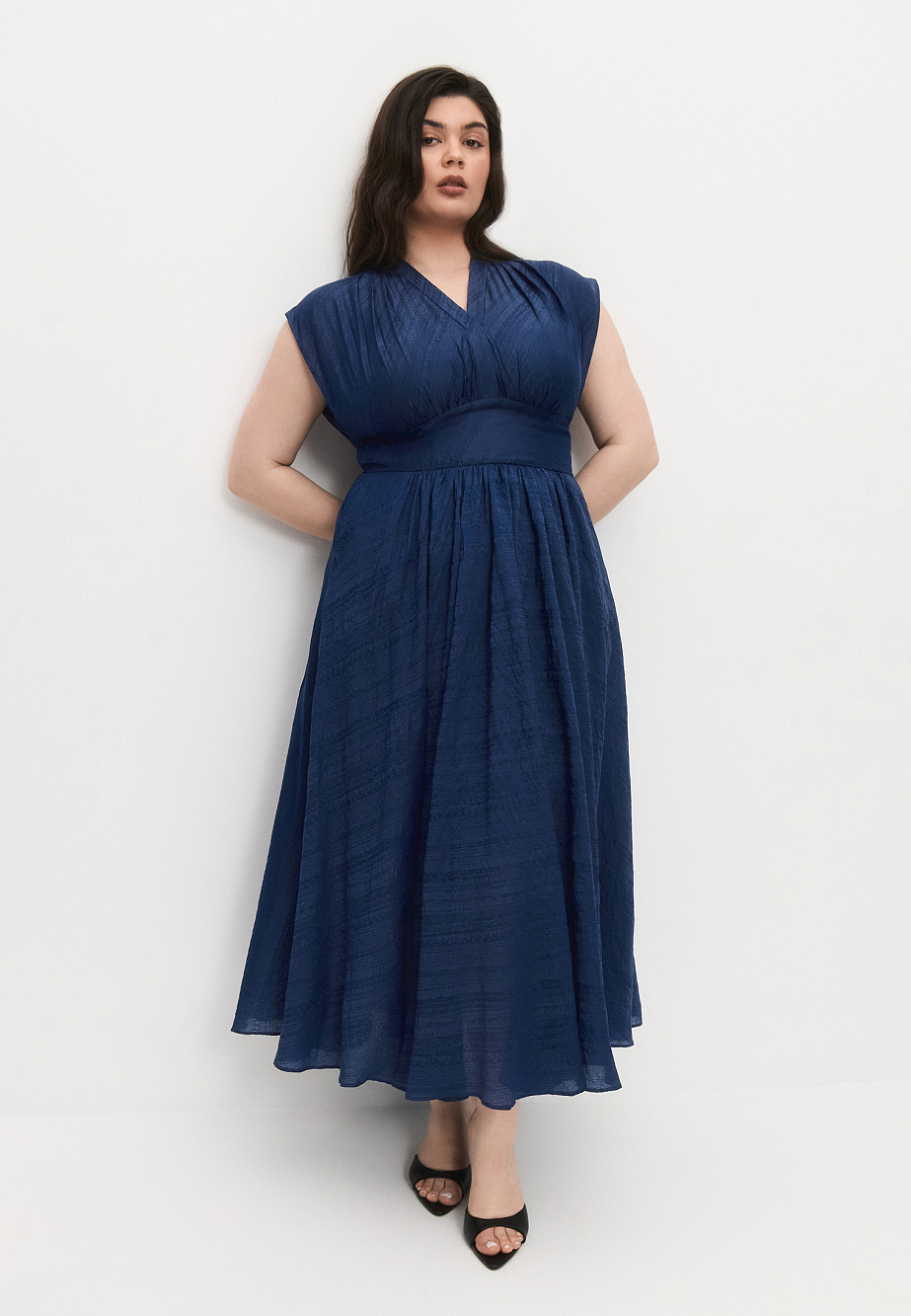 Платье из мягкой сияющей ткани с высоким содержанием тенселя, с акцентным широким поясом, расклешенной, собранной на талии юбкой и удобными карманами.Верх платья с мягкими сборками на плечах и под грудью создают выразительный объем в верхней части. Глубокая пройма и слегка расширенная линия плеч позволяют чуть прикрыть руки. Благодаря легкости ткани и мерцающему блеску, платье смотрится воздушно,женственно и универсально по назначению. Длина юбки от талии 88см.