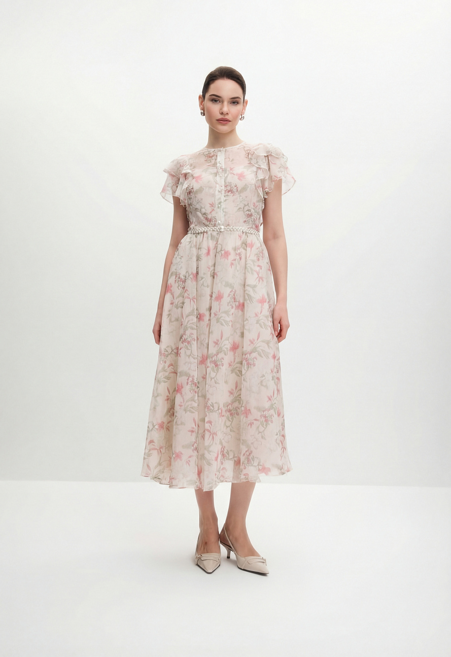Романтичное платье в стиле Tea Dress выполнено из легкого шифона с нежным цветочным принтом на вискозной подкладке. Платье отрезное по талии с акцентным ремнем и застежкой на пуговицы под жемчуг. Рукава-крылышки, воланы в рельефах и расклешенная юбка с деликатной сборкой на талии. Длина от талии 88см. Потайная молния в боковом шве.
