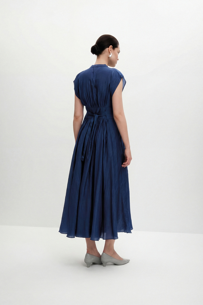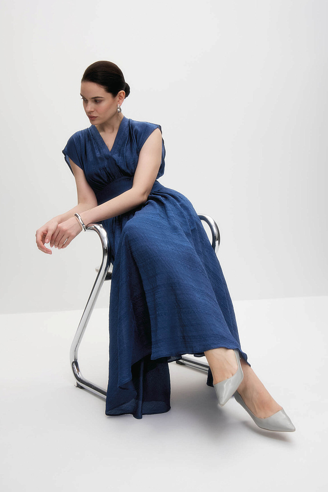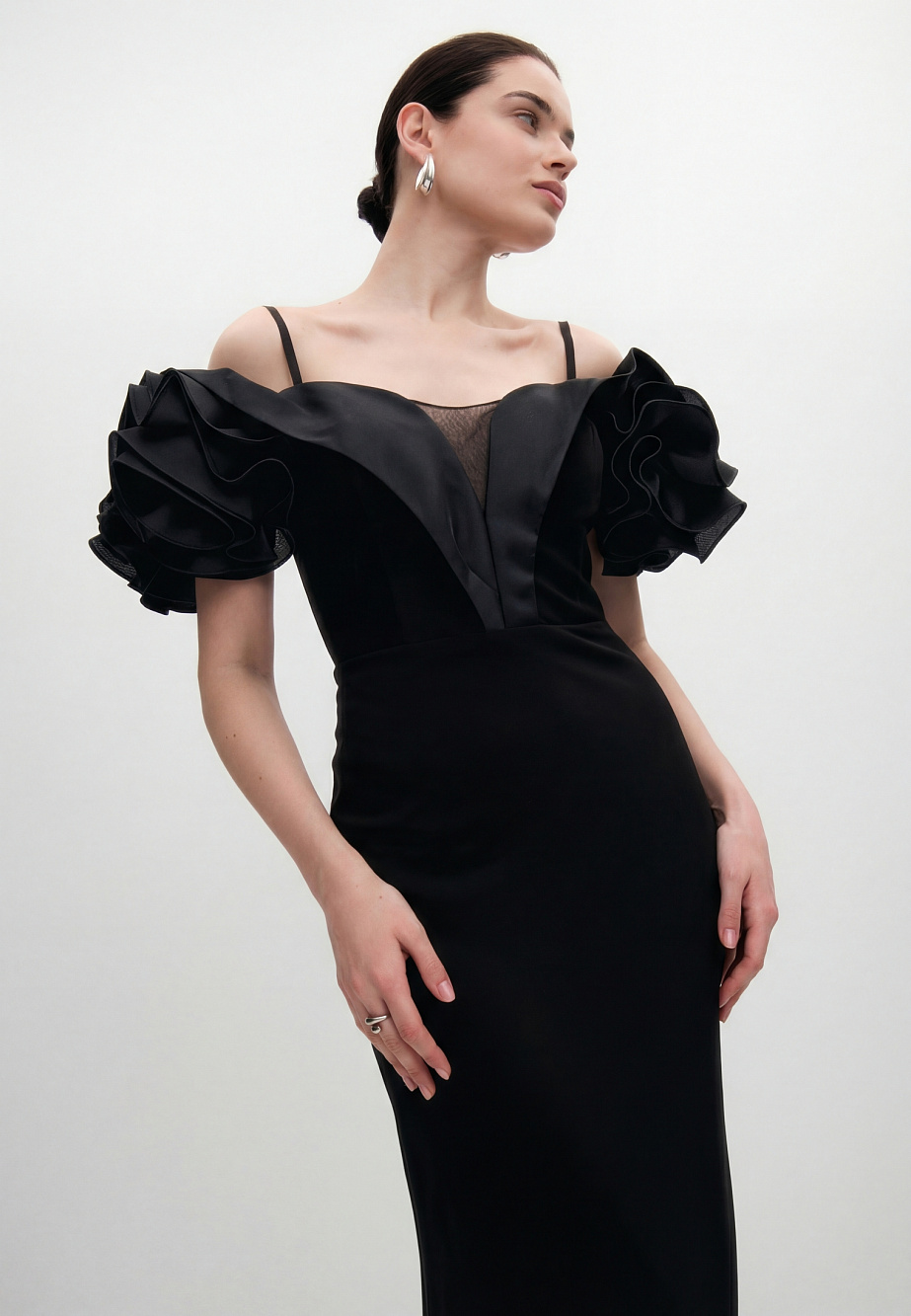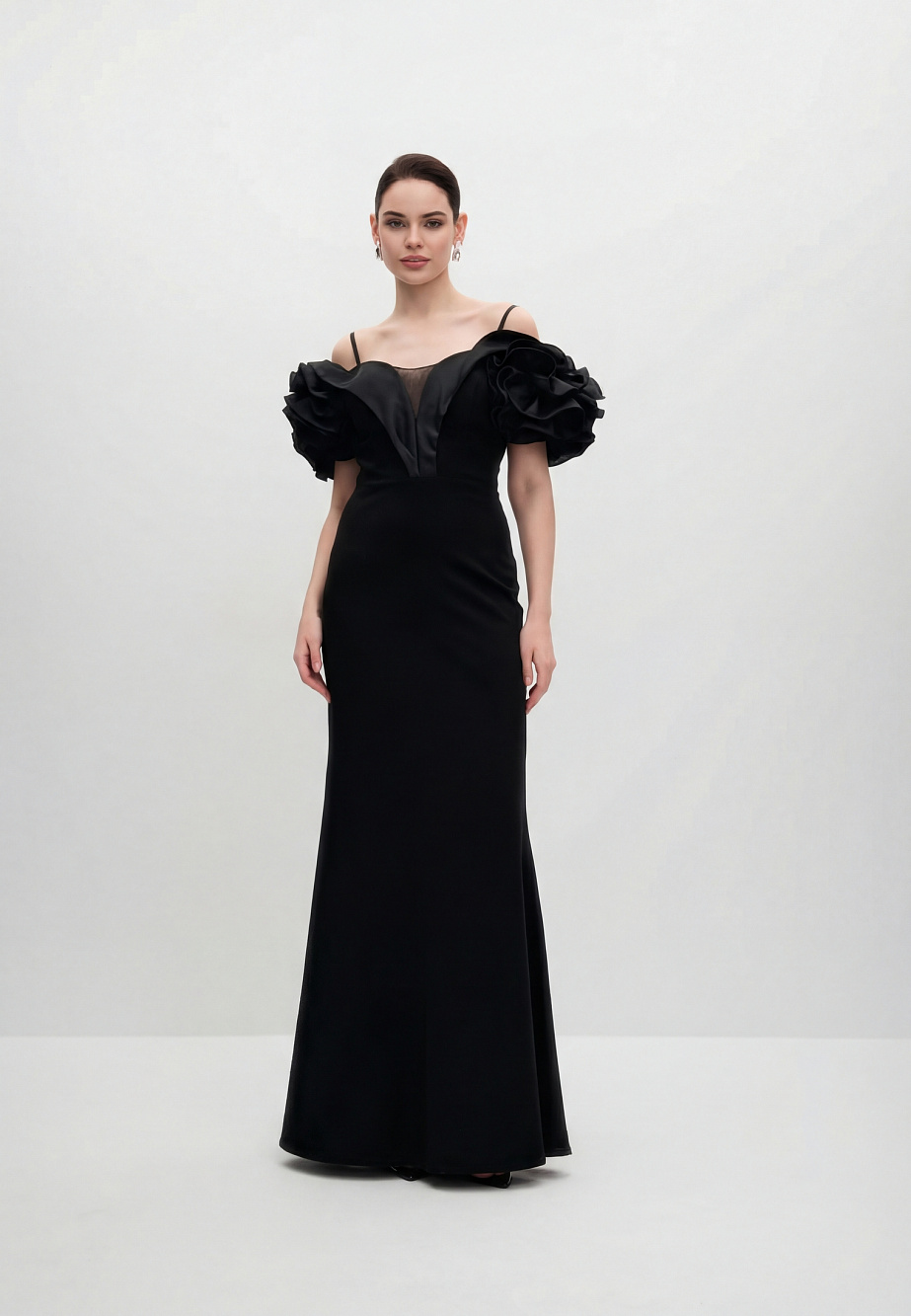 Роскошное вечернее платье длиной макси,приталенного кроя, повторяющего силуэт фигуры. В модели продумано все до мелочей так, чтобы платье создавало wow-эффект и при этом было легкое и комфортное. Платье корсетного типа, конструкция учитывает его носку без белья, в лифе есть встроенные чашечки и вставленный в рельефы регилин для уверенной фиксации. Модель ассоциируется с цветком - отвороты по V-образному вырезу в виде листьев и цветы, выполненные из плотной органзы эффектно прикрывают плечи, что придает шарм и женственность и созвучно с ДНК бренда.