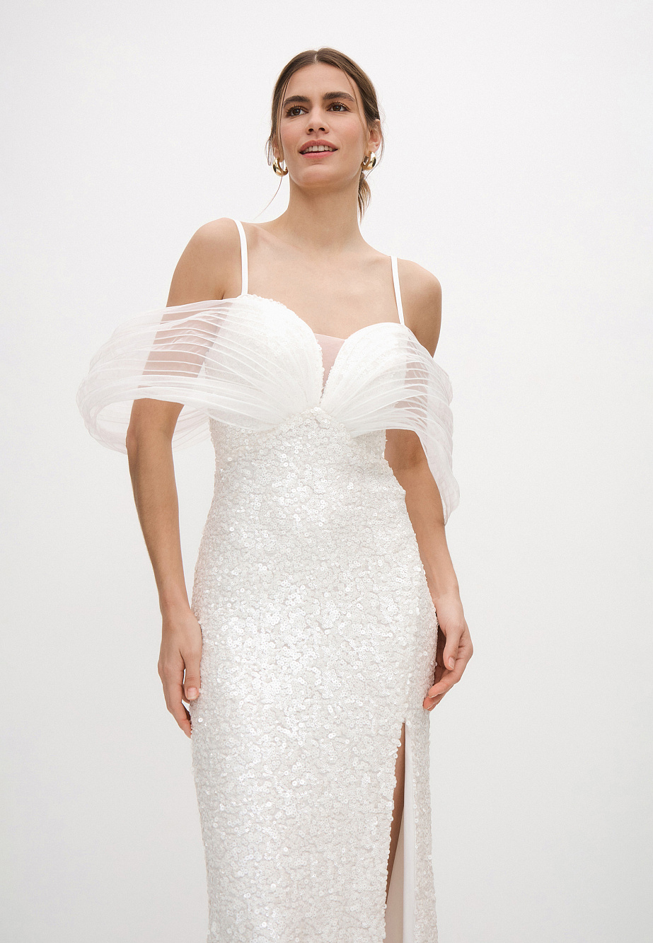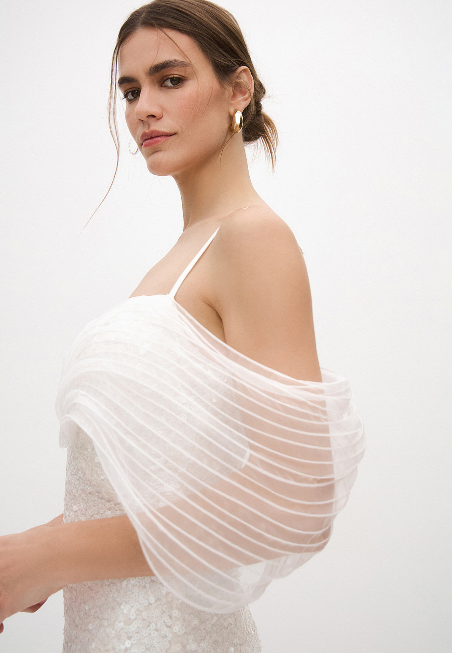 Вечернее платье в пол приталенного силуэта, c открытой зоной декольте, выполненное из сетки с плотным настилом пайеток, создающим фактурную поверхность. Украшением этого платья служит элемент из прозрачной органзы, который держит объемную форму и прикрывает плечи. В конструкцию платья вставлены чашечки, которые держат форму лифа и силиконовая лента для фиксации к телу. Силуэт платья подчеркивает бедра и расклешается книзу за счет красивого шлейфа по низу. Конструкция этой модели с минимальным количеством швов, так боковой шов переходит в рельеф и соблазнительный разрез по ноге. Эластичная плотная подкладка создает эффект платья-бандо и комфортную посадку. Платье для эффектного и запоминающегося выхода.
