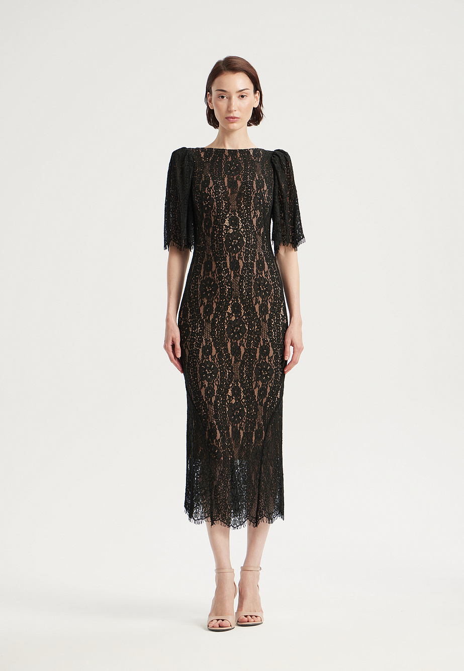 Платье из хлопкового фактурного кружева с ажурным рисунком в стиле барокко на подкладе из мягкого района цвета нюд. Такой микс сочетания цветов и фактур дает возможность передать всю красоту кружева и создать эффект легкости, словно платье надето на обнаженное тело. Стоит обратить внимание на очень выразительный и женственный силуэт, сложный крой-юбки годе и роскошные объемные рукава, которые украшают лаконичное платье. Фестоны по низу рукавов и платья придают законченность и добавляют ценность образу. Платье прекрасно подойдет на любое торжественное мероприятие,смотрится очень элегантно и эффектно.