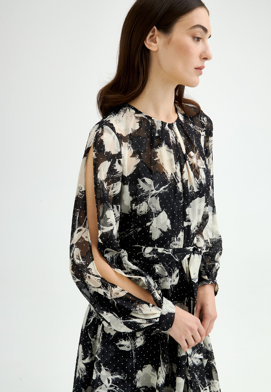 Платье из жаккардового шифона с россыпью страз и черно-белым принтом подарит вам ощущение праздника и привлечет внимание необыкновенным сиянием и струящимся силуэтом. Такие женственные детали, как разрезы на груди и рукавах, щедро разведенная юбка и мягкий пояс бантом украшают эту модель и делают ее актуальной. Платье с вискозной подкладкой на регулируемых бретелях.