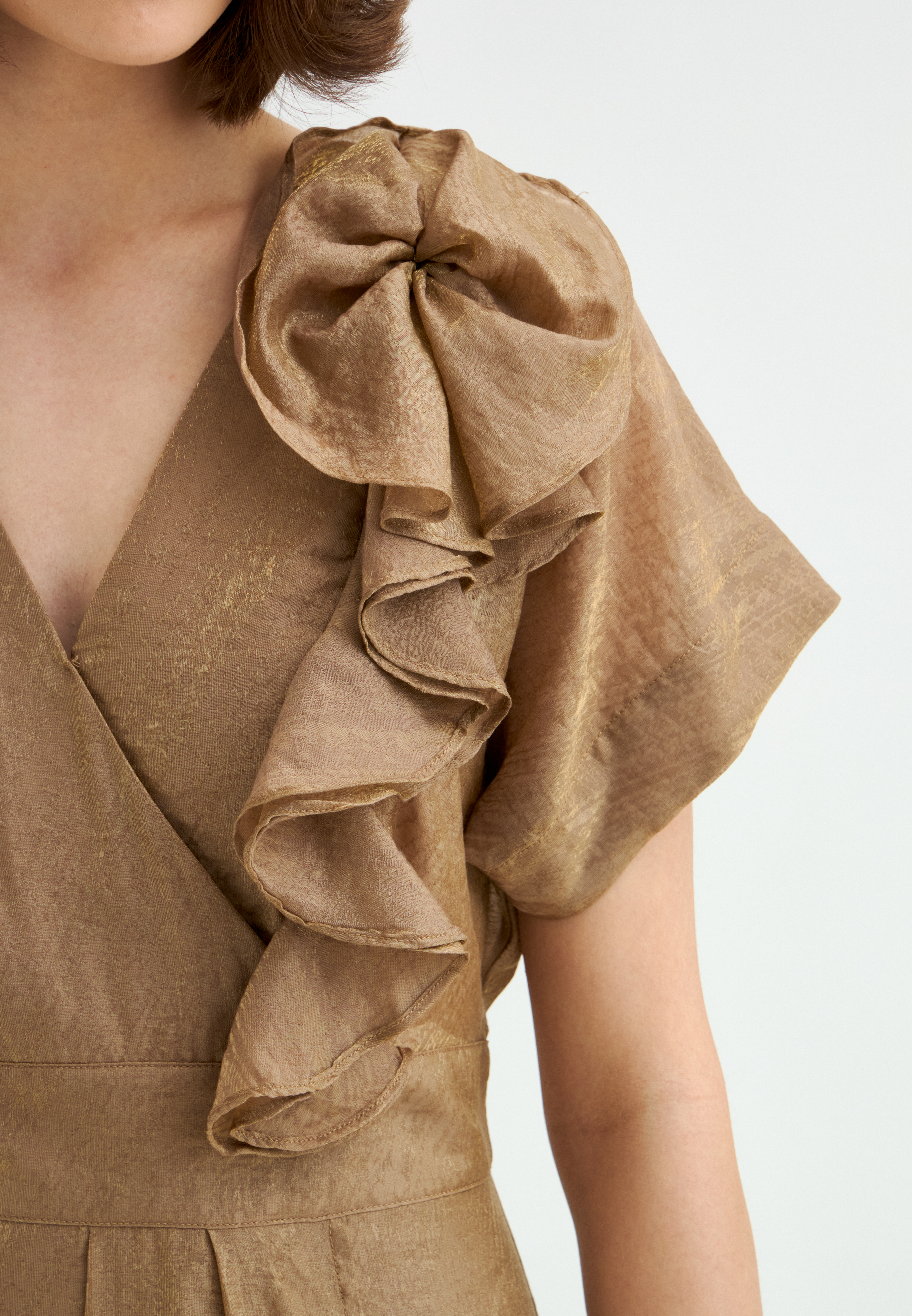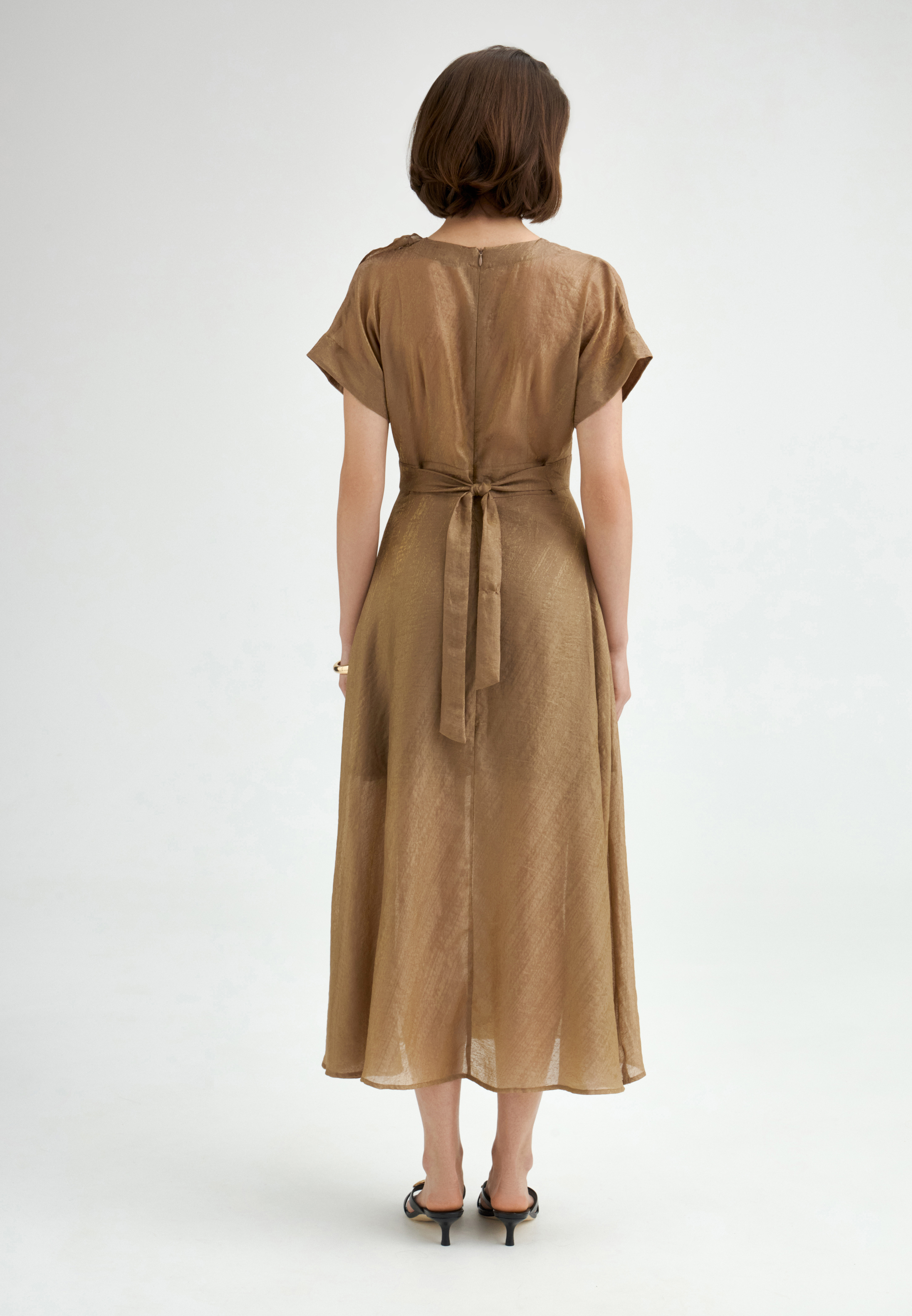 Легкое платье из мерцающей ткани с добавлением тенселя гармонично сочетает в себе повседневную практичность и нотки торжественности. Декор в виде волана, собранного в цветок, добавляет образу деликатного объема и индивидуальности. Модель представлена в двух актуальных оттенках — бронзовом и серо-голубом, которые эффектно подчёркнуты золотистым сиянием. Спущенная линия плеч, лиф на запах, расклешённая юбка и пояс, завязывающийся сзади, формируют элегантный силуэт, а разрез по ноге придаёт лёгкий флер притягательности.