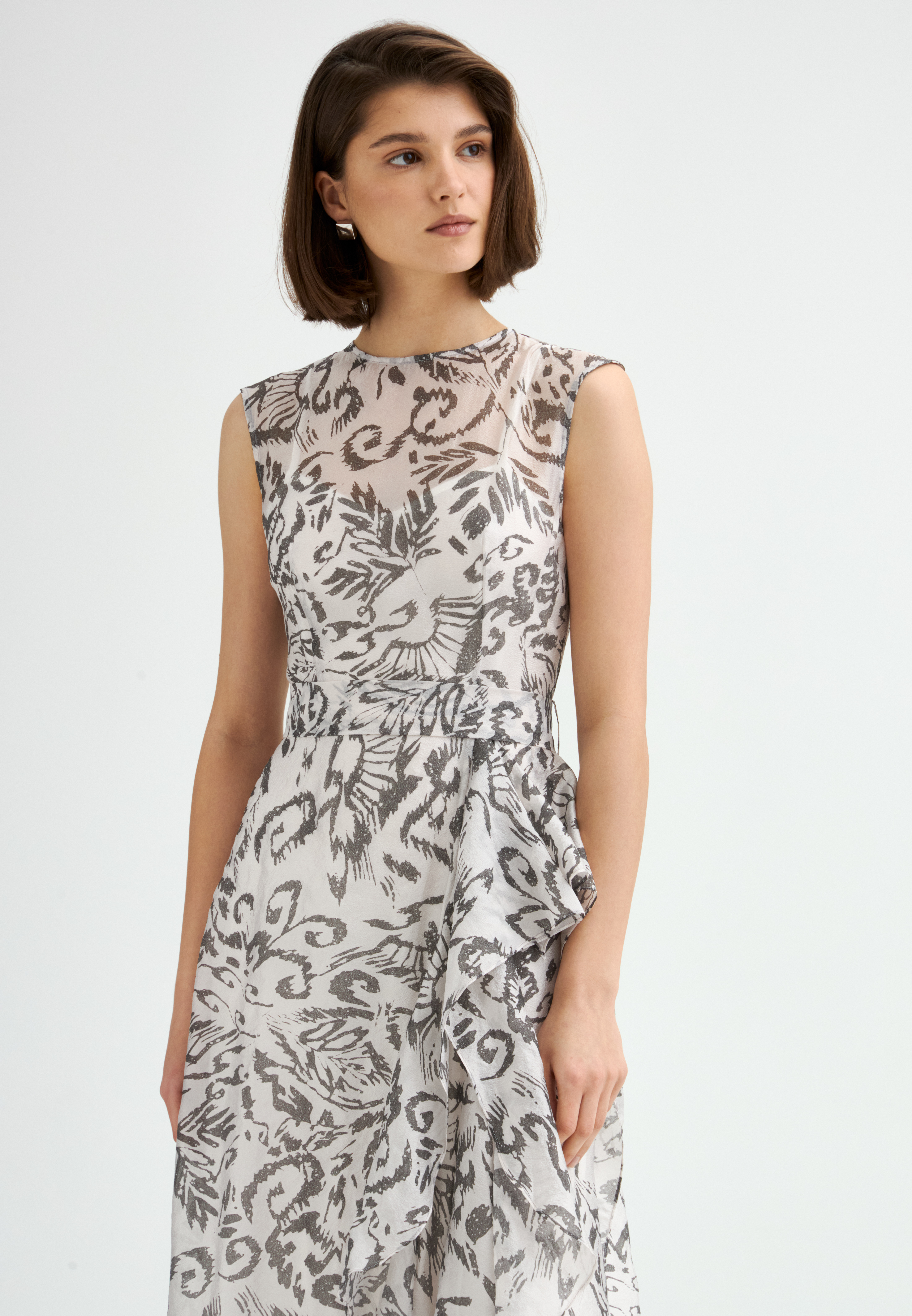 Платье из полупрозрачной вискозной органзы с графичным принтом — изящное решение для жарких летних дней. Воздушная расклешенная юбка с асимметричным каскадом воланов в сочетании с мягким поясом на талии придает силуэту динамику и выразительность. Лаконичный лиф уравновешивает декоративность низа, формируя гармоничный и современный образ. Подкладка из тонкой ткани с районом сохраняет легкость и полупрозрачность материала, обеспечивая приятные тактильные ощущения и ощущение свежести.