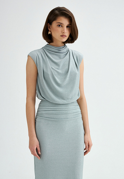 Трикотажное платье макси в изысканном оттенке тиффани выполнено из мерцающей ткани с люрексом и дополнено подкладкой из эластичной сетки. Свободный лиф со спущенной линией плеч и воротником-стойкой эффектно сочетается с зауженной юбкой, украшенной драпировками и мягкими складками. Контраст объемов подчёркивает фигуру и создаёт выразительный силуэт с нотами утончённой элегантности.