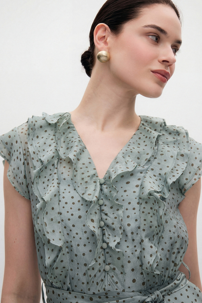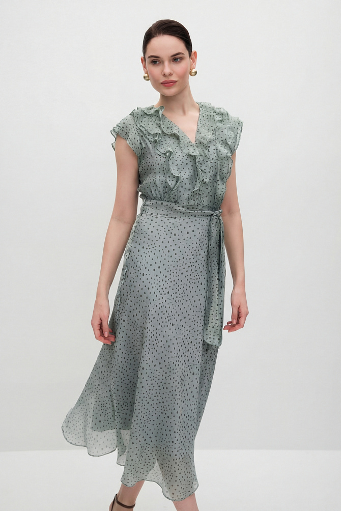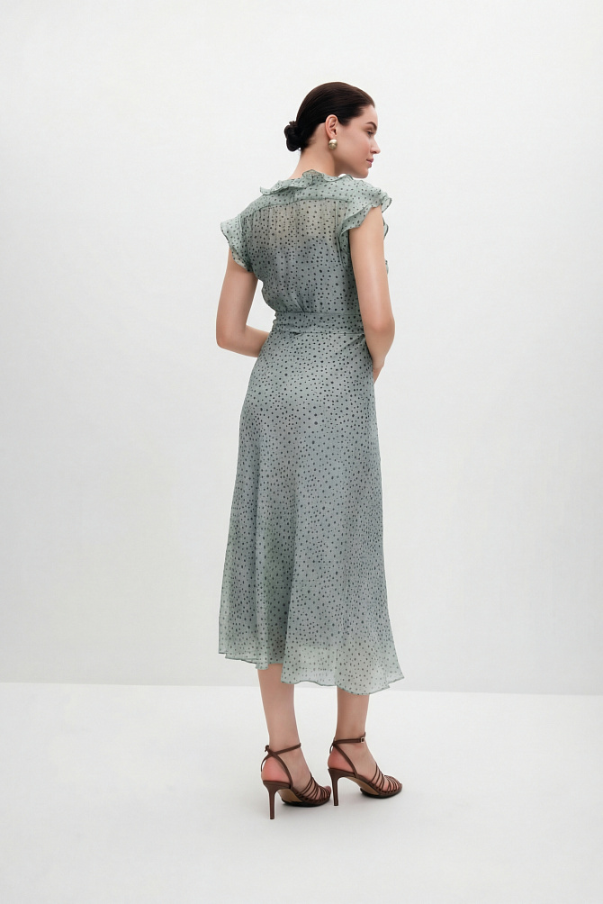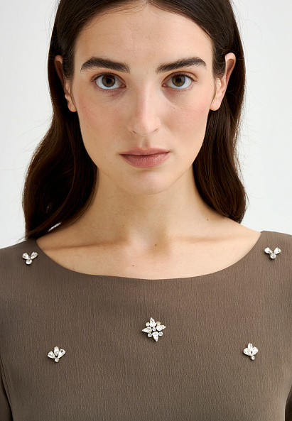 Элегантное платье с универсальным А-образным силуэтом украшено вручную стразами. Ткань с районом обладает приятной струящейся текстурой и сатиновым блеском, создавая ощущение уточенности и тихой роскоши. Талия подчеркнута мягким поясом из основной ткани. Внутри подкладка из тонкой смесовой ткани с районом. Карманы скрыты в рельефах, а застежка выполнена на потайную молнию в среднем шве спинки и пуговицу.