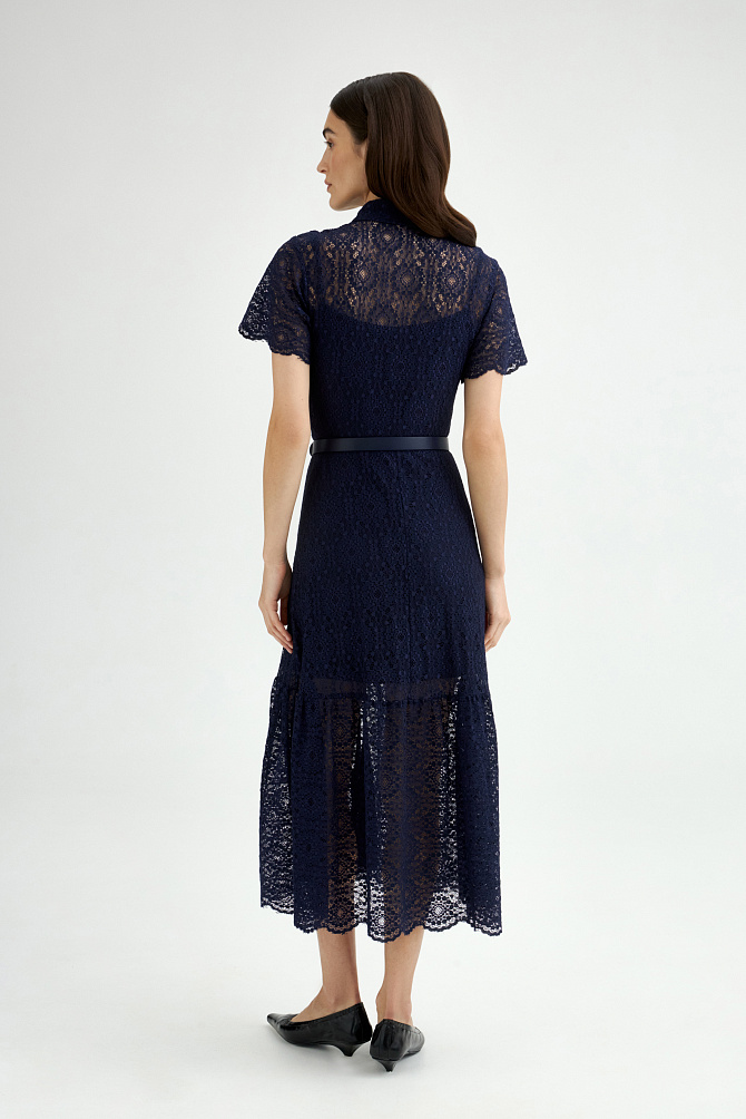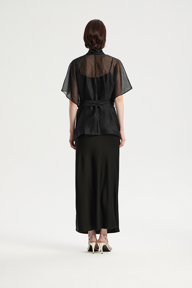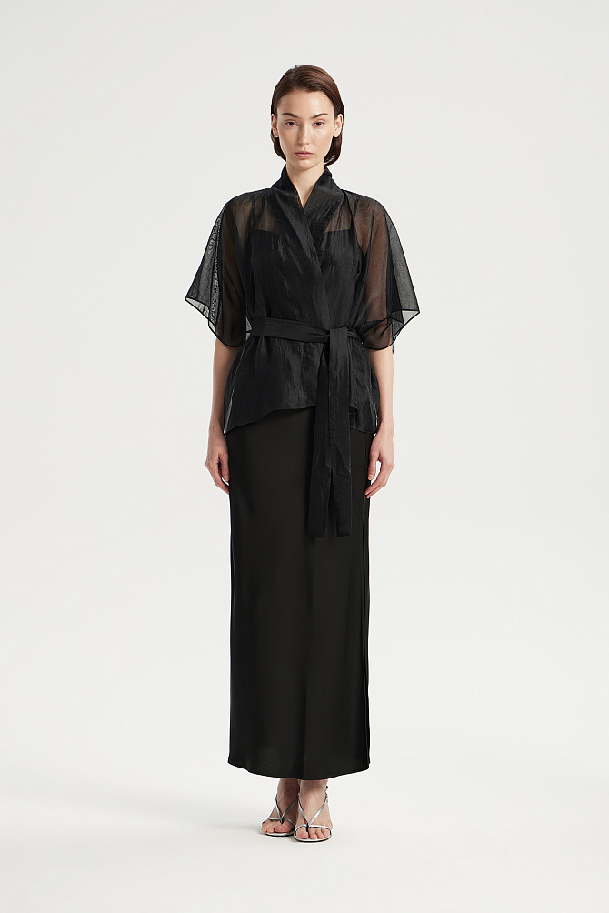 Элегантное вечернее платье миди из мягкого струящегося трикотажа с мерцающей люрексовой нитью. Облегающий силуэт с акцентными плечами подчеркивается драпировками на талии и эффектным разрезом по ноге. Горловина-стойка и длинные рукава с отверстием для большого пальца создают модный образ. Модель сзади застегивается на потайную молнию и дополнена эластичной сетчатой подкладкой.