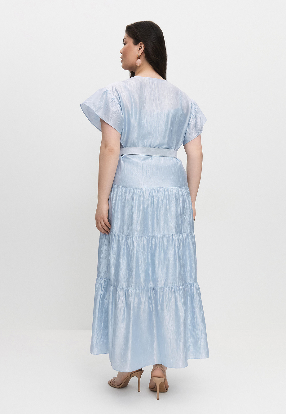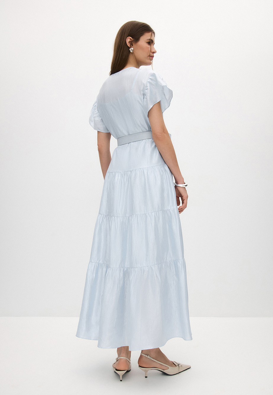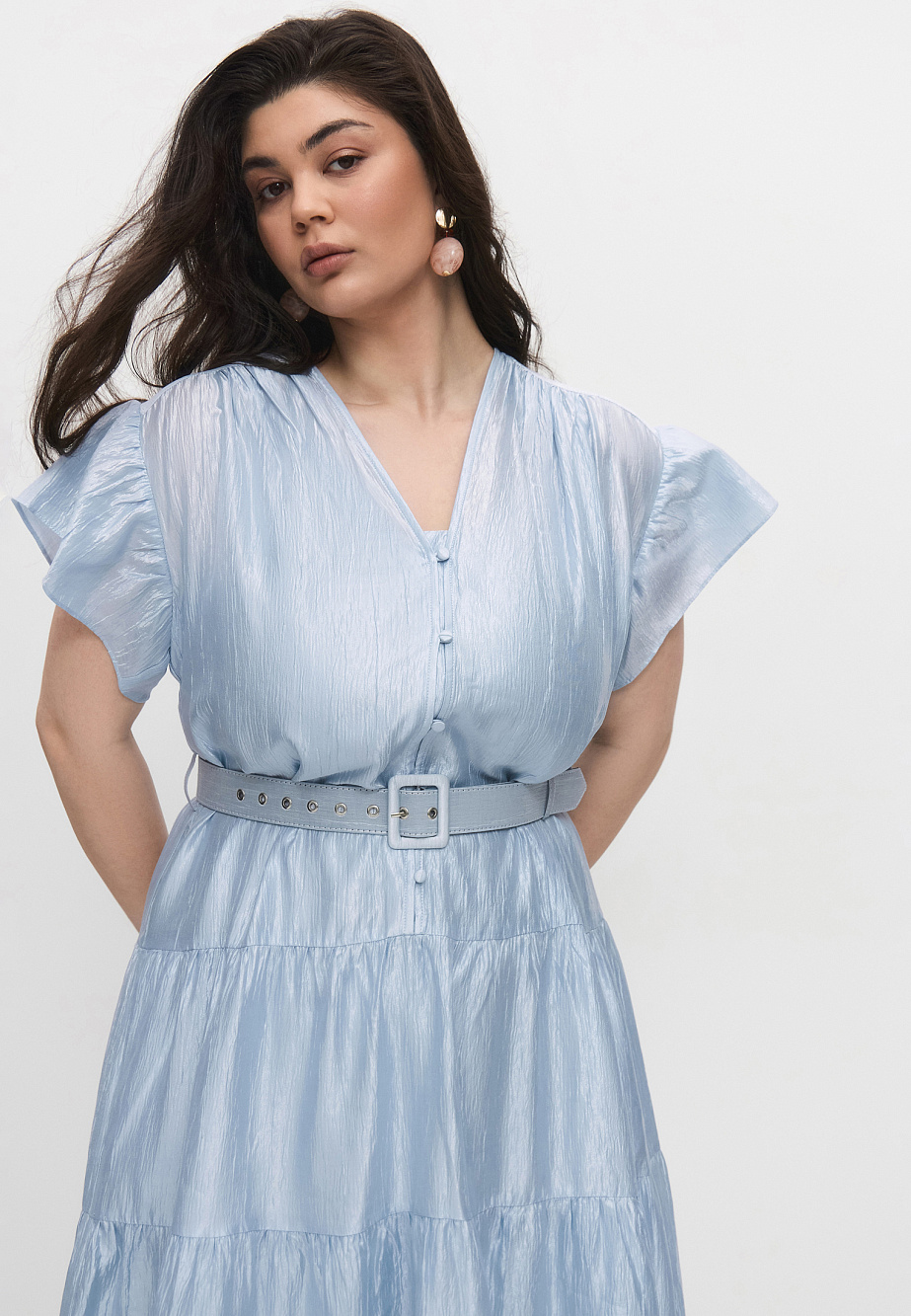 Платье из смесовой ткани с жатым эффектом крэш и глянцевым финишем, свободного силуэта и расклешенное книзу ярусами. Линию талии можно подчеркнуть обтяжным ремнем. Застежка с навесными петлями и обтяжными пуговицами по V-образному вырезу. В комплекте с платьем есть подкладка-комбинация с регулируемыми бретелями. Универсальная модель, которая подходит для любого типа фигуры и на самые разные случаи.