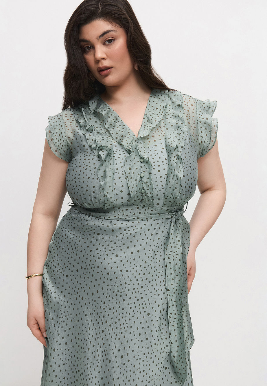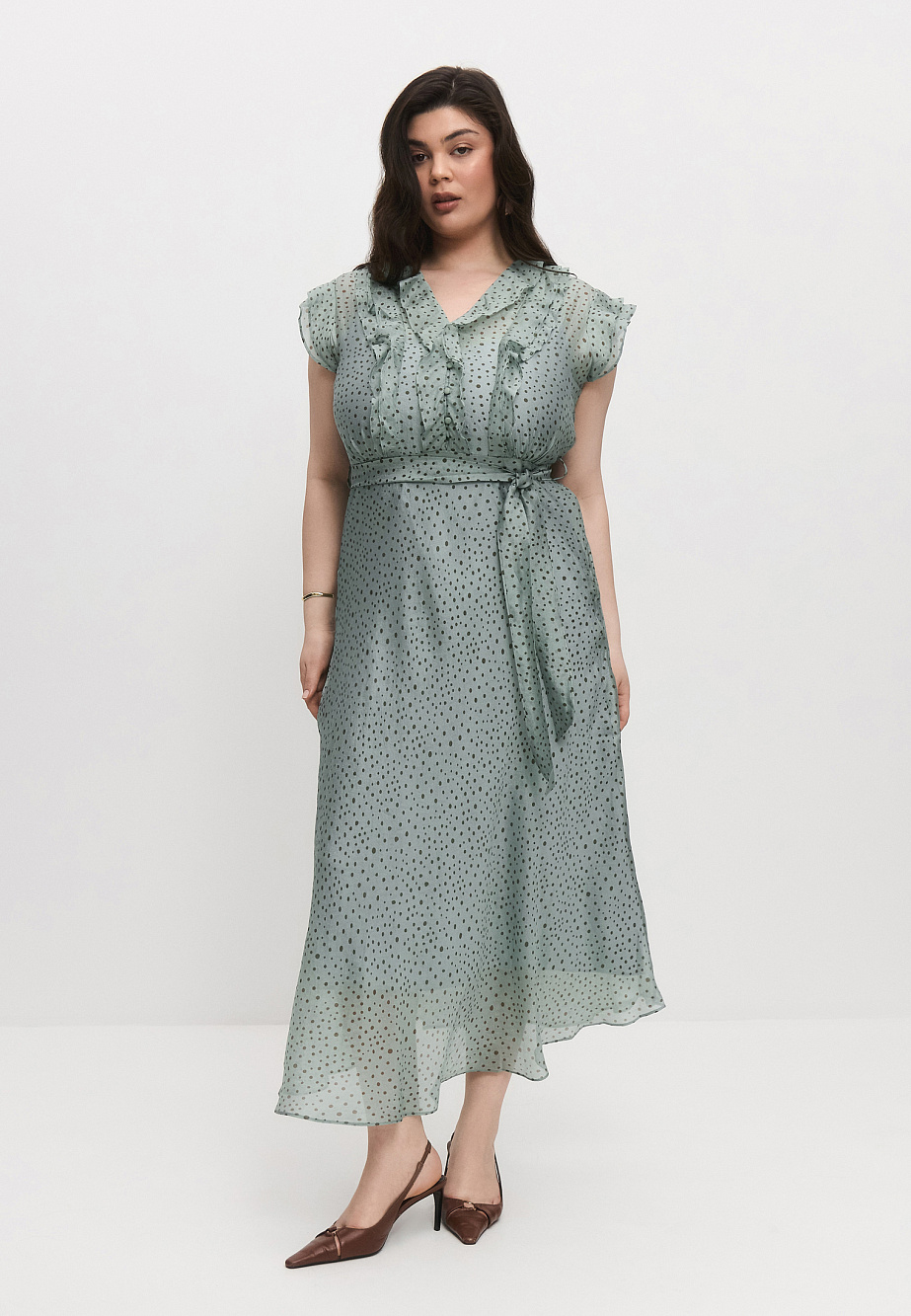 Романтичное платье из полупрозрачной вискозной органзы и принтом Polka Dot для солнечных летних дней. Изящные рюши на груди и рукава-крылышки придают платью легкость и наполняют его воздухом. Крой юбки по косой позволяет добиться аккуратной посадки и равномерных фалд по низу платья. Модель застегивается на потайную молнию в боковом шве и на воздушные петли и пуговицы по переду лифа. В комплекте с платьем есть поливискозная подкладка- комбинация на регулируемых бретелях и текстильный пояс.