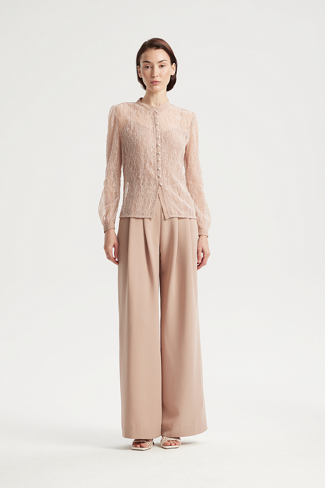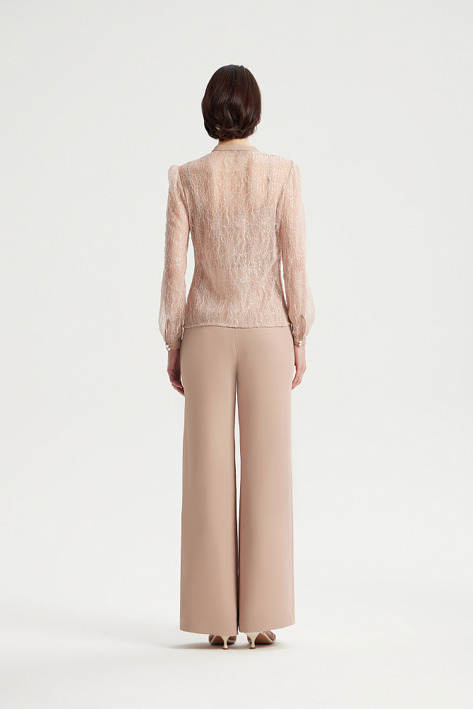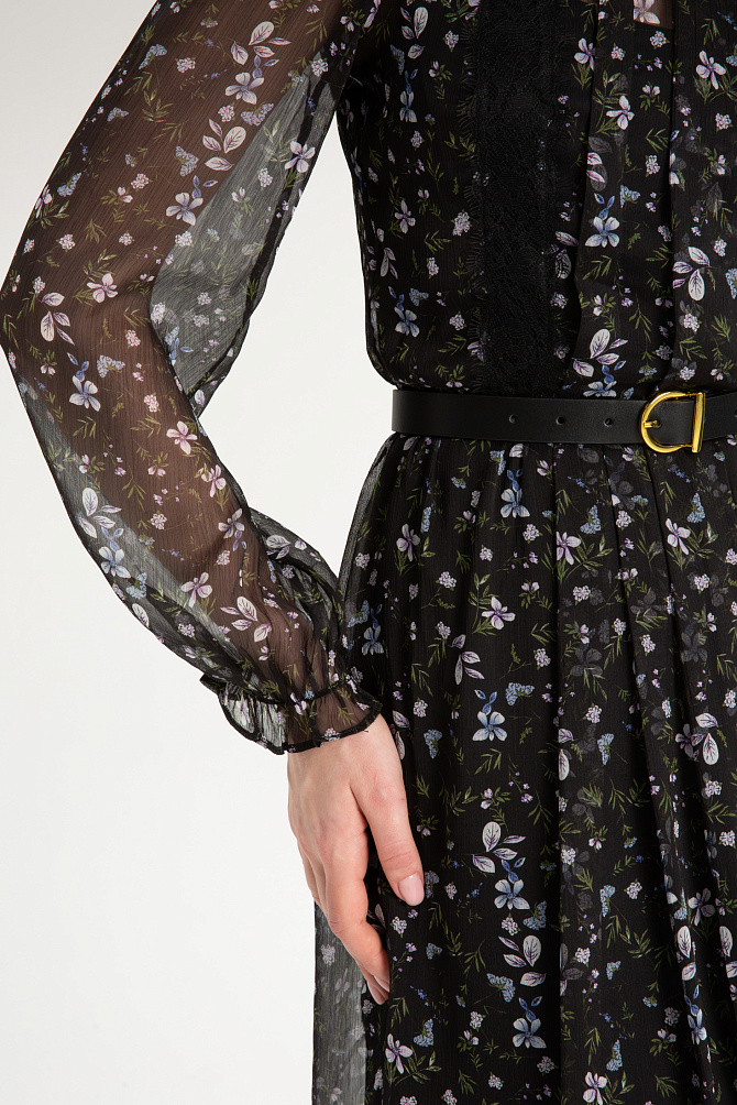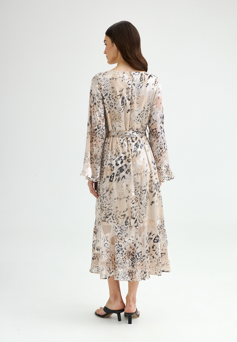 Платье из легкой вискозной ткани с эффектом devore и анималистичным принтом сочетает в себе лаконичный крой и выразительный рисунок. Свободный силуэт, расклешенные рукава, воланы и воротник-лодочка добавляют женственности и комфорта. Пояс, завязывающийся на талии, делает акцент на фигуре. Платье дополено подкладкой из района.
