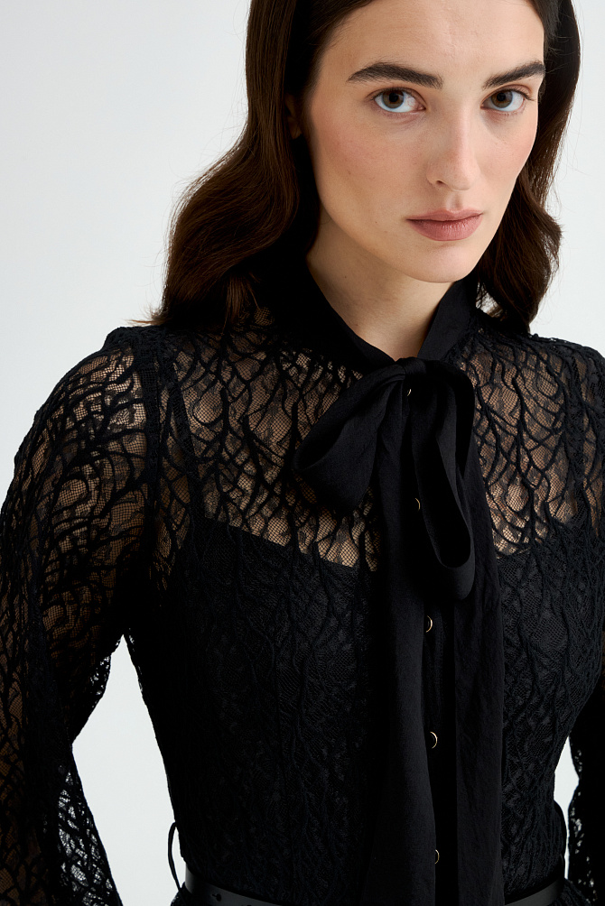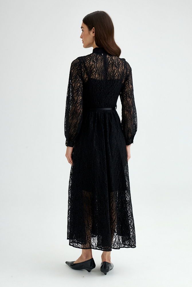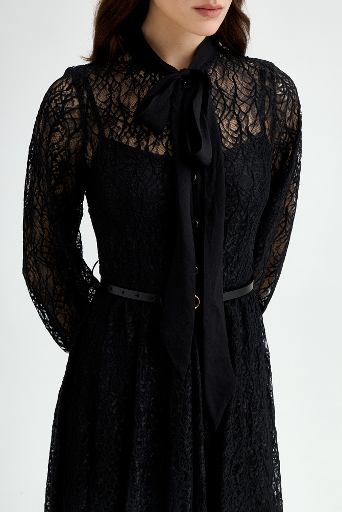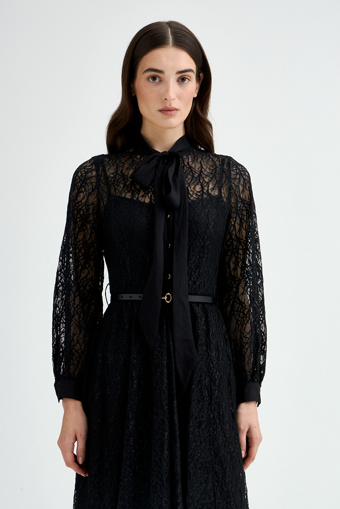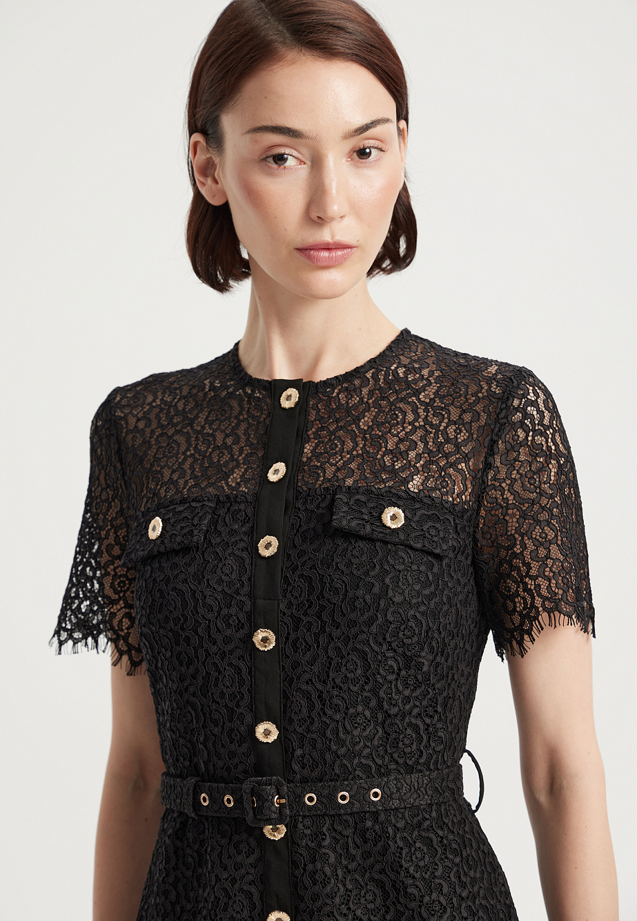 Платье-футляр миди из фактурного кружева с фестонами по краю рукавов и юбки сочетает женственность и строгий стиль. Металлические пуговицы и декоративные клапаны акцентируют внимание на деталях, спереди планка с застежкой и разрезом, а на спинке — потайная молния. Образ завершает обтяжной ремень, который позволяет сделать акцент на талии.