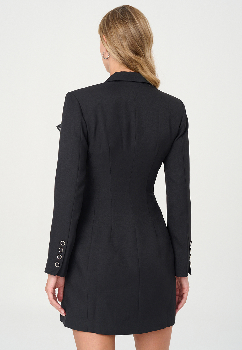 Платье-жакет из костюмной ткани приталенного силуэта с расширенной линией плеч соответствует самым свежим трендам наступившего сезона. Объемная съемная деталь позволяет менять образ в зависимости от настроения и назначения, а также создать максимально эффектный и запоминающийся образ. Глубокий запах фиксируется на пуговицу и завязки внутри изделия, что дает возможность регулировать степень приталенности и не расходится платью при движении.