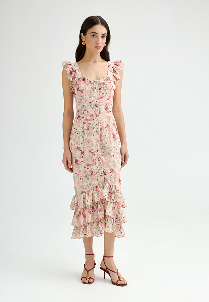 Летнее платье-сарафан из крепового шифона станет незаменимым в вашем гардеробе. Рюши на бретелях и лифе подчеркивают приталенный силуэт, а каскад по низу платья придает дополнительную динамику. Застежка на пуговицы из натурального перламутра облегчает надевание и позволяет регулировать разрез по низу для удобства шага. Подкладка из тонкого материала дарит ощущение легкости при носке.