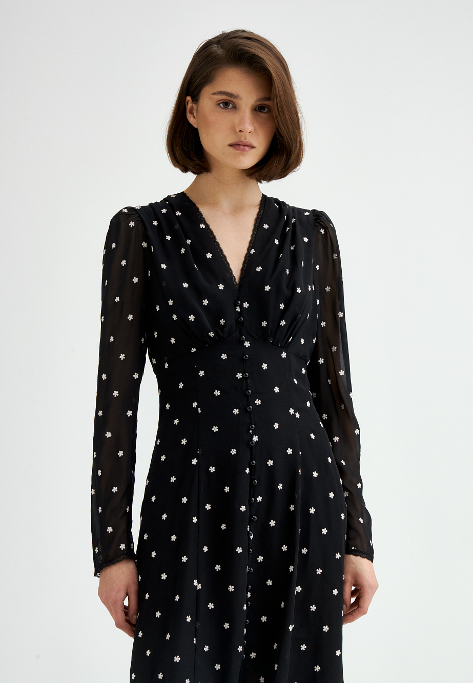 Шифоновое платье с вышивкой и отделкой тонким кружевом выполнено в ретро-стиле. Модные рукава с буфами, подрез со сборкой под грудью и V-образный вырез создают женственный классический образ, который будет актуален вне зависимости от трендов. Полуприлегающий силуэт и выразительная фактура ткани с деликатными объемами делают это платье универсальным выбором на каждый день.