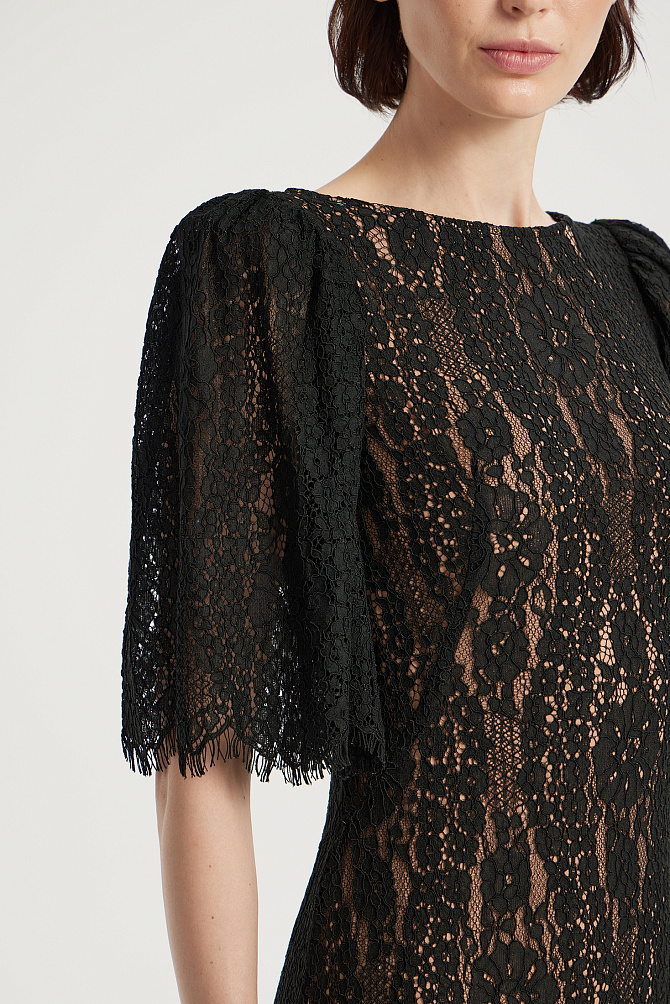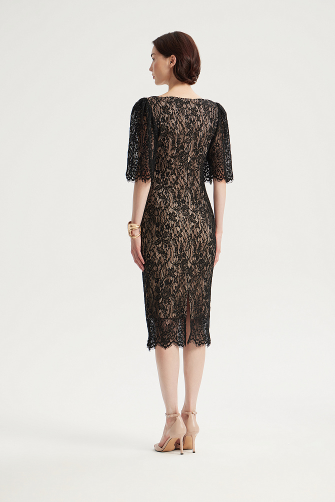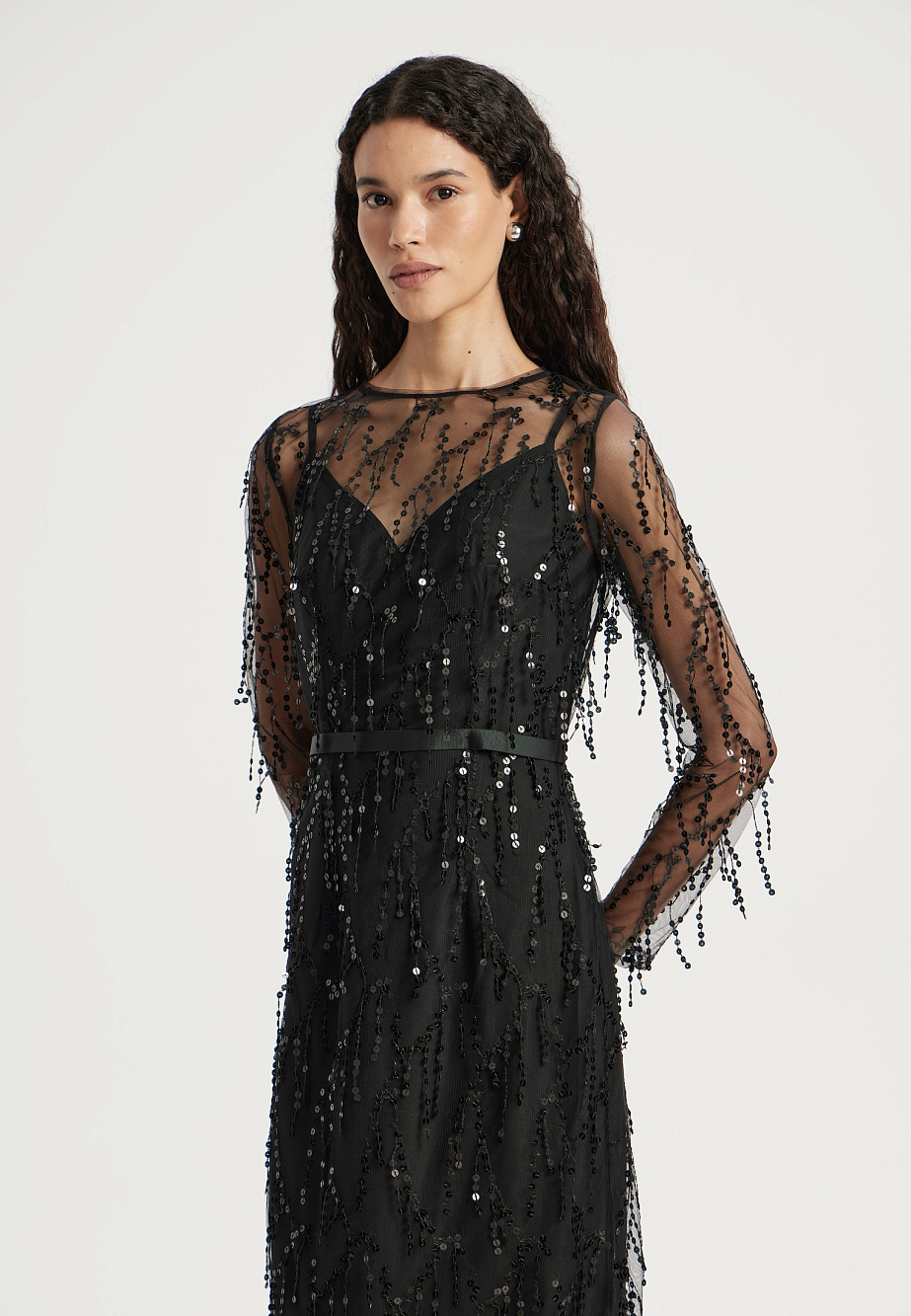 Лаконичное платье-футляр приталенного силуэта смотрится очень эффектно за счет ткани из прозрачной сетки с подвесками из пайеток. Платье двойное,состоит из подклада и основного платья. За счет бельевого кроя нижнего платья и длины мини,хорошо просматривается эффект основного платья и создает визуальный эффект двойной длины.