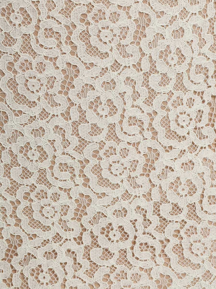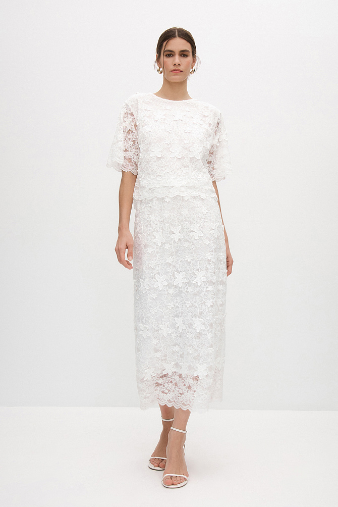 Юбка прямого силуэта, слегка расширенная книзу, выполнена из кружева с содержанием хлопка. Низ юбки оформлен кружевными фестонами. Телесного цвета подкладка подчеркивает фактуру кружева ,а ее трикотажная вискозная основа создает удобство в носке. Внутренние срезы юбки окантованы вместе с подкладкой для придания безупречного внешнего вида. Юбка представлена в коллекции с жакетом и идеально дополняет по цвету и фасону.