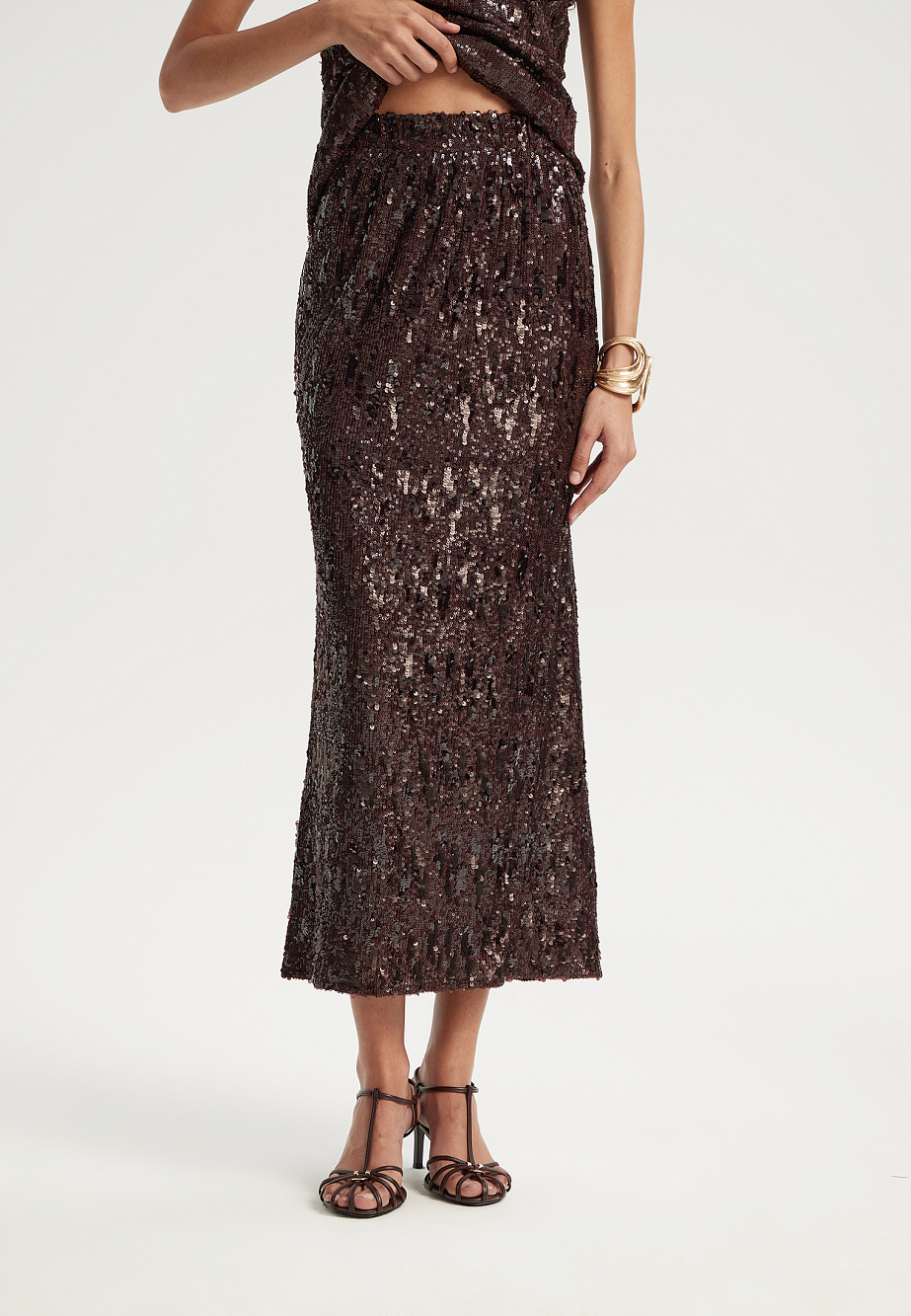 Элегантная юбка из мягкой эластичной ткани с мерцающими пайетками станет ярким акцентом в вашем гардеробе. Модель на удобной резинке по талии можно носить как самостоятельный элемент или в комплекте с топом из той же ткани. Полностью на подкладке из эластичной сетки с защитой внутренних срезов для максимального удобства в течение всего дня.