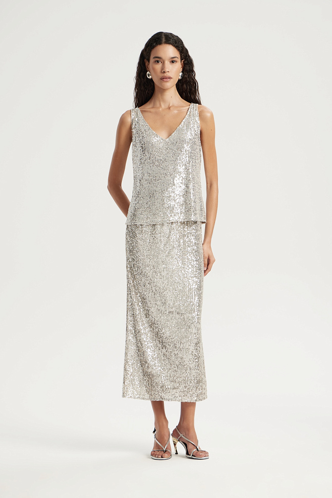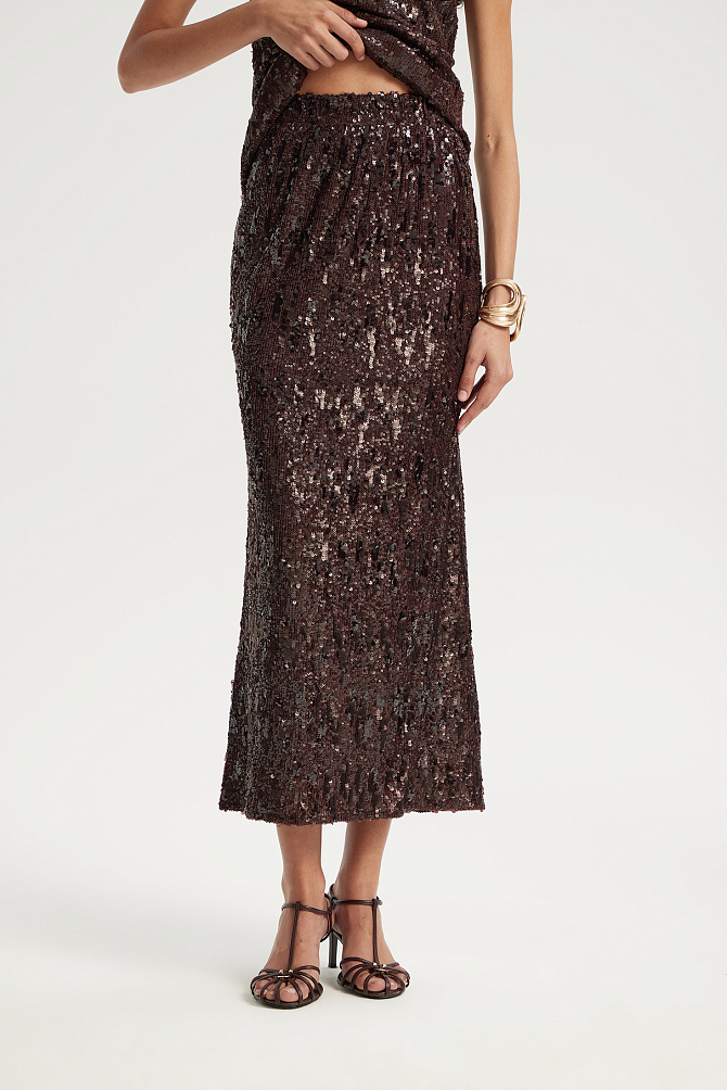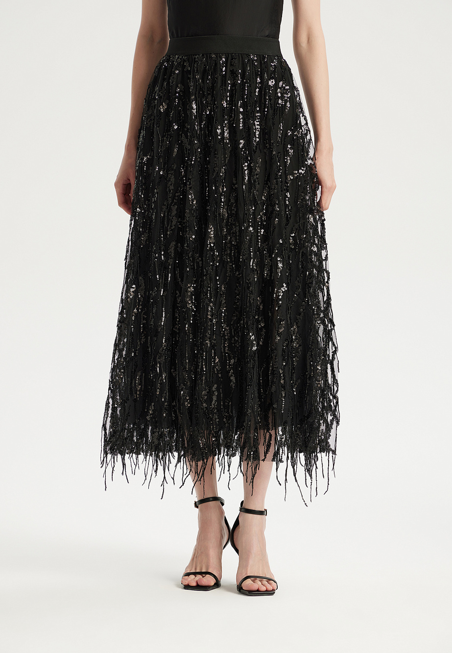 Роскошная расклешенная юбка мидакси из сетчатой ткани декорирована бахромой из мерцающих пайеток. Эластичный пояс обеспечивает универсальную посадку и свободу движений. Подкладка из сетки добавляет объем и динамику силуэту, создавая эффектный акцент для смелых стильных образов.