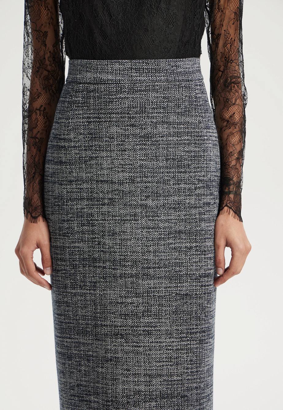 Элегантная юбка мидакси из плотного трикотажа с рисунком «елочка» — идеальное дополнение к жакету из той же ткани для создания безупречного ансамбля. Модель с высокой шлицей сзади подчеркивает силуэт, а эластичная подкладка и потайная молния на спинке обеспечивают идеальную посадку и удобство в движении.