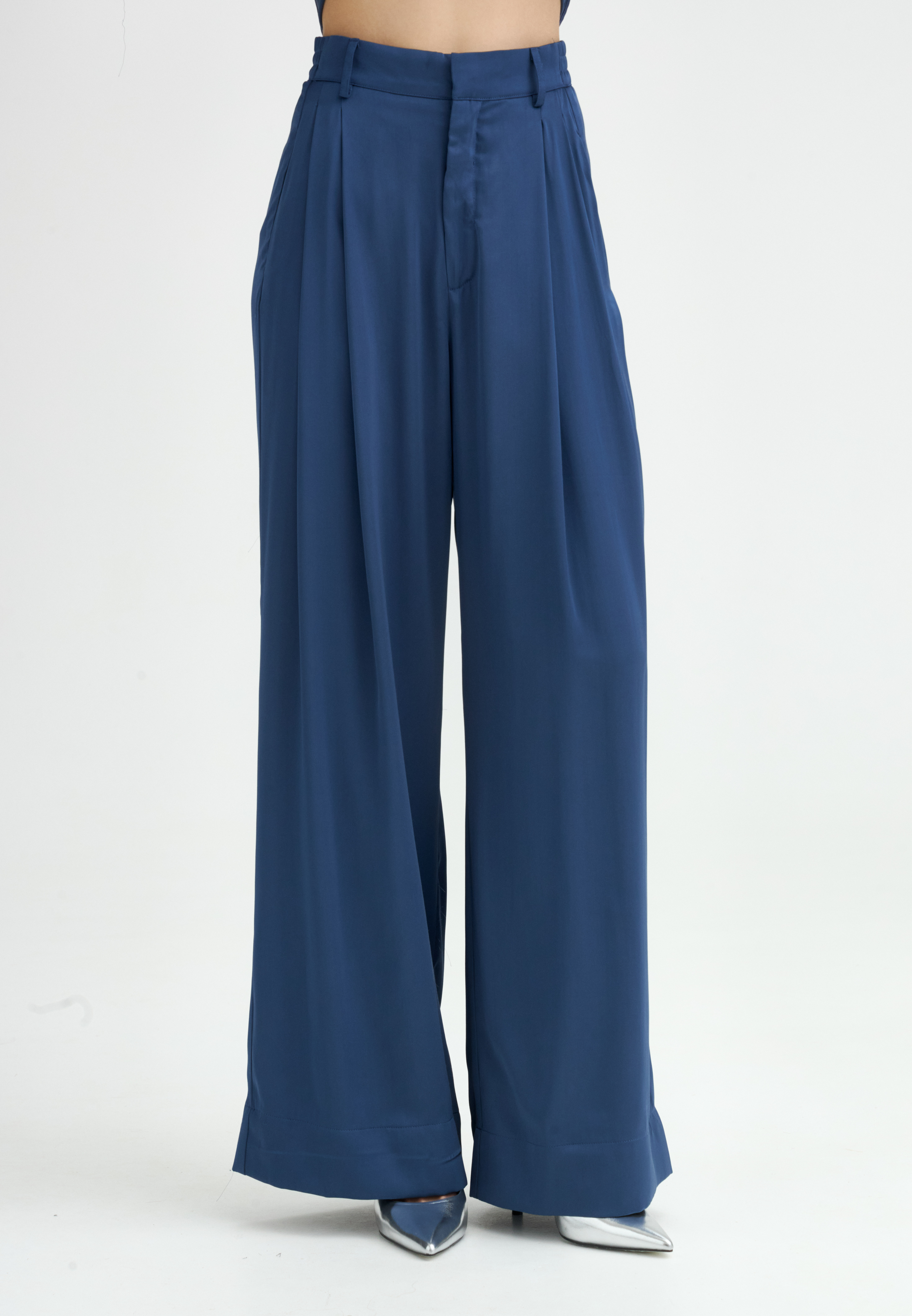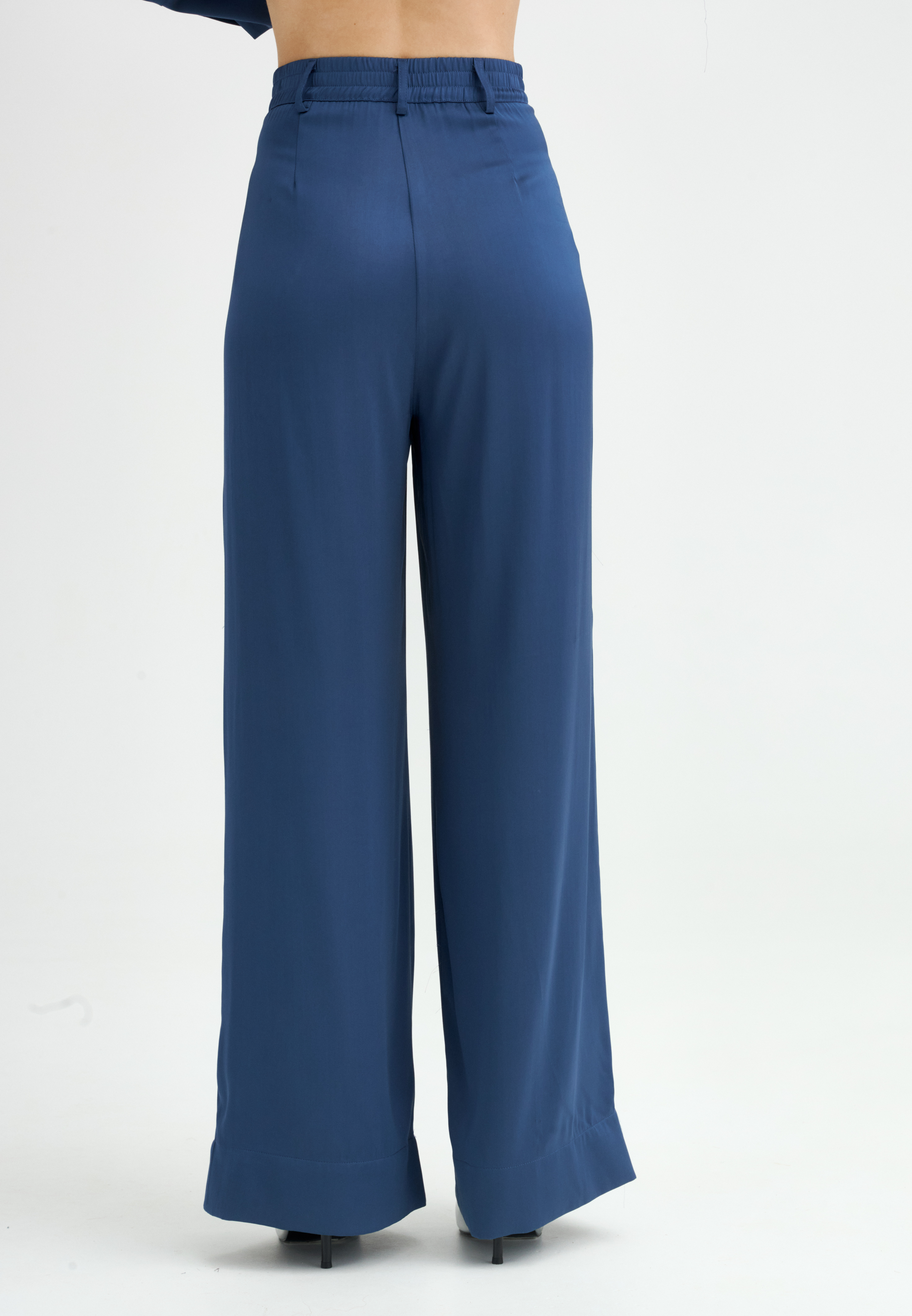 Брюки-палаццо с высокой посадкой, выполненные из прохладной поливискозы с матовым сатиновым блеском, дарят ощущение легкости. Резинка по поясу обеспечивает удобную посадку, а карманы в боковых швах и защипы спереди дарят ощущение свободы. Широкая подгибка по низу брючин сохраняет форму, добавляя завершенность образу. В сочетании с жакетом такие брюки создают безупречный монохромный силуэт, сохраняя чистоту линий и минимализм.