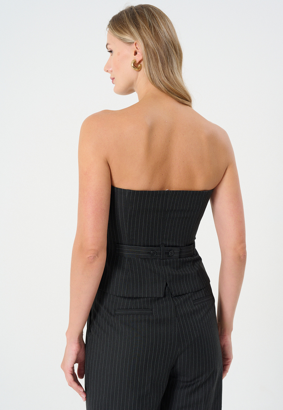 Жилет-корсет из костюмной полушерстяной ткани в тонкую полоску смотрится очень модно и смело и добавляет пикантности в повседневный образ. Регелин,вставленный в рельефы, прекрасно держит форму и помогает создать приталенный и женственный силуэт жилета. При этом костюмные детали-прорезные карманы, хлястик на спинке,графичный принт не дают расслабиться, напоминая о формальности. Такой микс стилистики можно сочетать в разных образах и по разному случаю, что делает жилет многофункциональным. Так бренд предлагает его носить на прозрачный лонгслив или самостоятельно,если обстановка неформальная, или на рубашку или что-то более плотное, если этого требует офисный дресс-код. Также дизайнеры добавили элемент в виде фурнитуры-сердечка,которое добавляет узнаваемость бренда.