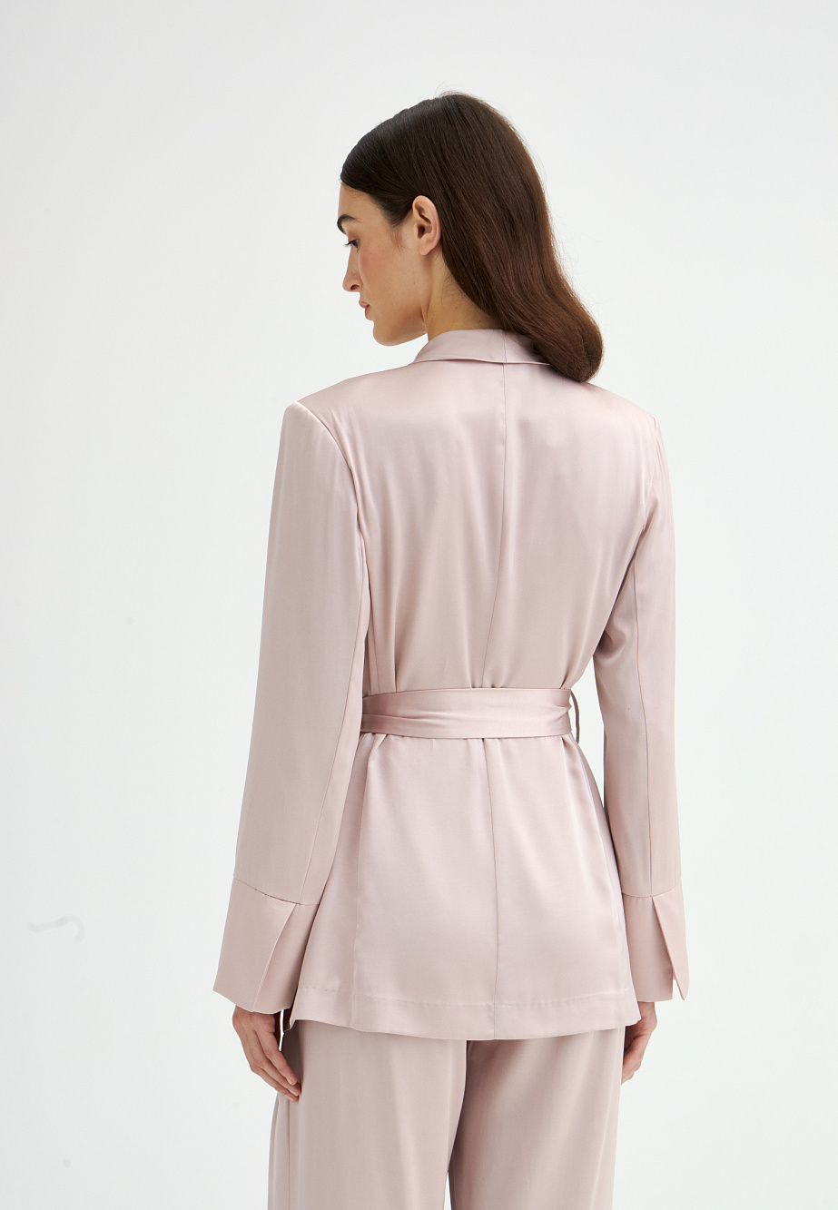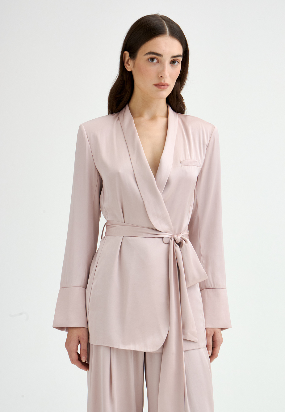 Жакет свободного кроя из поливискозы с матовым сатиновым блеском и мягким шалевым воротником. Модель удлиненная, двубортная с застежкой на пуговицы и под пояс. Нагрудный карман, манжеты с шлицей и кантом, закругленная линия борта. В сочетании с брюками-палаццо идеально подходит для торжественного случая.