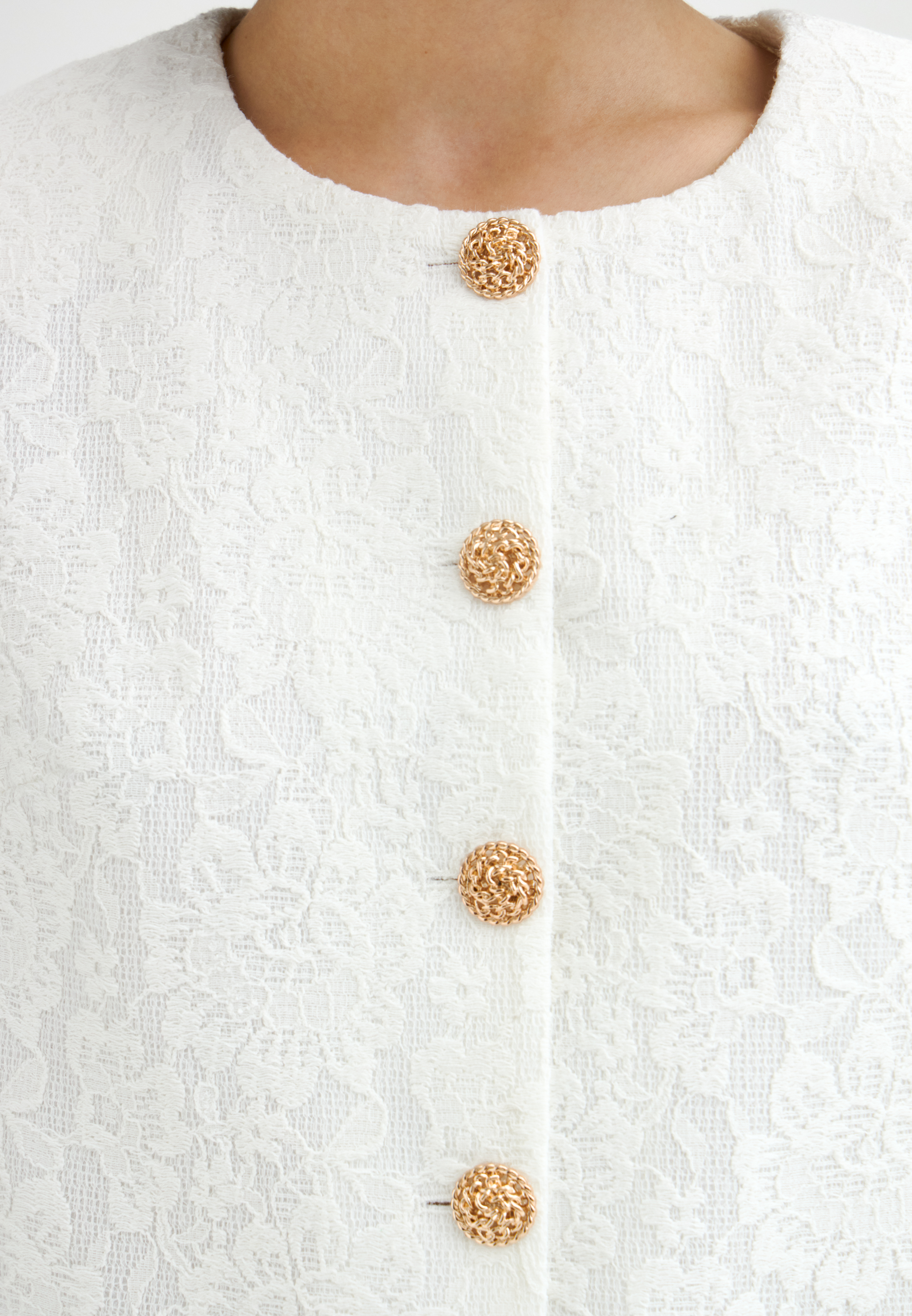Укороченный прямой жакет из кружевной ткани с хлопком, создающей благородную фактуру. Легкость модели подчеркнута рукавами без подкладки и золотыми пуговицами. Лаконичный крой и молочный оттенок придают жакету статусность и вневременную эстетику. Жакет на подкладке, с круглым вырезом и имитацией карманов.