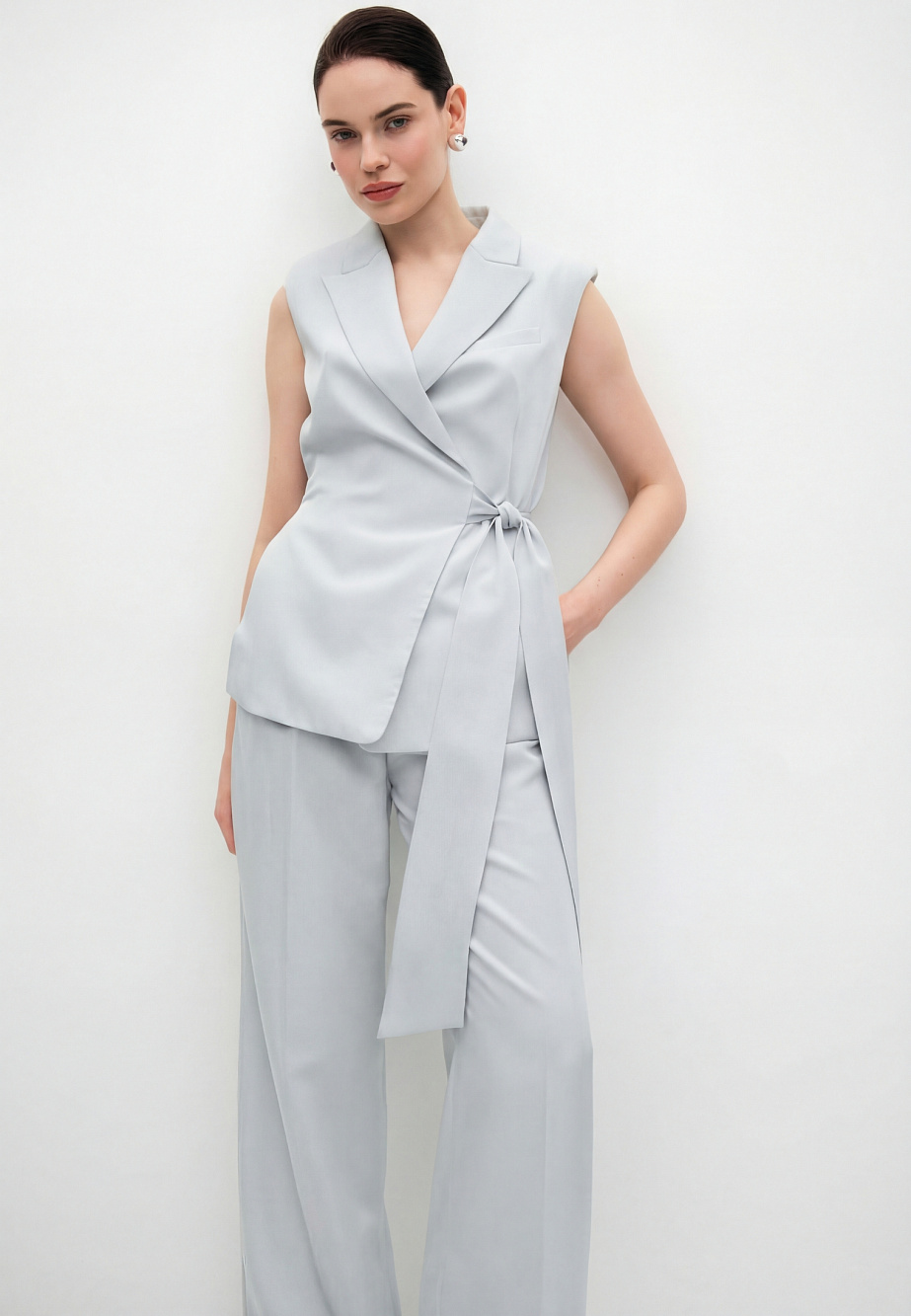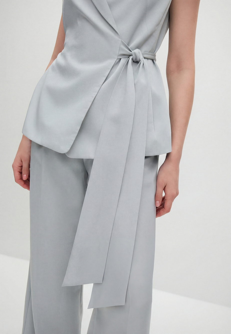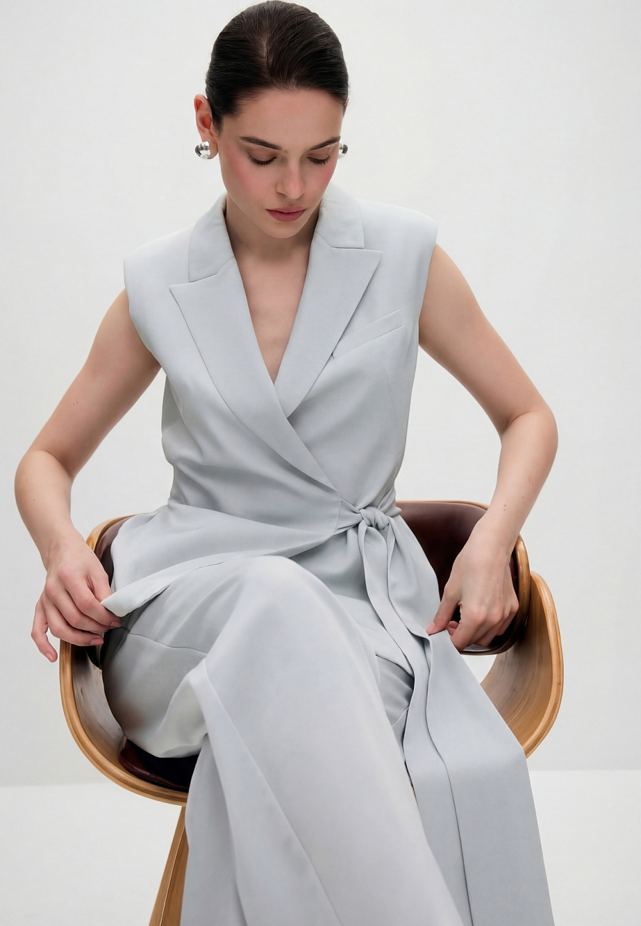 Свободный жилет из сатина с эффектом крэш, с застежкой на запах и поясом-бантом, регулирующим прилегание по талии. Модель с акцентными плечами и английским воротником, с карманами в боковых швах на подкладке из поливискозы.