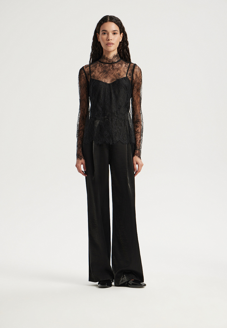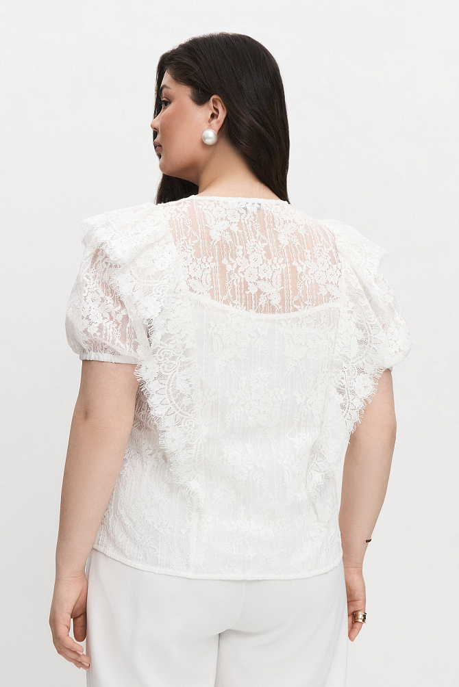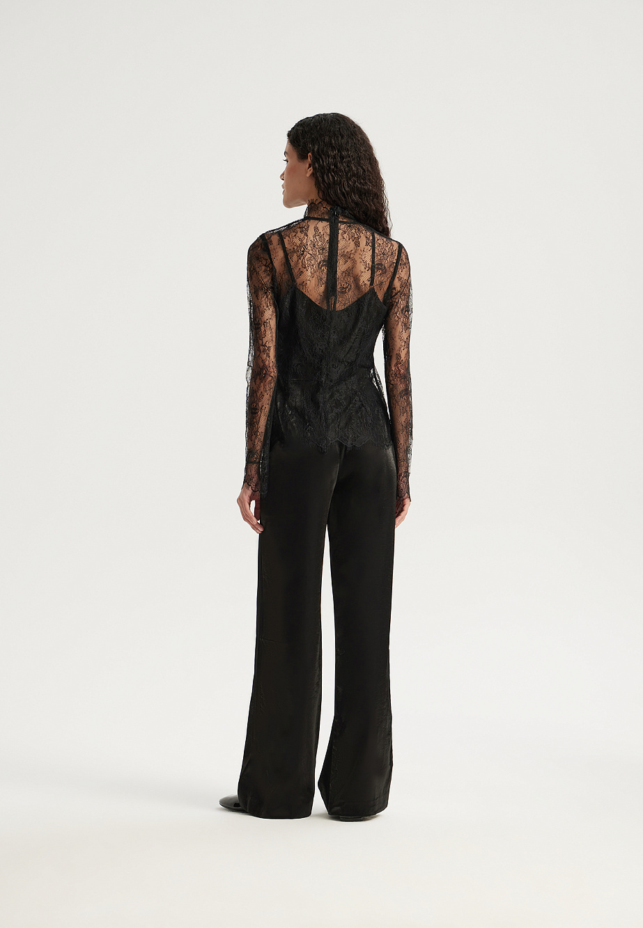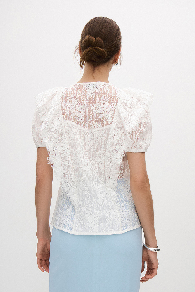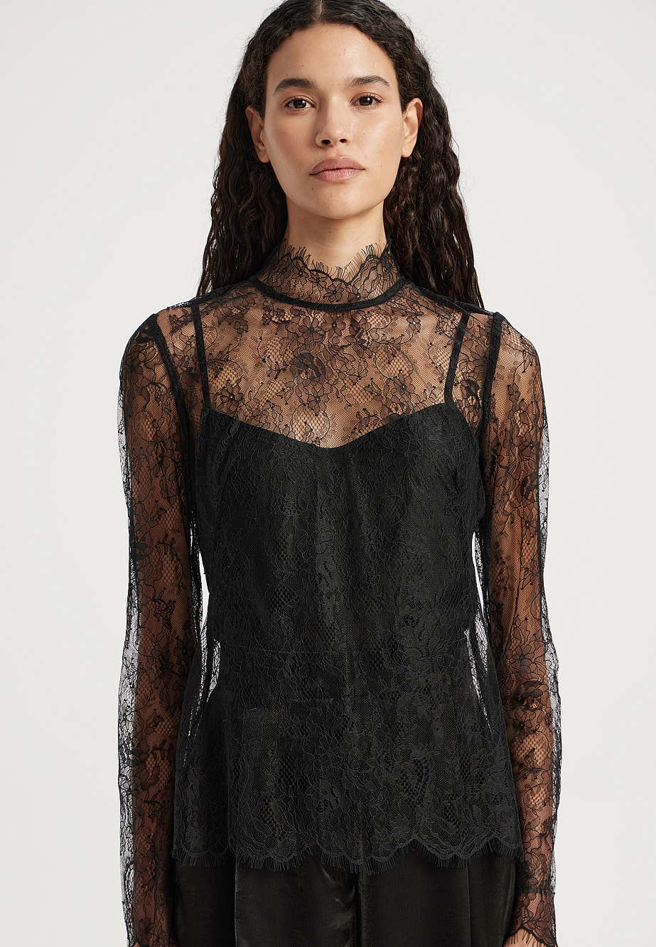 Элегантный лонгслив из тонкого кружева, украшенный фестонами по краю воротника-стойки. Полуприлегающий силуэт подчеркивает фигуру, сохраняя утонченность, а потайная молния на спинке обеспечивает идеальную посадку. В комплекте: топ-подкладка из нежного тенселя.