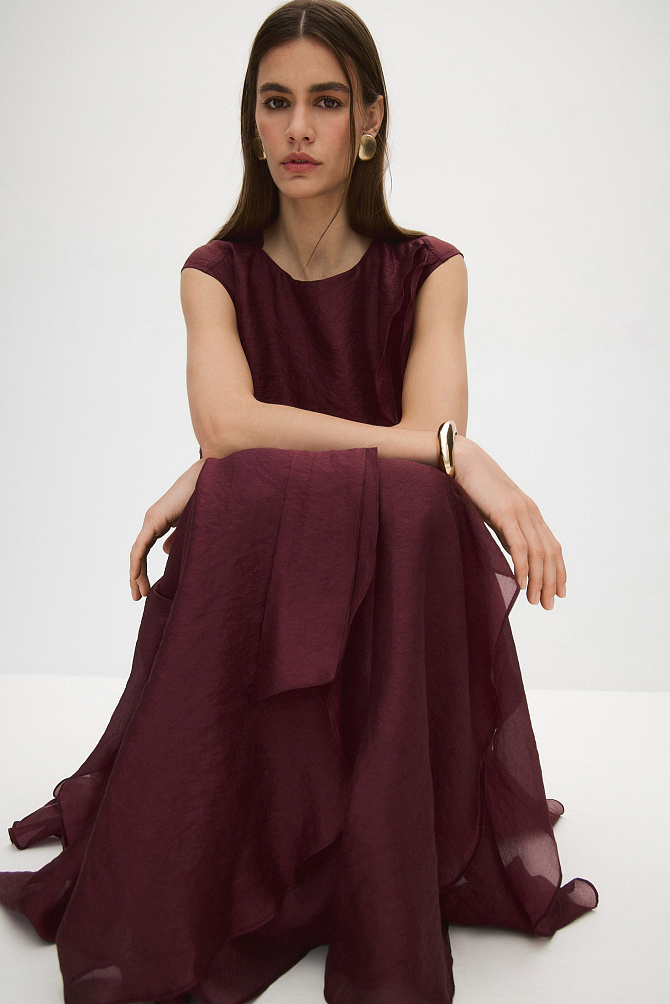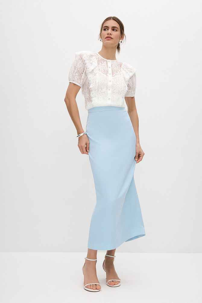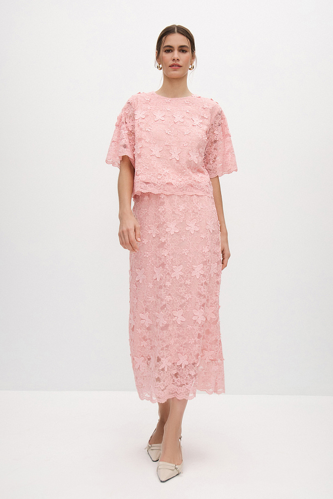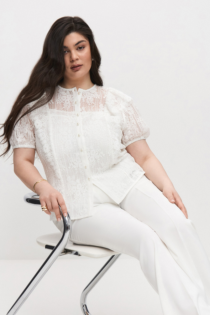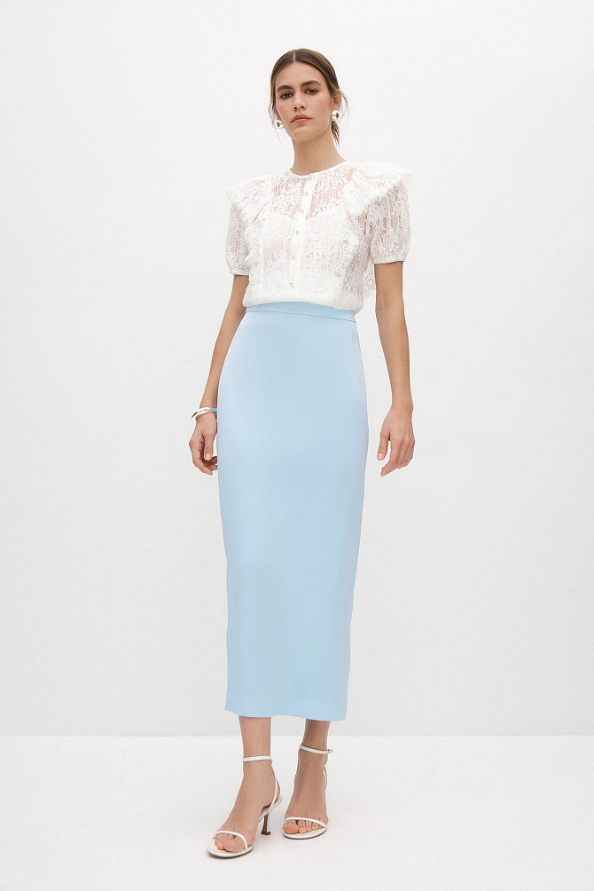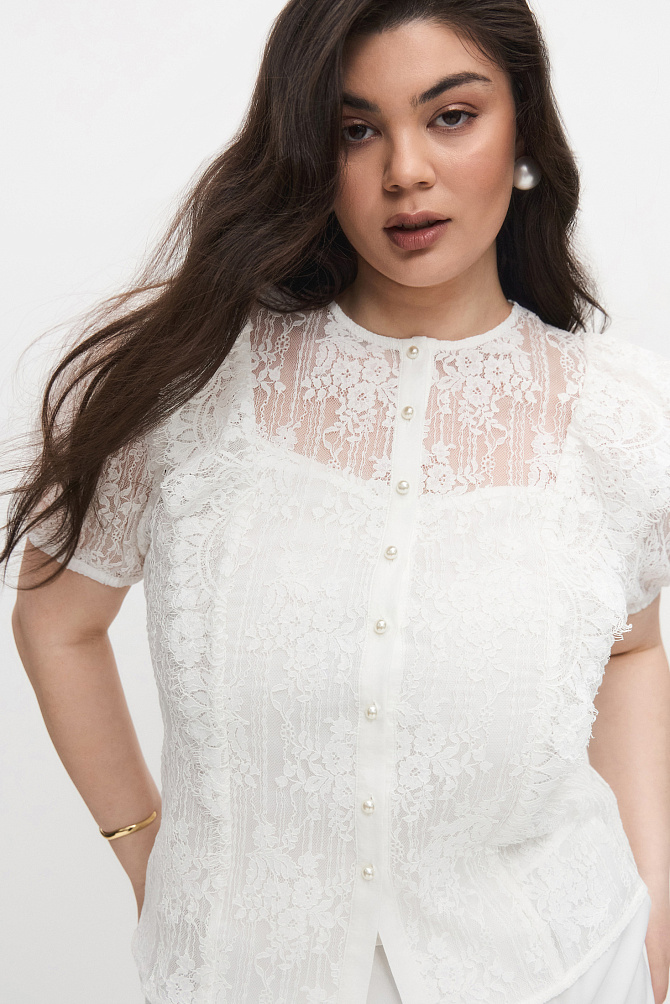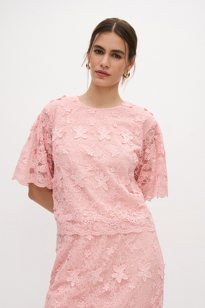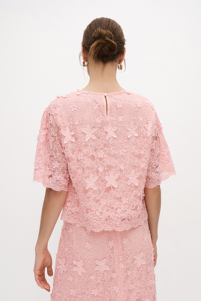 Элегантный лонгслив из тонкого кружева, украшенный фестонами по краю воротника-стойки. Полуприлегающий силуэт подчеркивает фигуру, сохраняя утонченность, а потайная молния на спинке обеспечивает идеальную посадку. В комплекте: топ-подкладка из нежного тенселя.