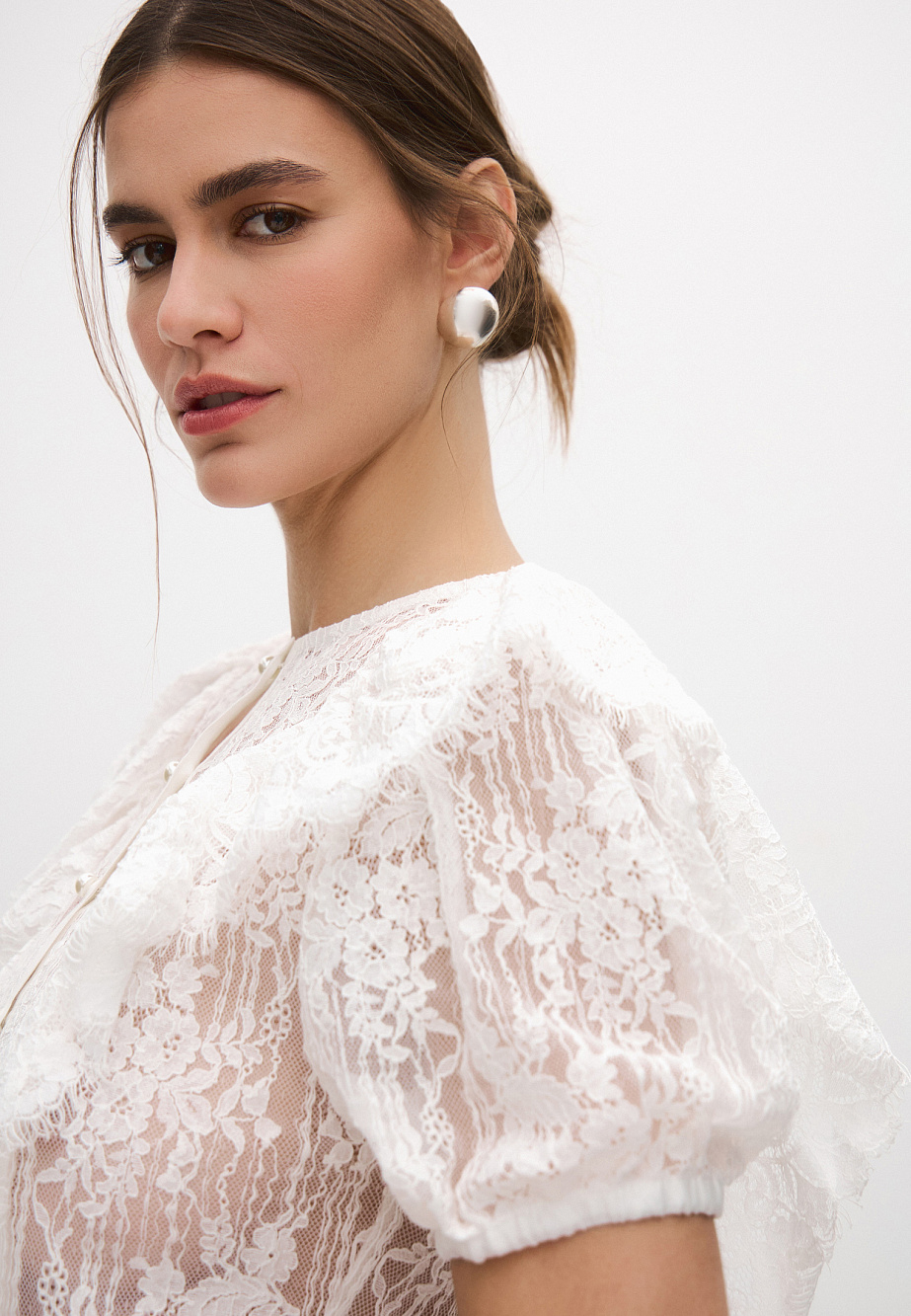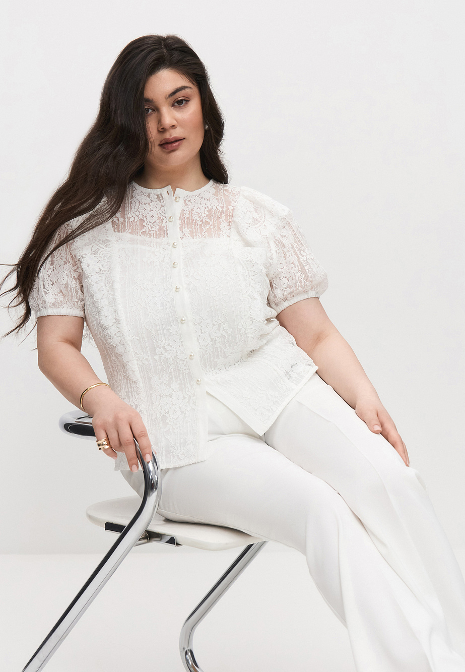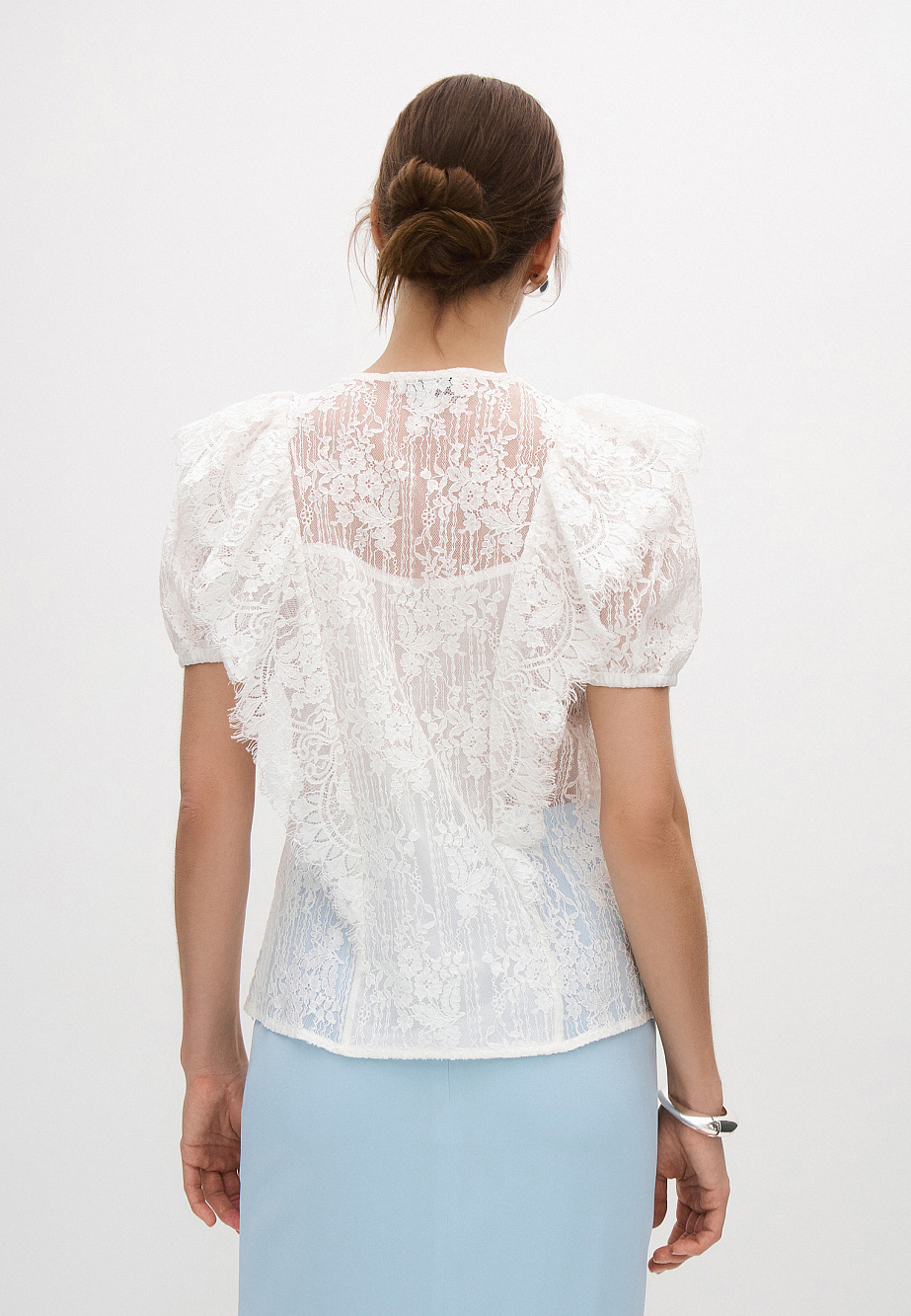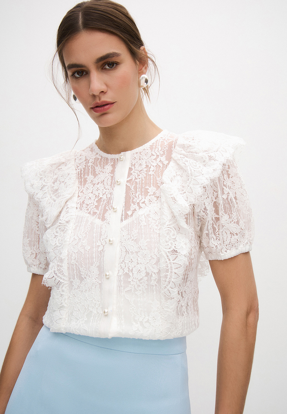 Изысканная блуза из нежного кружева с хлопком украсит любой образ и подойдет для различных случаев. Объемные рукава на резинке и кружевные воланы с фестонами придают модели шарм и легкость. Даже с прямой классической юбкой из текущей коллекции образ получится выразительным.