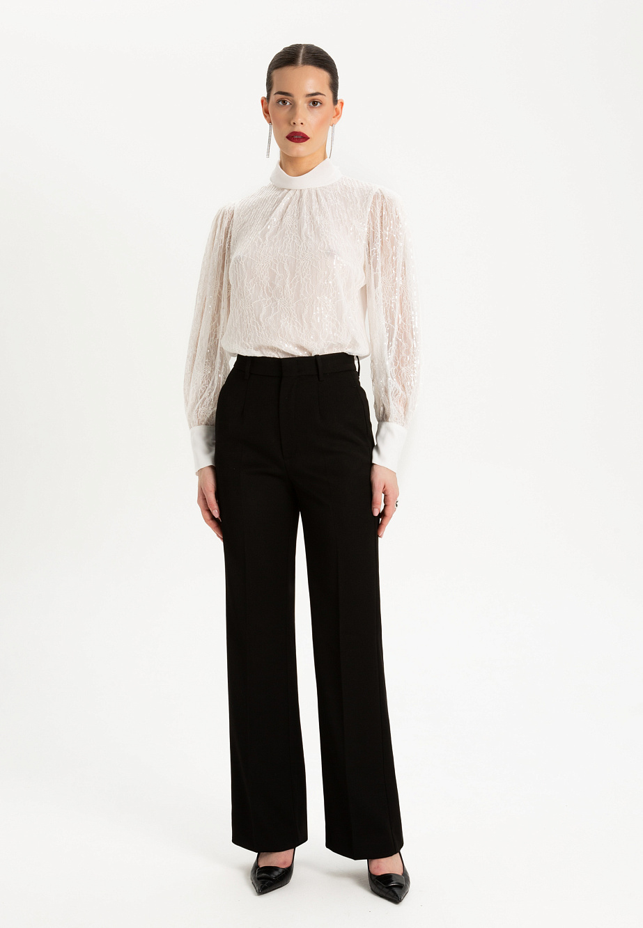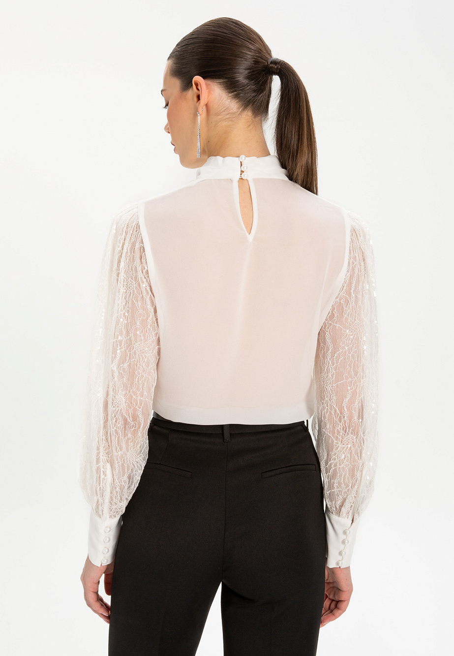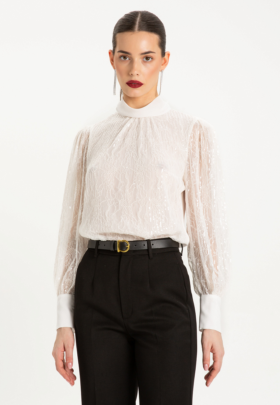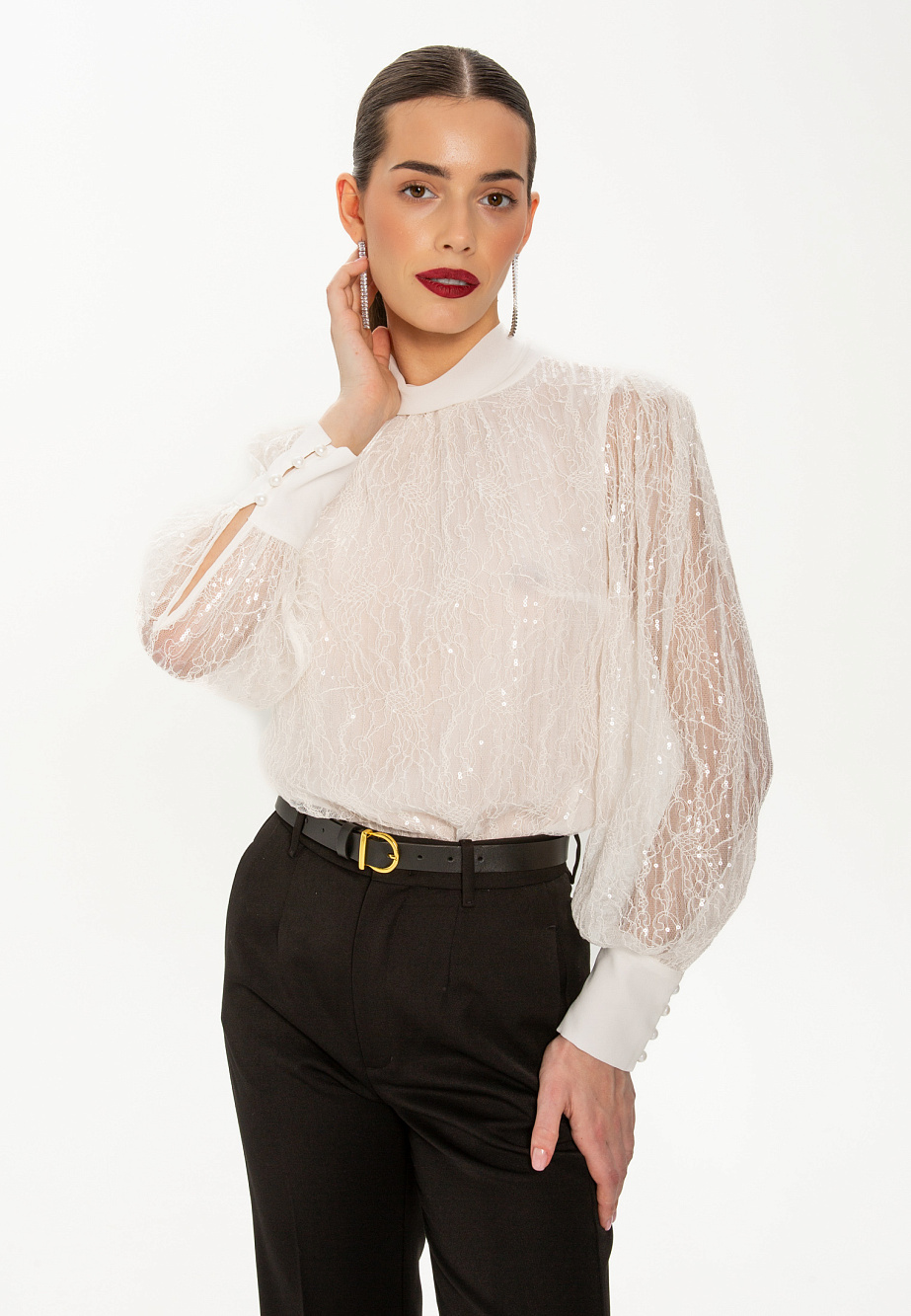 Эффектная блуза с мягкой стойкой и высокими манжетами выполнена из двух тканей- деликатного кружева с прозрачными пайетками и шифона. Такая комбинация роскошной фактуры кружева спереди и и полупрозрачной однотонной спинкой придает загадочность образу и интересный нетривиальный прием. Такая блуза в вашем гардеробе поможет создать необычный нарядный образ в сочетании с базовыми низами и подарит ощущение легкости и романтичности.