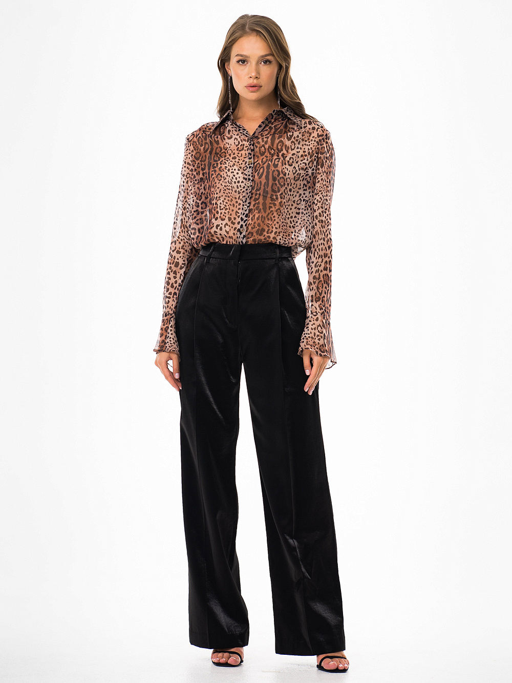 Блузка с рубашечным воротником в анималистичном принте замечательно дополнит многие образы и станет украшением осенне- зимнего гардероба. Прозрачность и невесомость шифоновой ткани подчеркнута эффектным принтом и свободным силуэтом. Блузка дополнена чехлом из вискозной ткани на регулируемых бретелях. Легкость и актуальность блузки придает роскошный волан по низу рукава и выверенные пропорции.