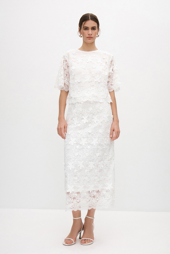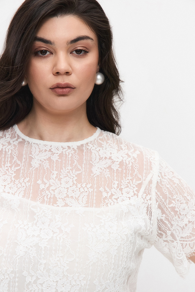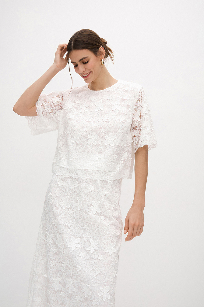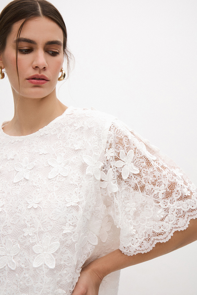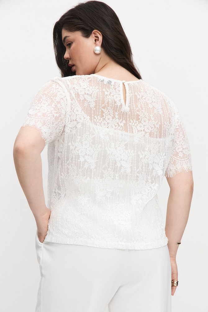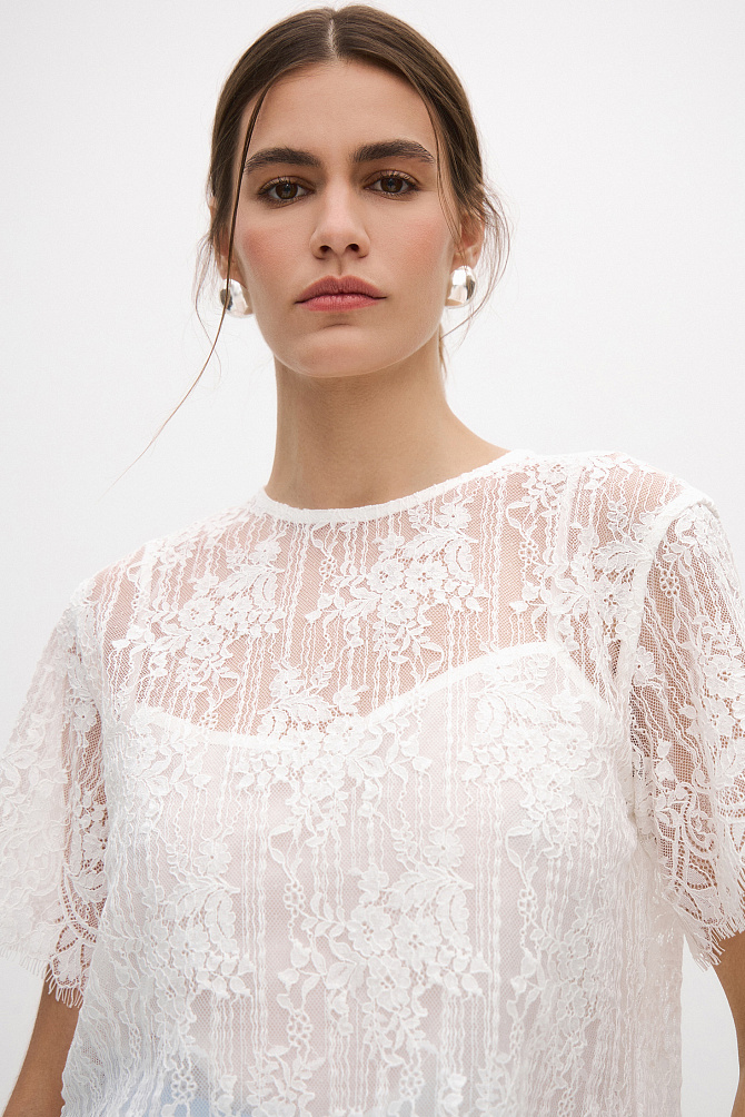 Блузка из хлопкового кружева с фестончатыми краями и декоративным жабо. Модель полуприлегающего силуэта с рукавами на резинке. Контрастная планка и воротник выполнены из гладкой ткани. В комплекте — топ на тонких бретелях из мягкого тенселя.