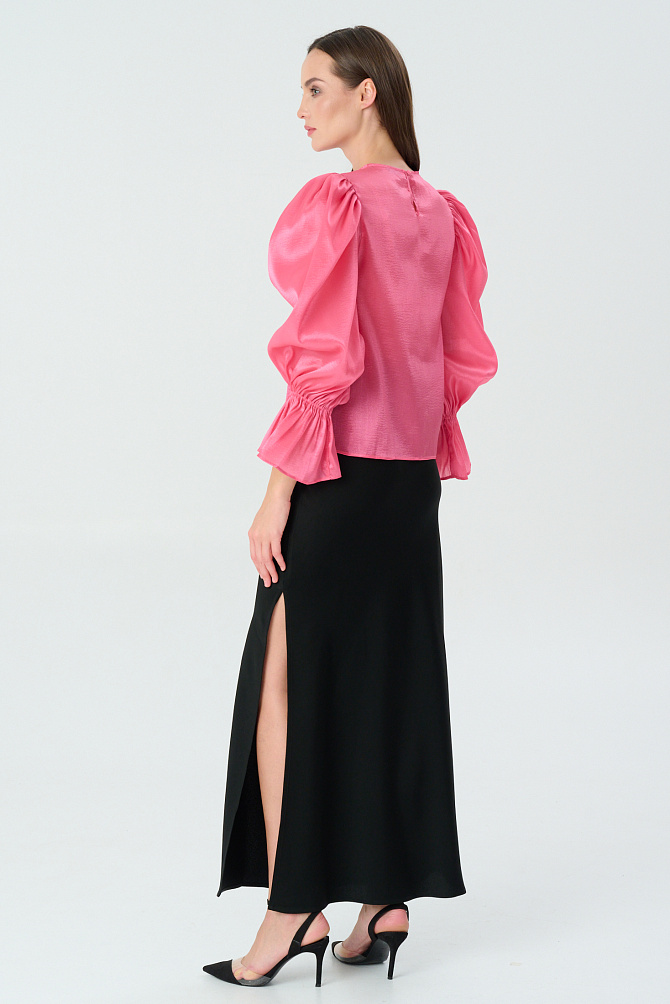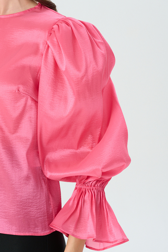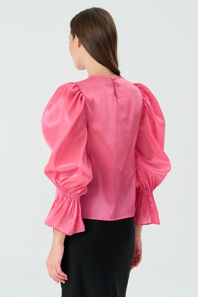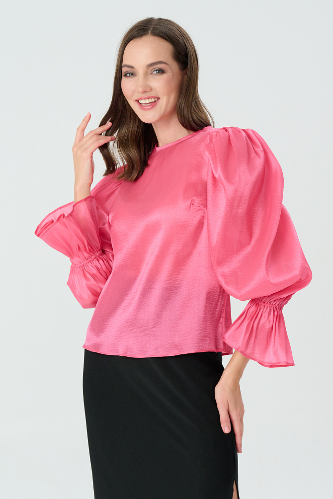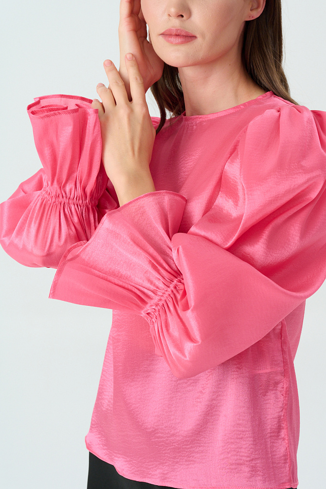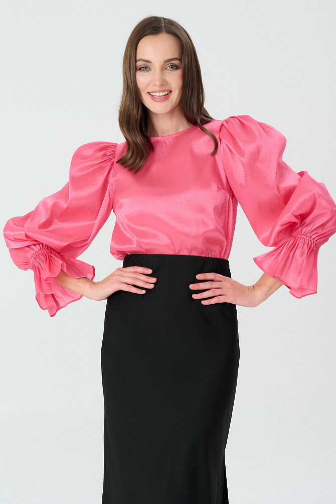 Блузка из хлопкового кружева с фестончатыми краями и декоративным жабо. Модель полуприлегающего силуэта с рукавами на резинке. Контрастная планка и воротник выполнены из гладкой ткани. В комплекте — топ на тонких бретелях из мягкого тенселя.