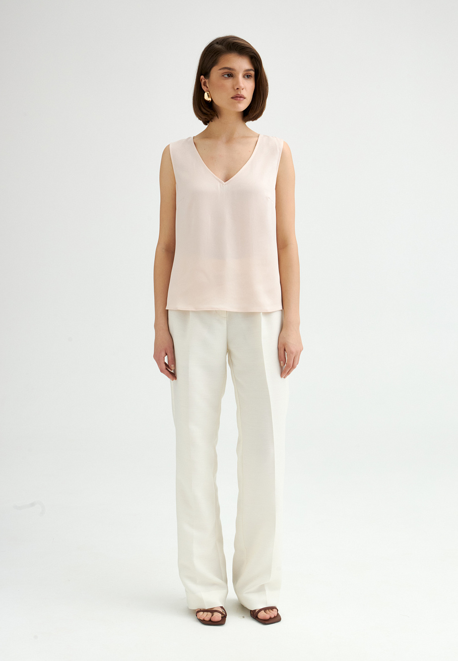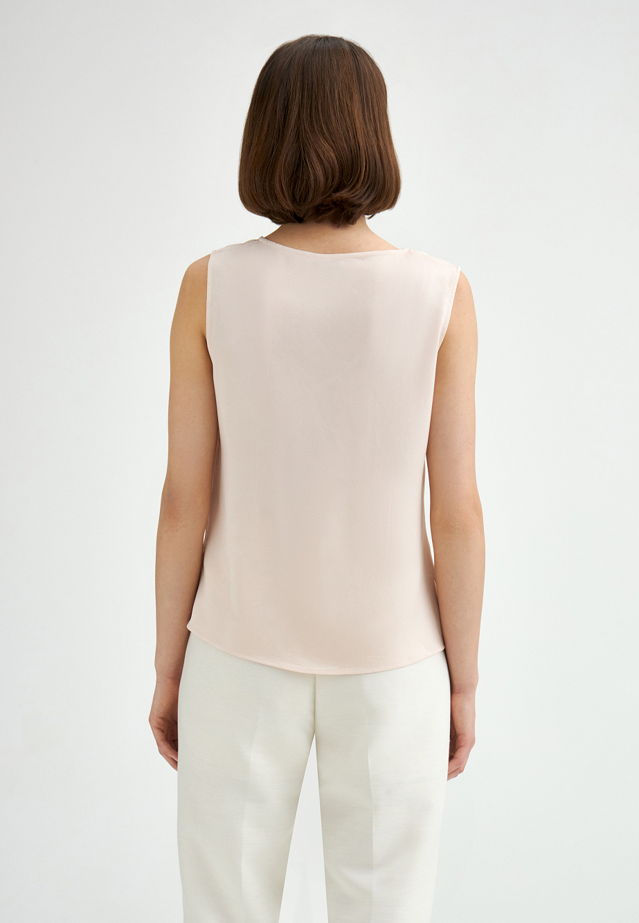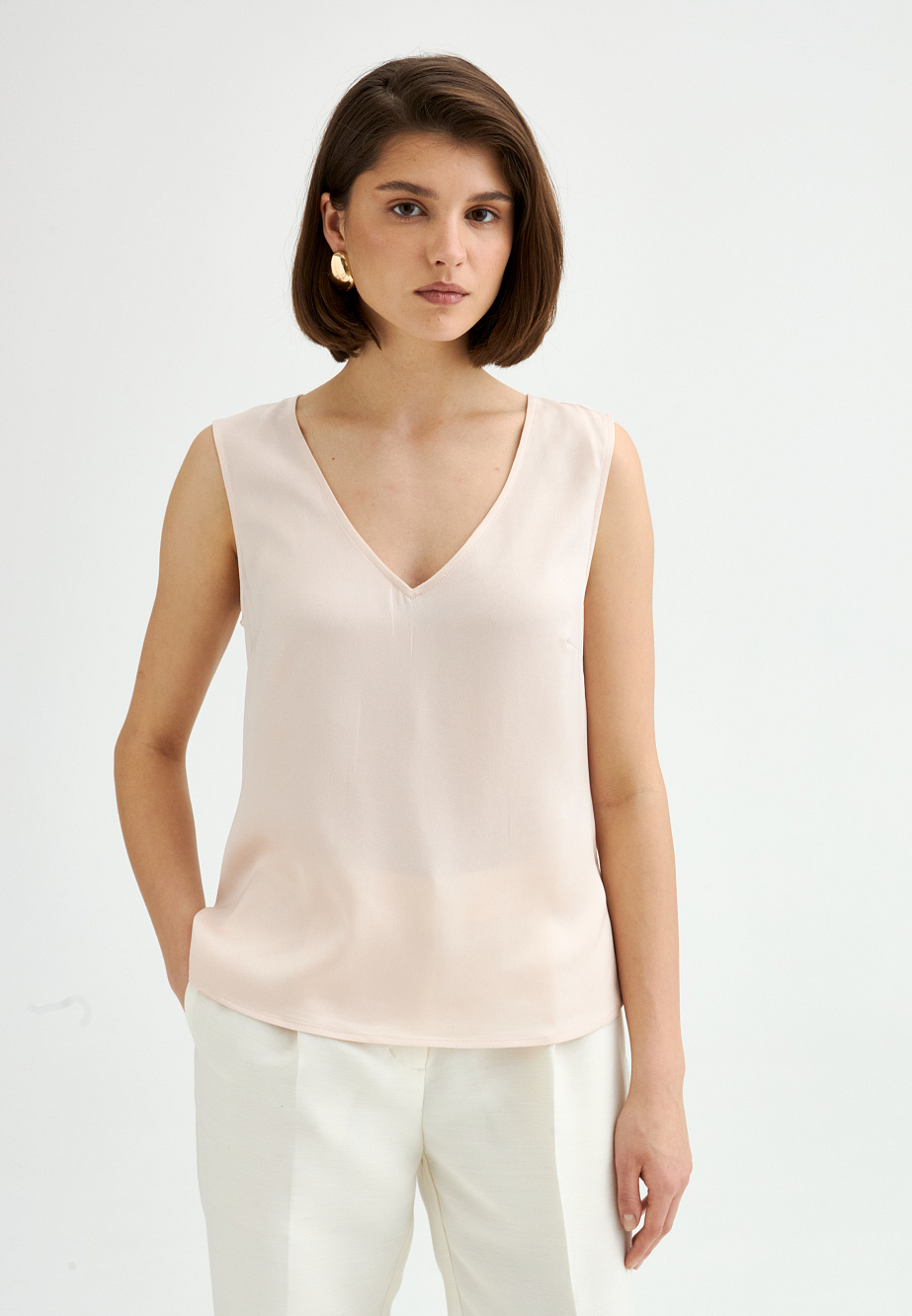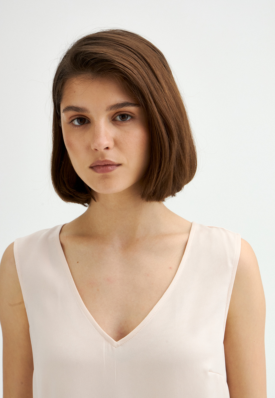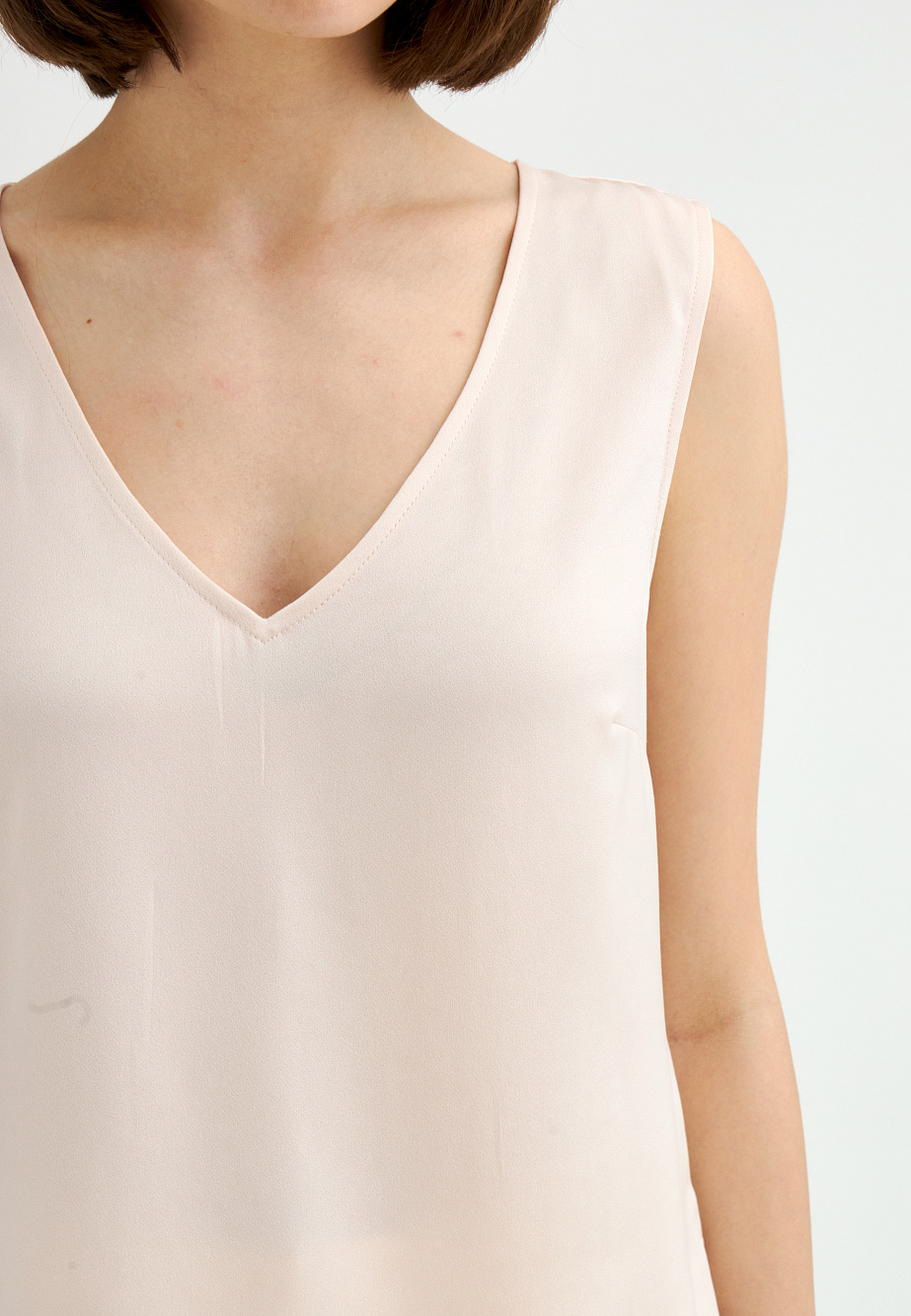 Базовый топ из ацетатного сатина с матовым финишем, подходящий для самостоятельного ношения или многослойных образов. Смесовый состав материала обеспечивает благородный блеск, несминаемость и комфорт. Модель с V-образным вырезом, свободным силуэтом и разрезами по бокам. Ацетат — эластичное волокно, по внешнему виду напоминающее натуральный шелк, с превосходными свойствами по сравнению с вискозой.