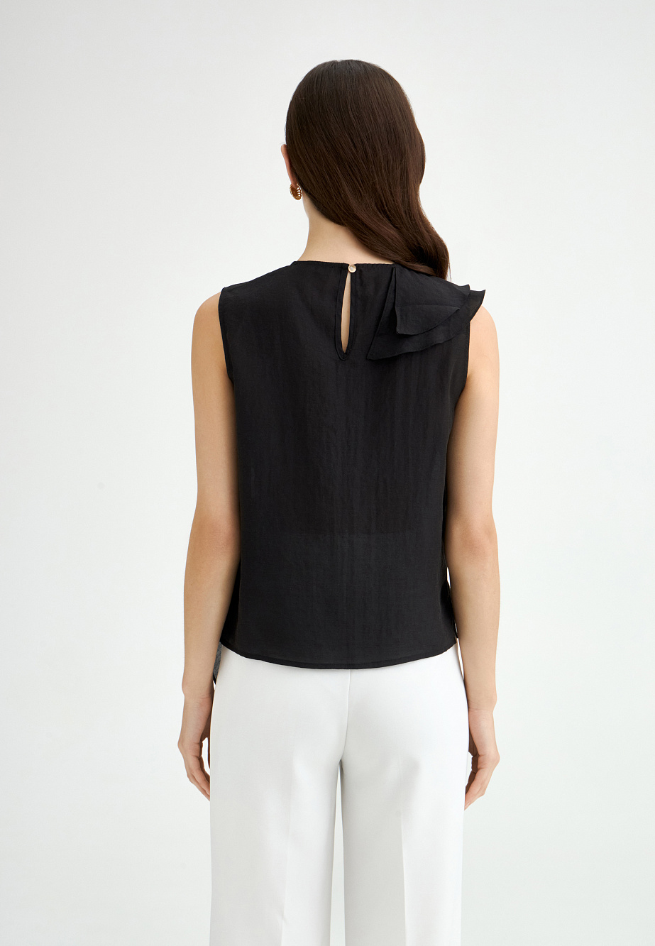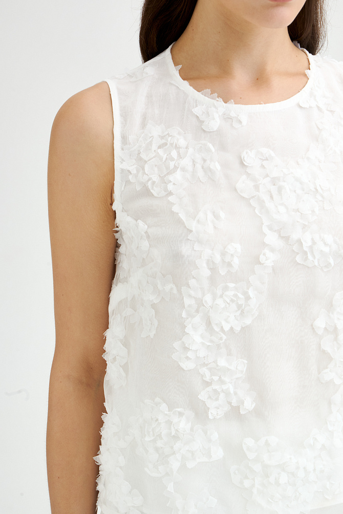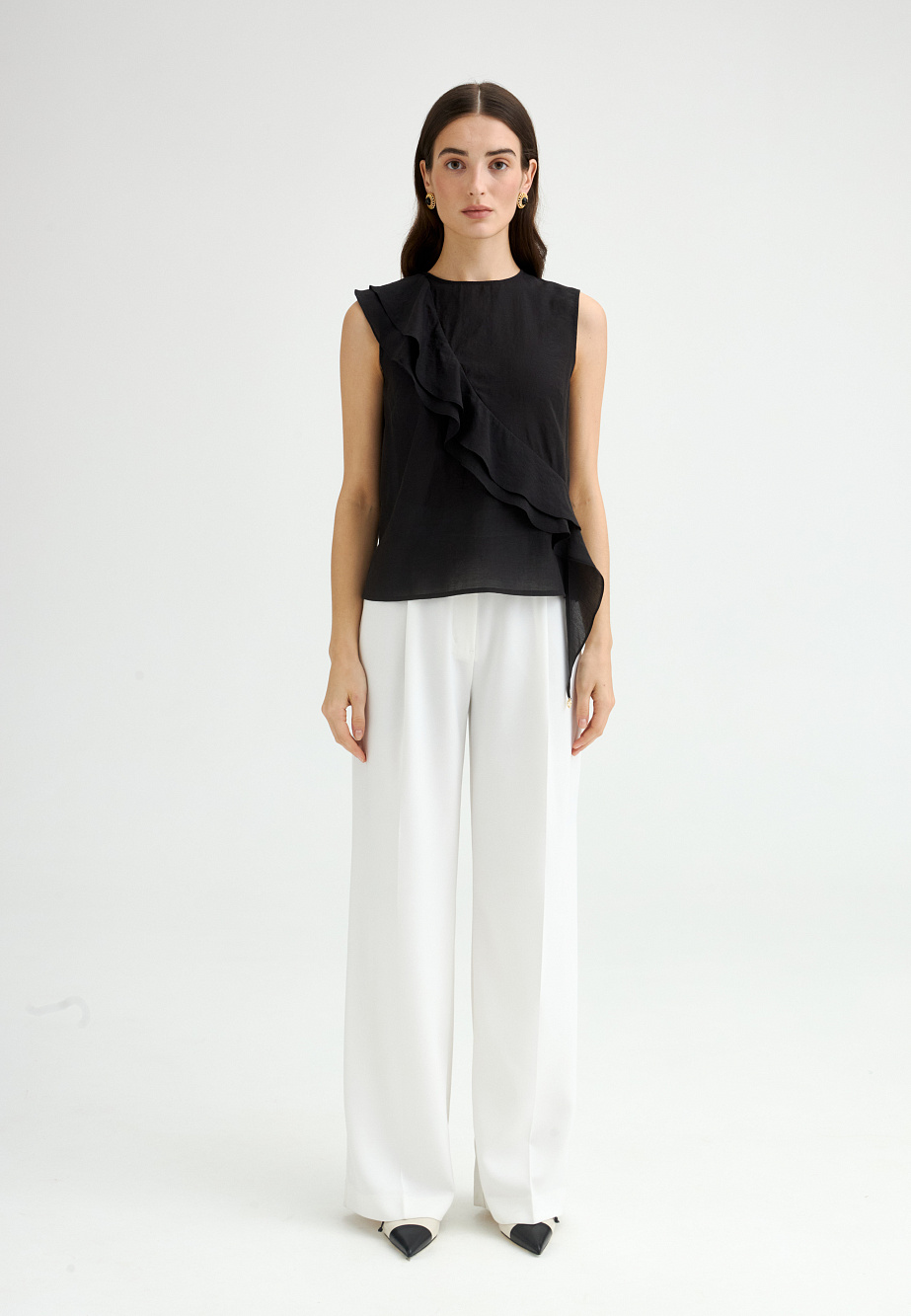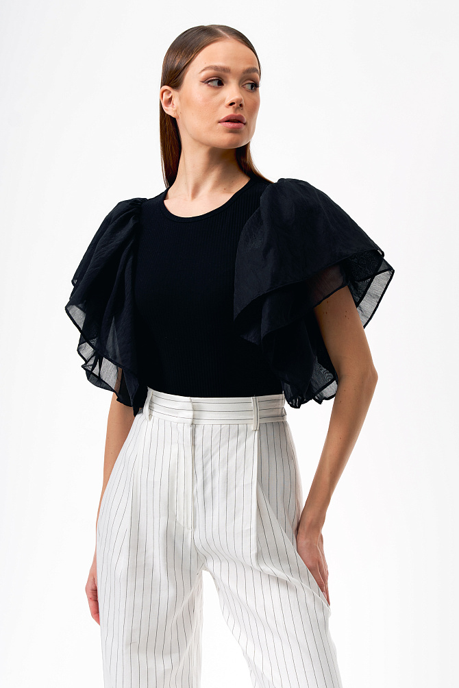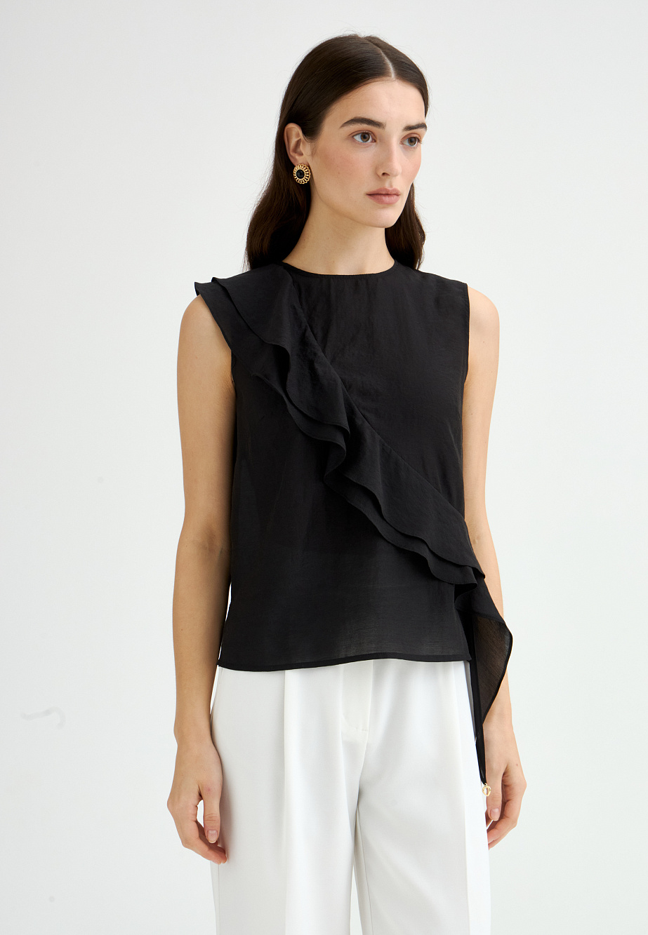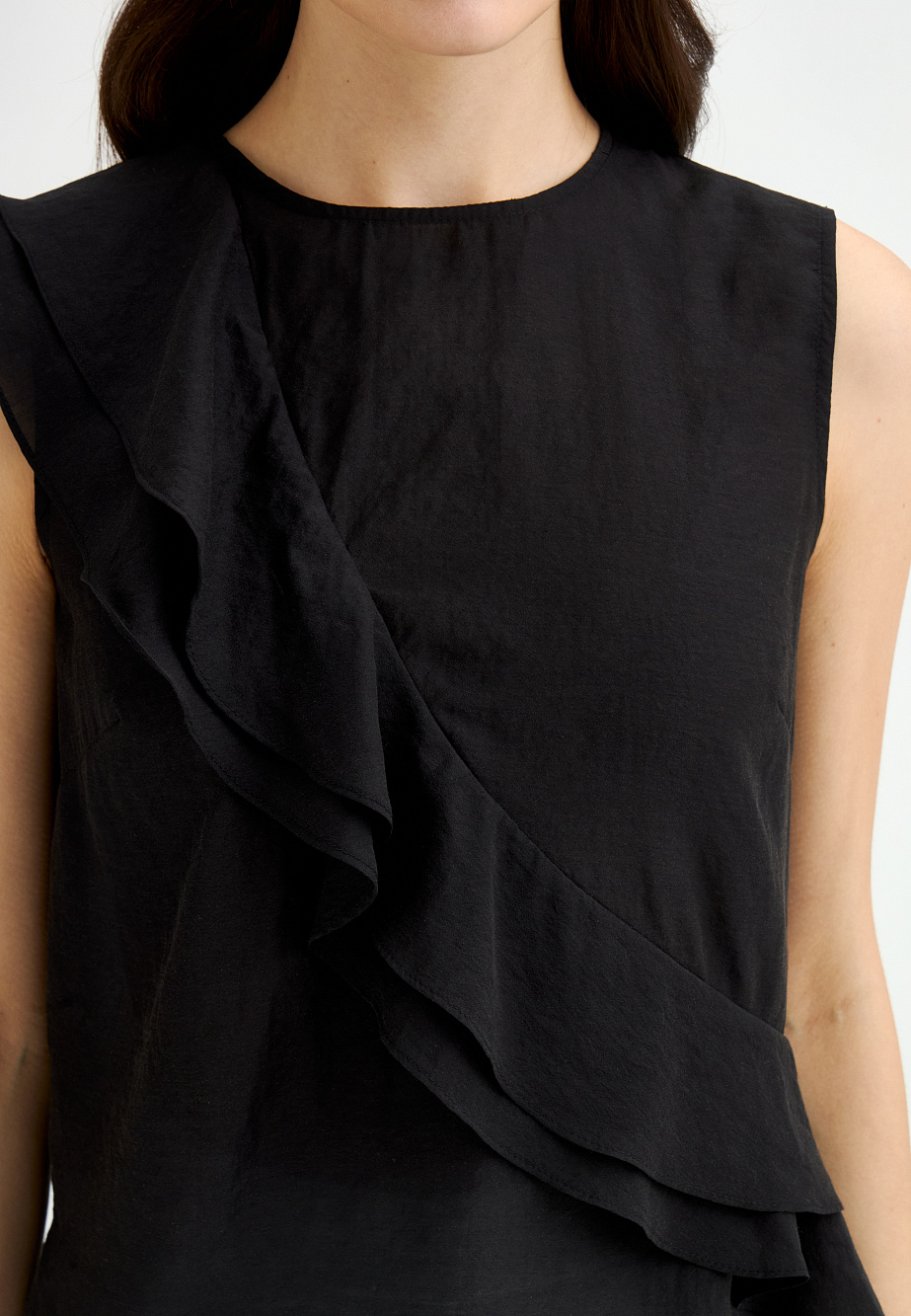 Эффектный топ из крепового шифона прямого силуэта с асимметрично расположенными воланами на полочке. Смесовый состав из района и ацетата делает ткань легкой, полупрозрачной и приятной на ощупь. Топ с застежкой на пуговицу на спинке, маленькими разрезами по бокам и круглым вырезом. Асимметричный край воланов оформлен фурнитурой в виде сердца.