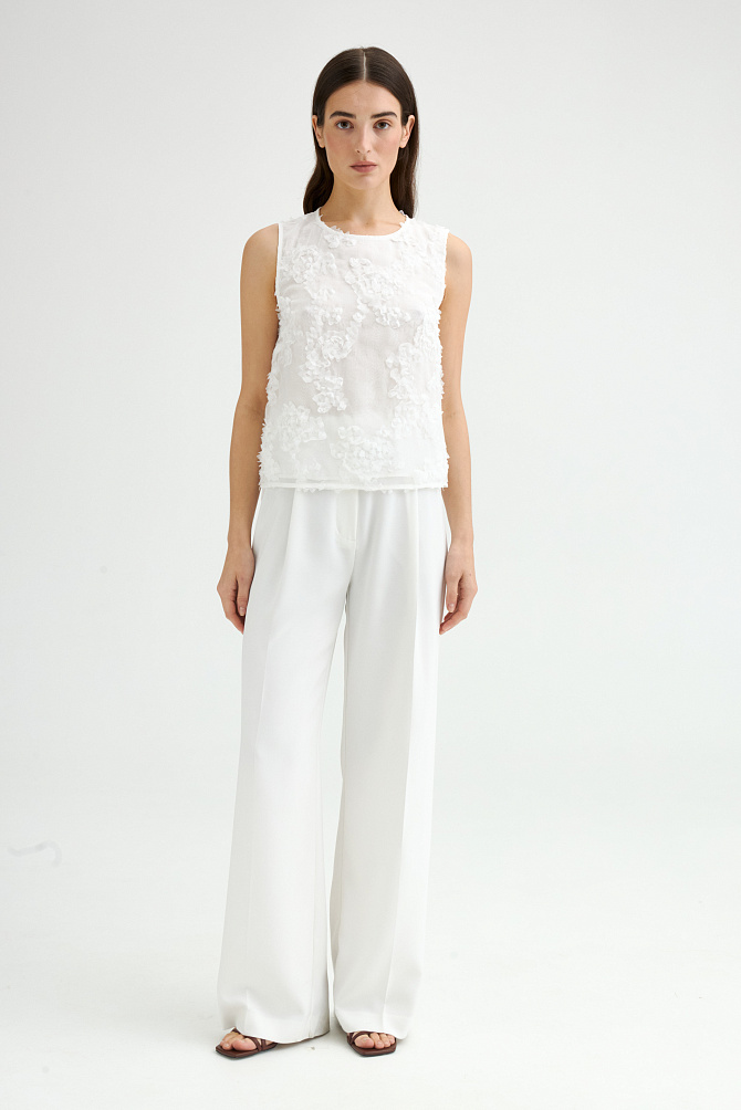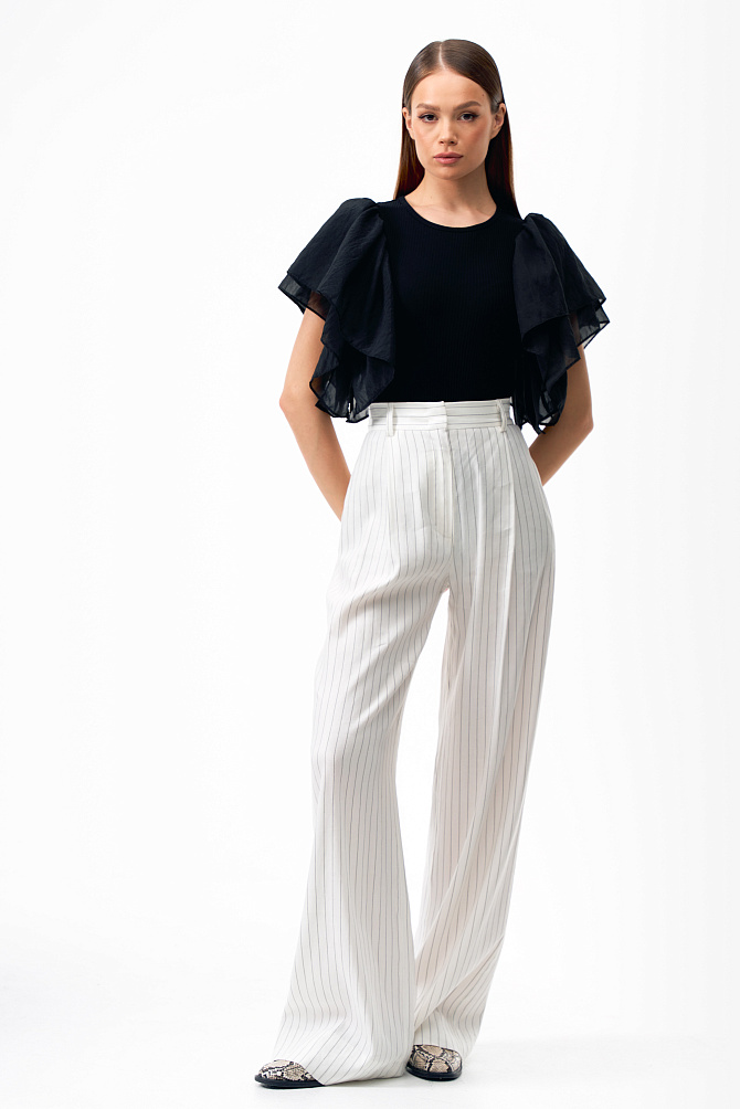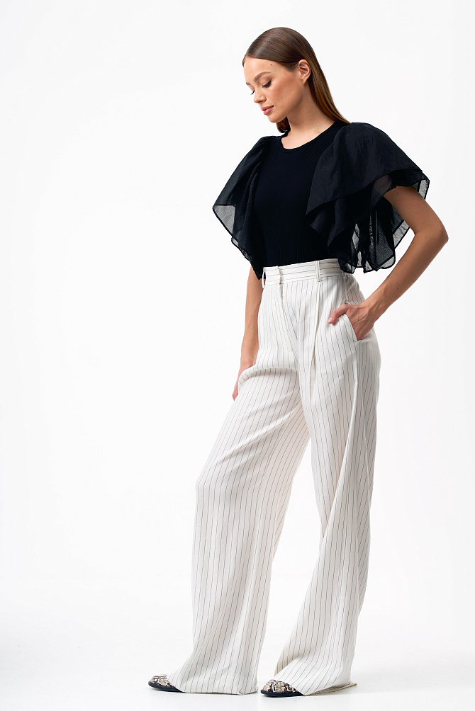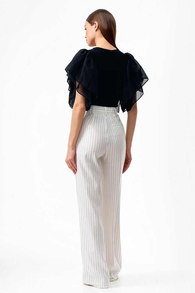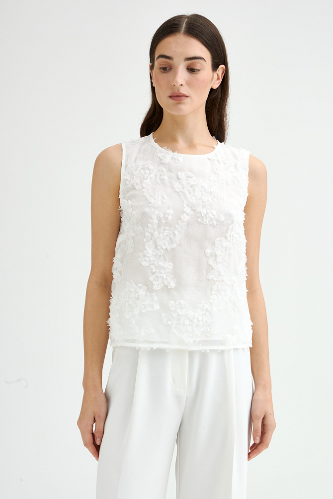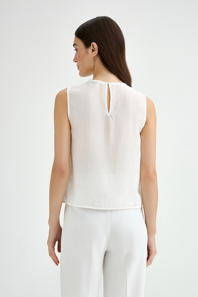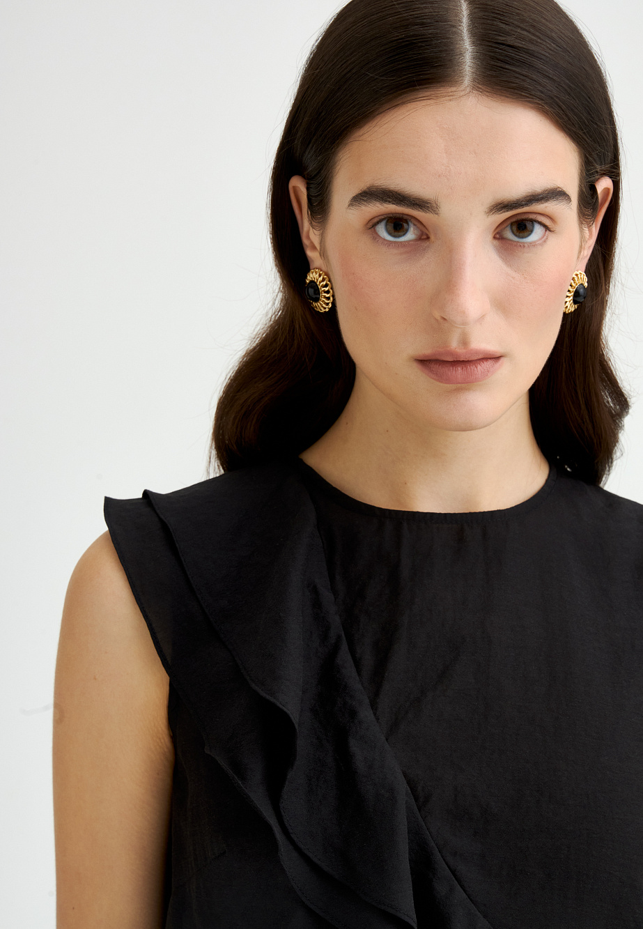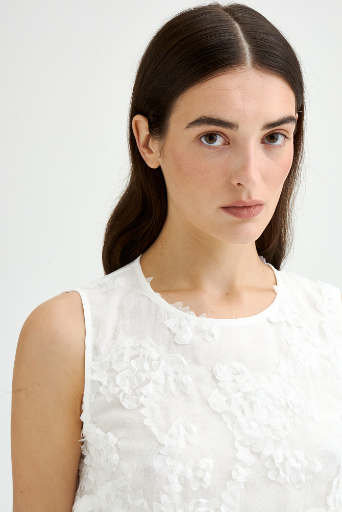 Эффектный топ из крепового шифона прямого силуэта с асимметрично расположенными воланами на полочке. Смесовый состав из района и ацетата делает ткань легкой, полупрозрачной и приятной на ощупь. Топ с застежкой на пуговицу на спинке, маленькими разрезами по бокам и круглым вырезом. Асимметричный край воланов оформлен фурнитурой в виде сердца.